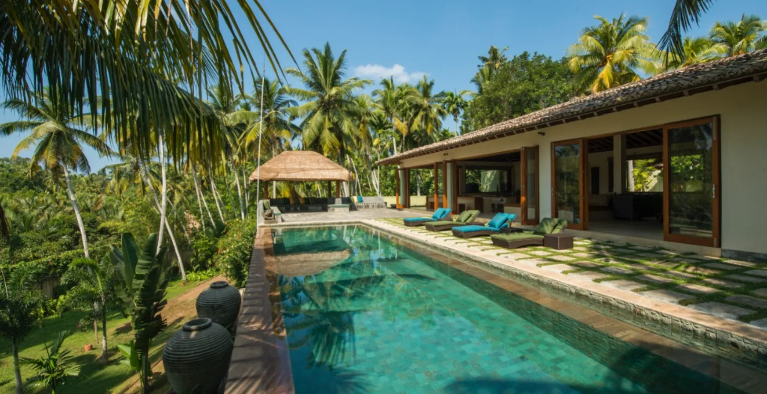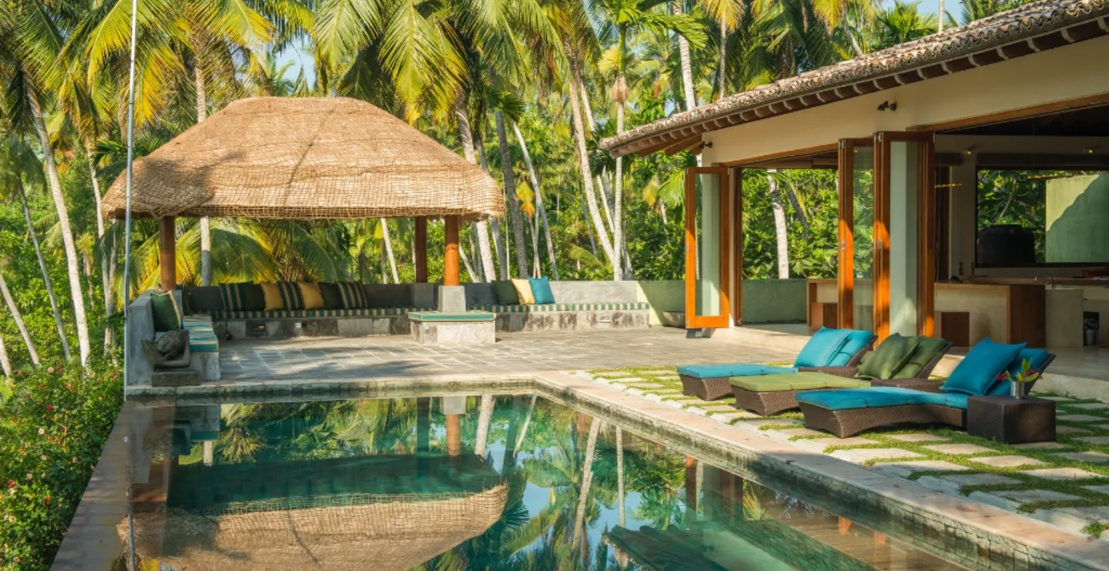The villa’s centerpiece is a large open-plan living pavilion that merges indoor luxury with outdoor tranquility. Comfortable lounging areas open up on one side to the shimmering saltwater infinity pool with stone-tiled deck and cushioned sun loungers, and on the other side to manicured lawns and tropical gardens. A shaded pergola with antique fan and built-in seating offers the perfect nook for a midday siesta or sunset drink. The dining pavilion, located just steps away, features a 12-foot handcrafted table, ideal for group dining under the stars.