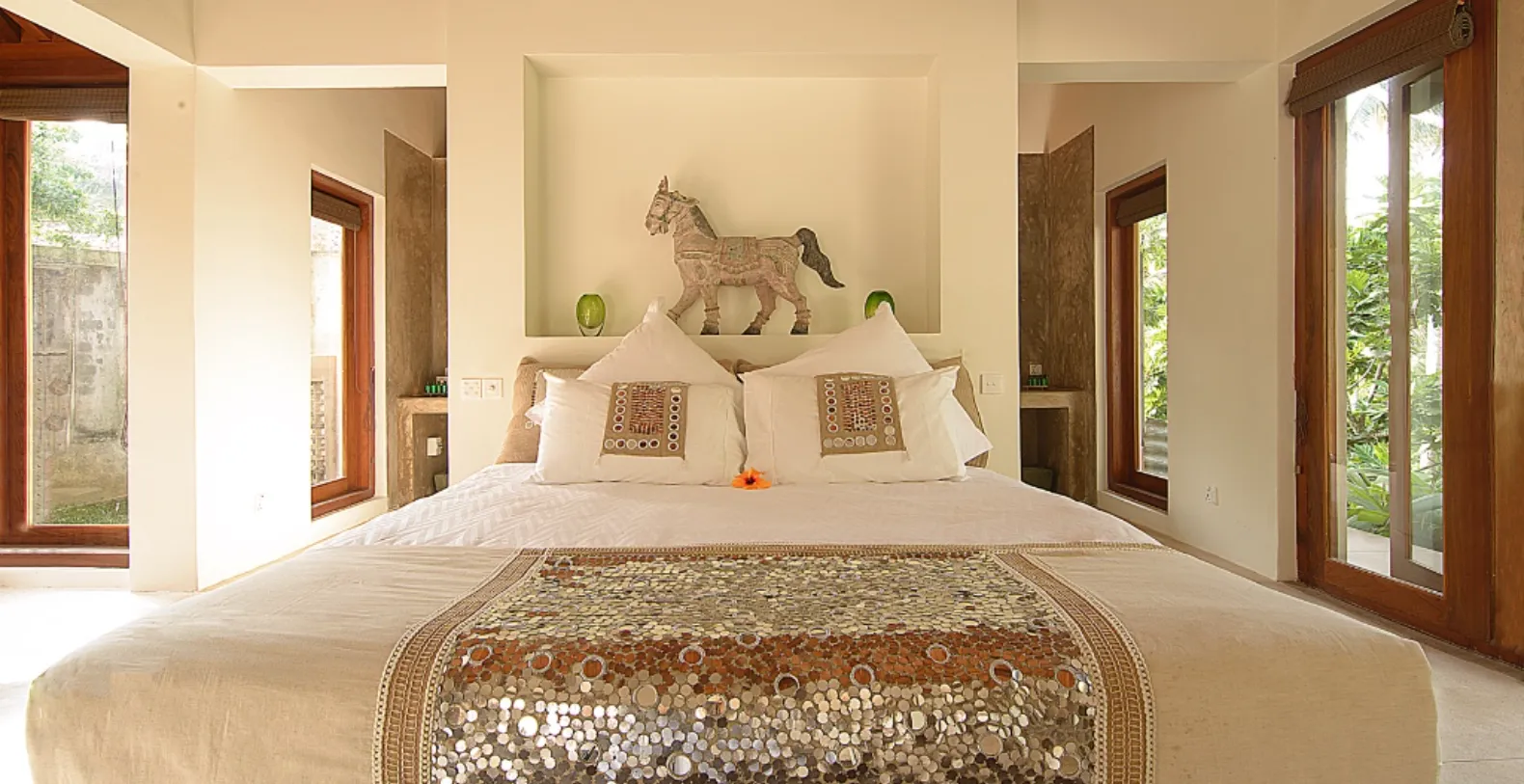 Each of the three king-size bedroom suites is housed in its own private pavilion with a walled garden, ensuring maximum privacy. All suites feature indoor/outdoor ensuite bathrooms, lush garden views, and spacious terraces perfect for morning coffee or quiet reading. Two of the bedrooms can also accommodate an extra fold-out bed for children, making the villa family-friendly. Villa Kumara is fully serviced to ensure a seamless stay, and guests booking through Dream Exotic Rentals will enjoy the support of a dedicated concierge to assist with pre-arrival planning from the moment of booking.