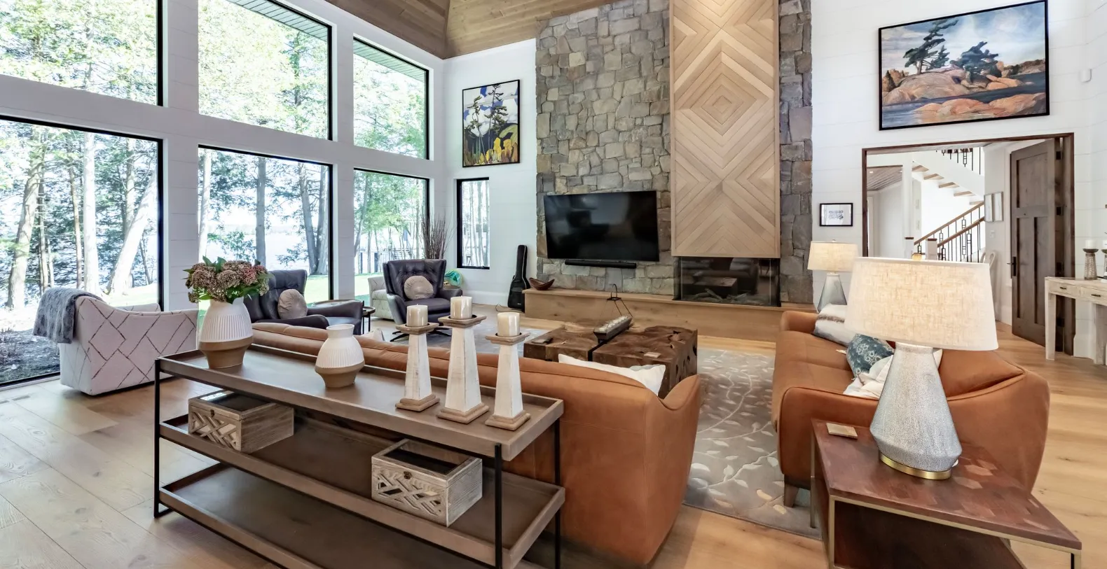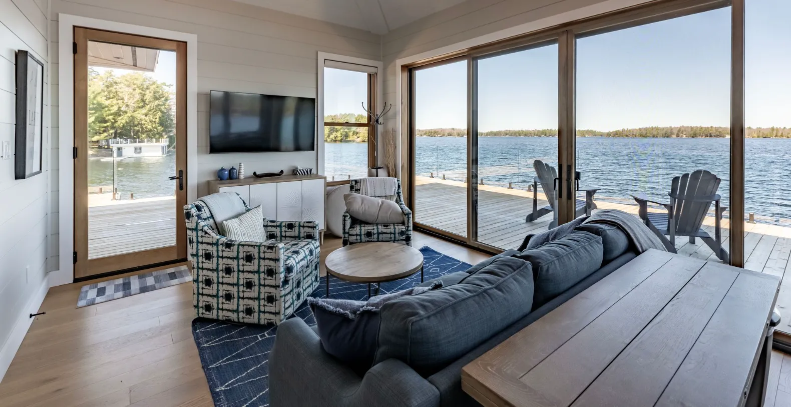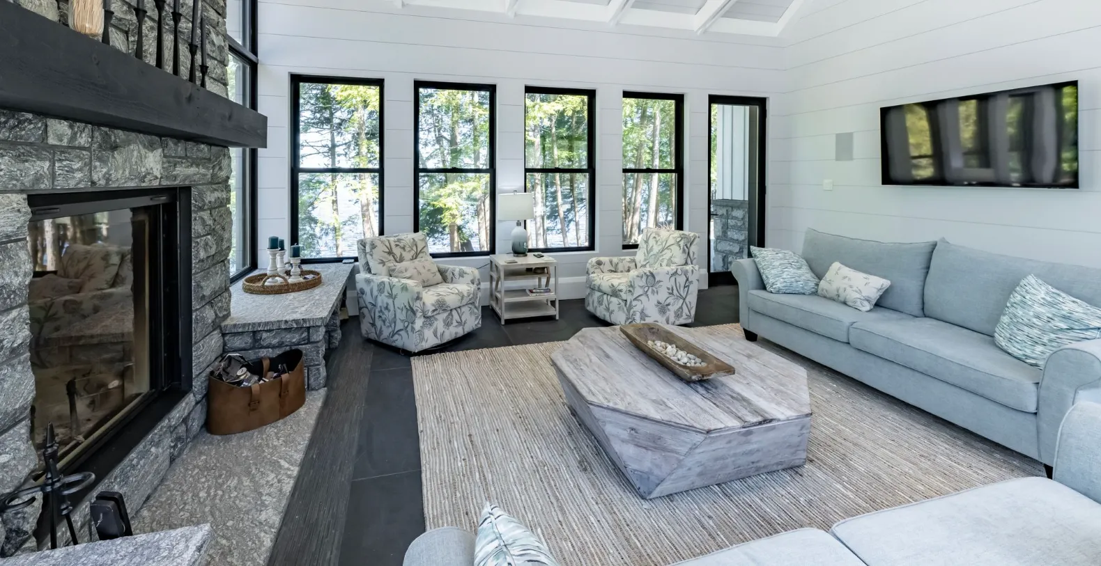 Natural wood finishes, vaulted ceilings, and expansive windows bring the beauty of the outdoors inside the cottage. The centerpiece of the home is the Great room with floor-to-ceiling windows, a gas fireplace, and plush seating - the perfect spot to gather after a day on the water. Next to the great room is the dining room - stylish and spacious, with a walkout to a patio for alfresco dining overlooking the lake. An additional Muskoka room is also available offering panoramic views of the water, cozy furnishings, and a wood-burning fireplace.
