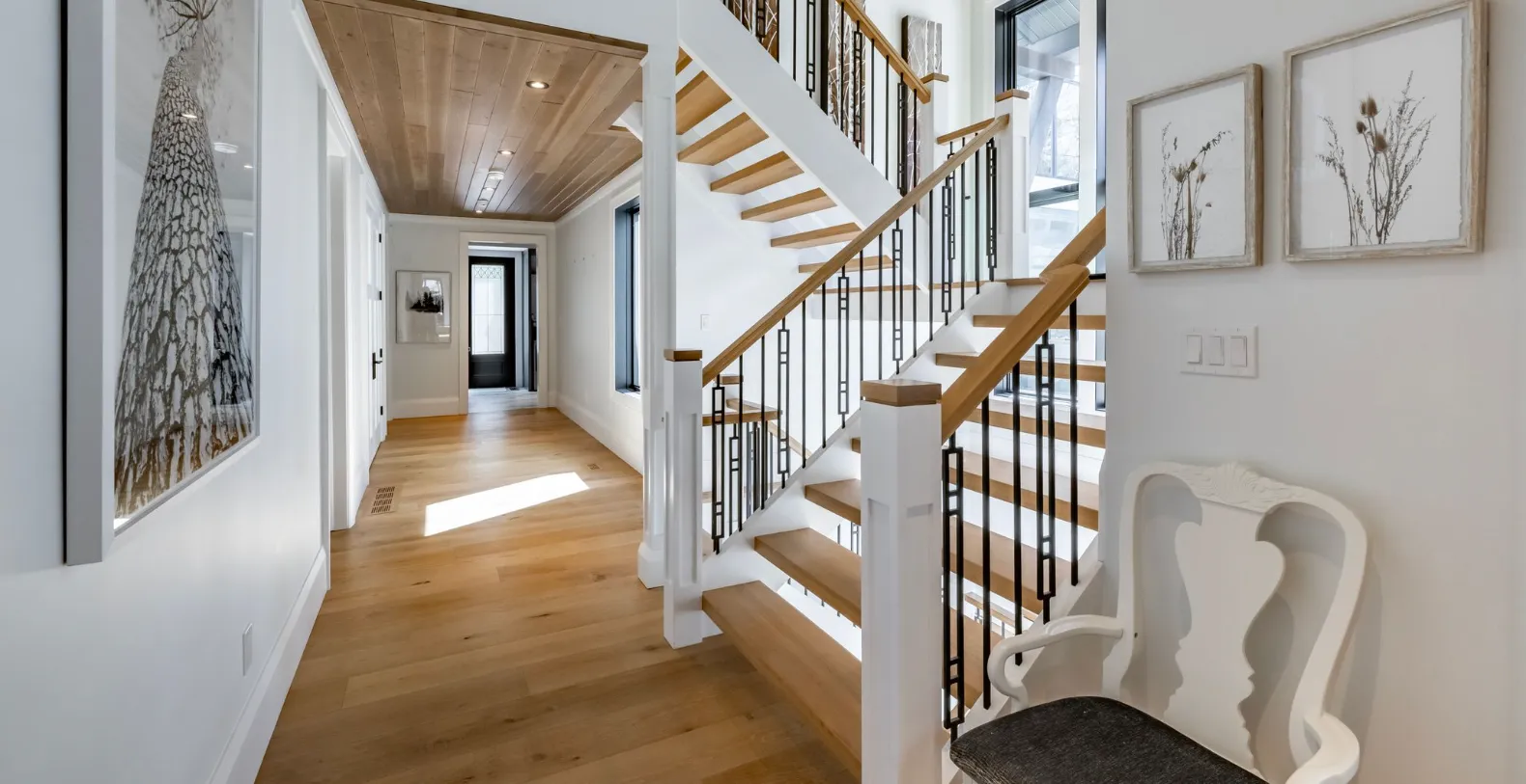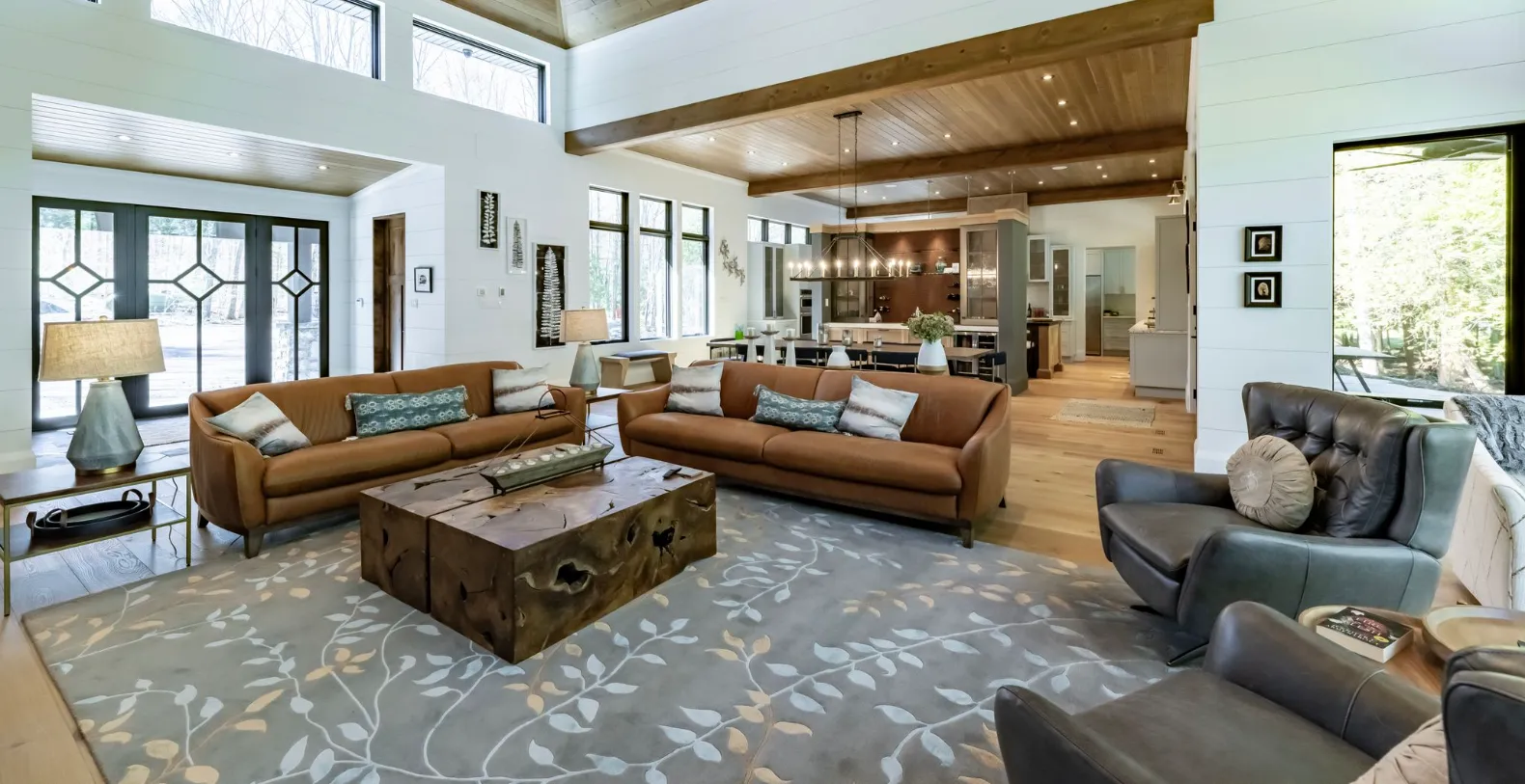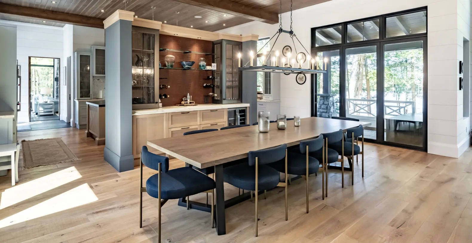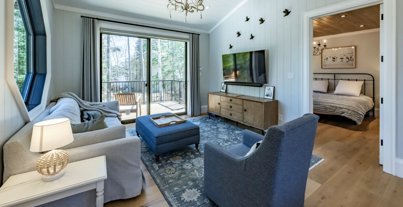 Natural wood finishes, vaulted ceilings, and expansive windows bring the beauty of the outdoors inside the cottage. The centerpiece of the home is the Great room with floor-to-ceiling windows, a gas fireplace, and plush seating - the perfect spot to gather after a day on the water. Next to the great room is the dining room - stylish and spacious, with a walkout to a patio for alfresco dining overlooking the lake. An additional Muskoka room is also available offering panoramic views of the water, cozy furnishings, and a wood-burning fireplace.