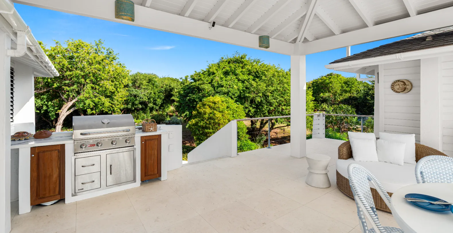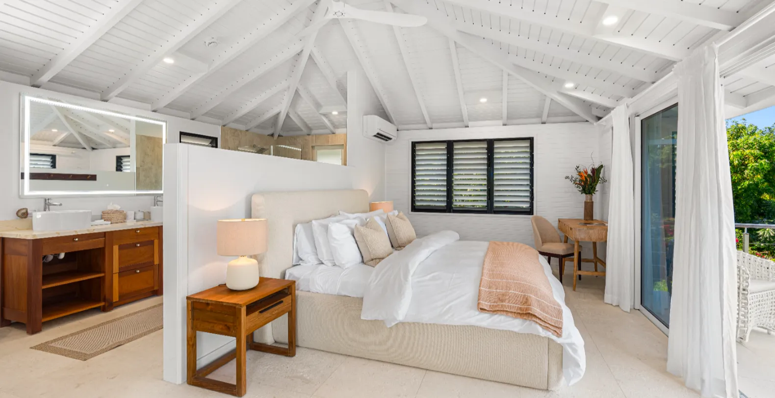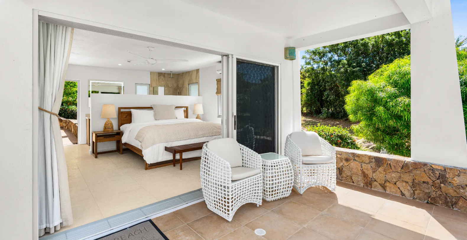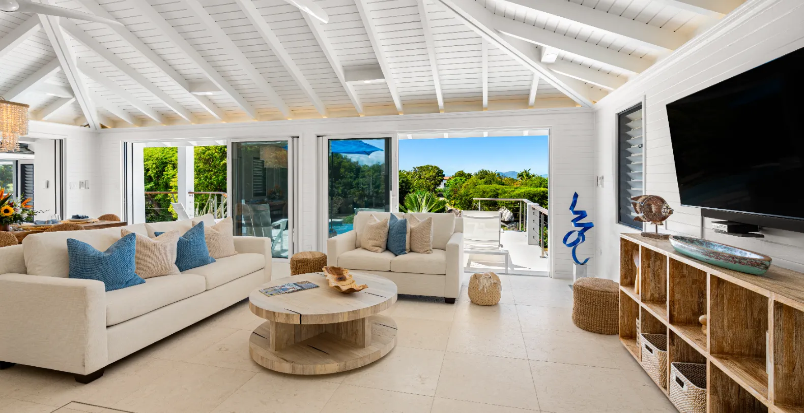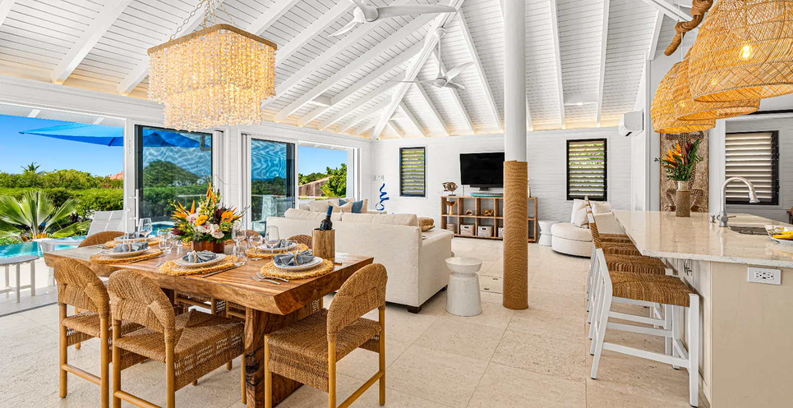 The villa’s upper level hosts the open-plan Great Room, which combines a stylish lounge, formal dining area, and gourmet kitchen. Vaulted ceilings with exposed beams and soft coastal tones create a bright, airy atmosphere. The kitchen is a culinary haven with a large center island, modern appliances, and everything needed to prepare a gourmet meal. Glass doors open to a spacious veranda with an outdoor dining table, custom-built barbecue area, and comfortable seating—ideal for entertaining family and friends while enjoying spectacular island sunsets. Guests will enjoy a private infinity pool, multiple outdoor lounges and dine areas as well as endless landscaped grounds.