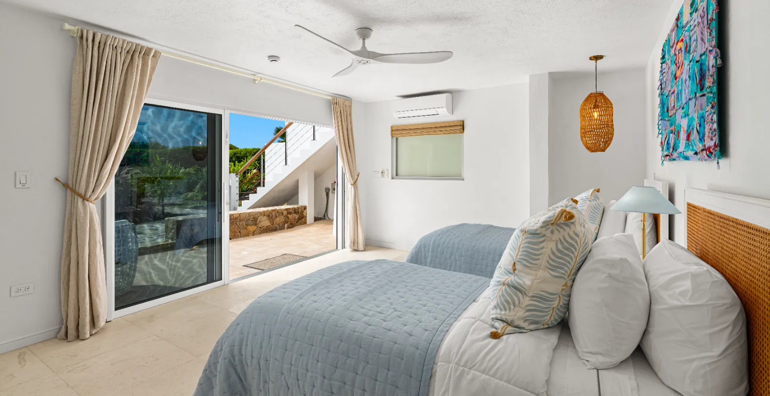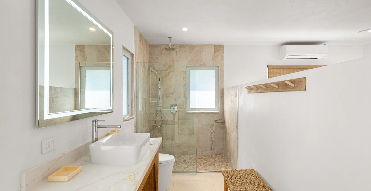 Designed for up to 7 guests, Beso del Sol features three elegant ensuite bedrooms (could also be rented as one and two-bedroom property), all equipped with spacious walk-in showers with teak vanities. The master suite is located on the upper level, adjacent to the Great Room. It features a king-size bed, a beautifully tiled walk-in shower, double teak vanity, ceiling fan, air conditioning, a safe, and private balcony access where guests can stargaze in total privacy. The two guest suites are located on the lower level: one with a king-size bed and the other with two twin beds and a day bed, ideal for families or friends traveling together.