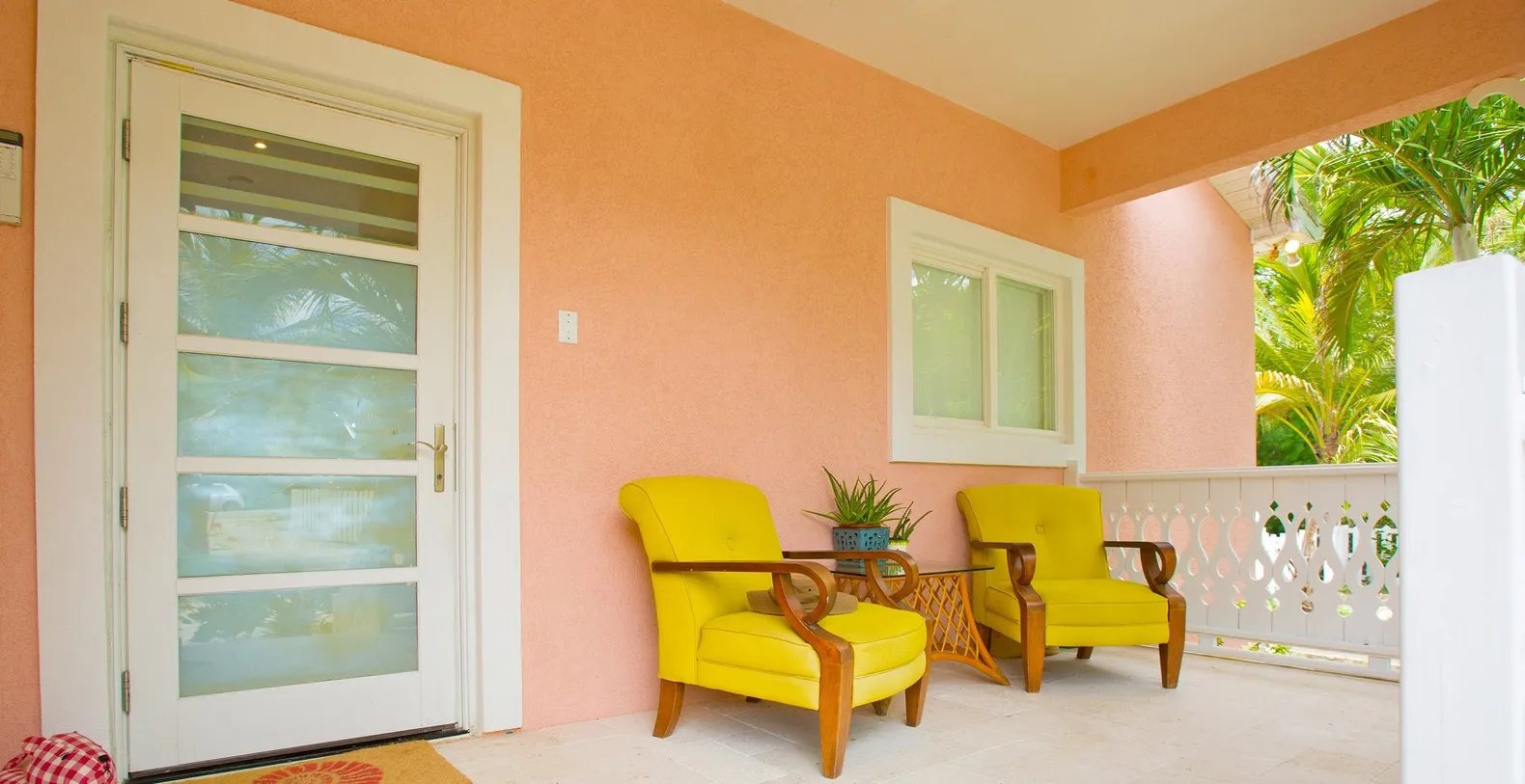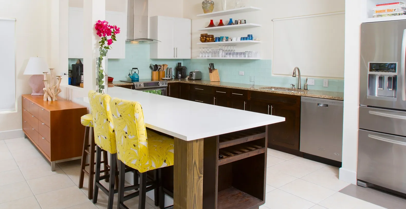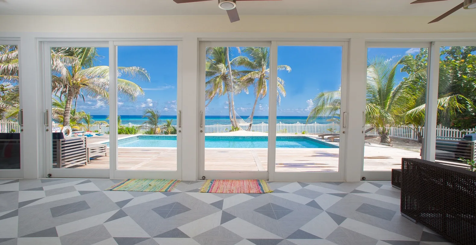 The Primary Suite on lower-level features king bed, ocean views, walk-out access to the sunroom, and ensuite with shower. Bedroom 1 on upper-level offers king bed, ocean views, and shares hall bathroom equipped with a shower bath. Bedroom 2 on upper-level provides two twin beds convertible to king upon request, ocean views, and shares hall bathroom equipped with a shower bath. A full kitchen complete with modern appliances overlooks the dining area with seating for 6 while an outdoor dining table off the pool deck and under tall palm trees is also available. All cookware, glassware, cutlery, and flatware are provided for preparing island feasts. Babylon Reef's private well-landscaped lot includes a white picket fence, soft zoysia grass lawn, and a large sandy backyard around the pool.
