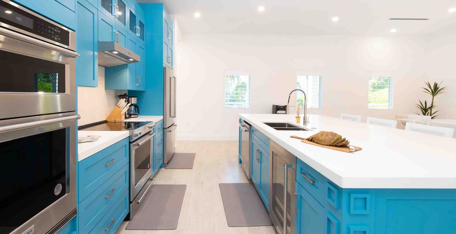 Step into the spacious living room where a comfy sectional sofa and large SmartTV create the perfect space to relax and unwind after a day of exploration. The gourmet kitchen, outfitted with modern appliances, a large island, and sleek quartz countertops, is perfect for preparing meals and gathering with loved ones. Adjacent to the high-end kitchen, the formal dining area comfortably seats 10+ guests. The screened porch also features an outdoor dining table seating 10 for alfresco meals during peaceful Cayman evenings.