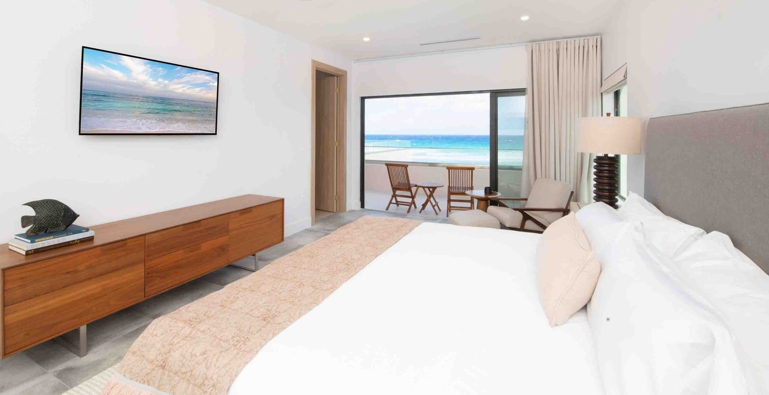 Halcyon Point boasts five spacious bedroom suites including four luxurious primary suites—an exceptional configuration ensuring maximum comfort. All bedrooms and ensuites feature captivating ocean views, with 4 bedrooms offering walk-out direct access to beach or shared balcony with stairs descending to beach and pool deck below. This thoughtful architectural design ensures every guest enjoys privacy, comfort, and convenience throughout their stay.