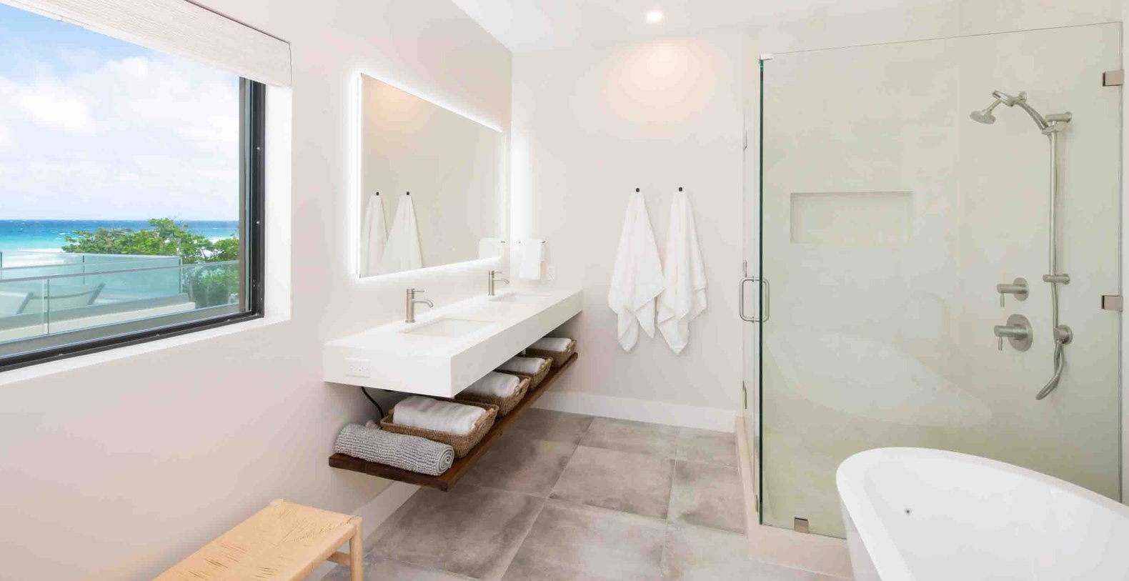 The sleeping arrangements accommodate up to 10 guests across beautifully appointed spaces. The first primary bedroom on the lower level features king bed, ocean views, walk-out access to beach or pool deck, and ensuite with shower. The second primary bedroom (lower-level) offers king bed, ocean views, walk-out access to beach or pool deck, and ensuite with shower. The lower-level third bedroom provides two XL twin beds (can be configured as king upon request), ocean view, television, and ensuite with shower. The third primary bedroom positioned on the upper level showcases king bed, ocean views, television, walk-out access to shared ocean balcony and tanning terrace, plus ensuite with dual vanity, soaking tub, and separate shower. The fourth primary bedroom (upper-level) features king bed, ocean views, television, walk-out access to shared ocean balcony and tanning terrace, and ensuite with dual vanity, soaking tub, and separate shower.