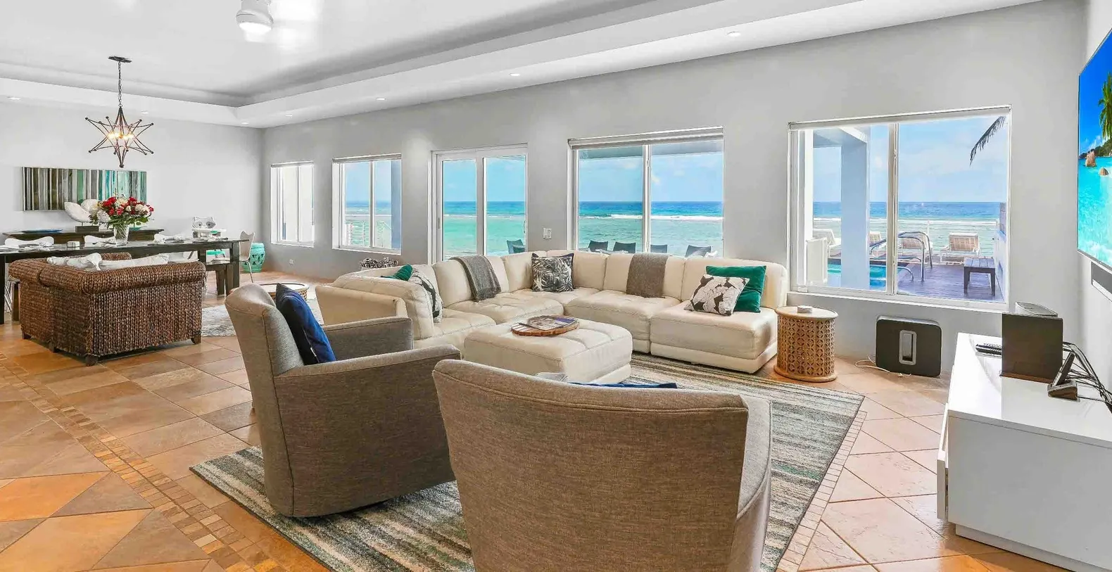 The spectacular pool area also showcases a raised sun deck elevated to capture unobstructed ocean vistas plus a redesigned outdoor cooking center complete with professional-grade propane grill outdoor pizza oven and dedicated prep area creating the perfect setup for hosting memorable alfresco gatherings. Inside the villa presents expansive light-filled living spaces adorned with contemporary tropical decor where a full wall of oceanfront windows frames panoramic water views seamlessly blending indoor and outdoor island living. The generous open-concept floor plan creates an inviting atmosphere for family gatherings whether you're sharing meals around the elegant dining table or enjoying competitive game nights in the comfortable living room. After full days exploring Grand Cayman's incredible attractions settle into the plush sectional sofa for movie marathons or gather everyone for traditional family board games. The formal indoor dining area comfortably seats 10 guests at the main table plus 2 additional seats at the kitchen counter while the spacious outdoor dining table accommodates 12 people offering magnificent ocean views under twinkling Caribbean stars creating magical evening dining experiences.