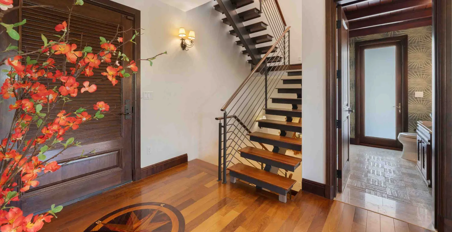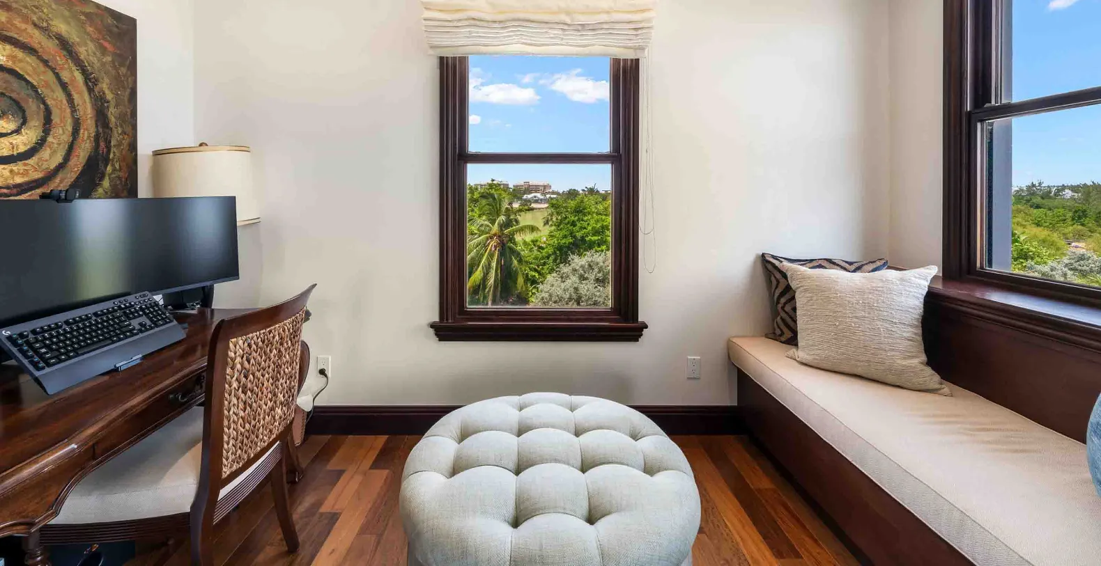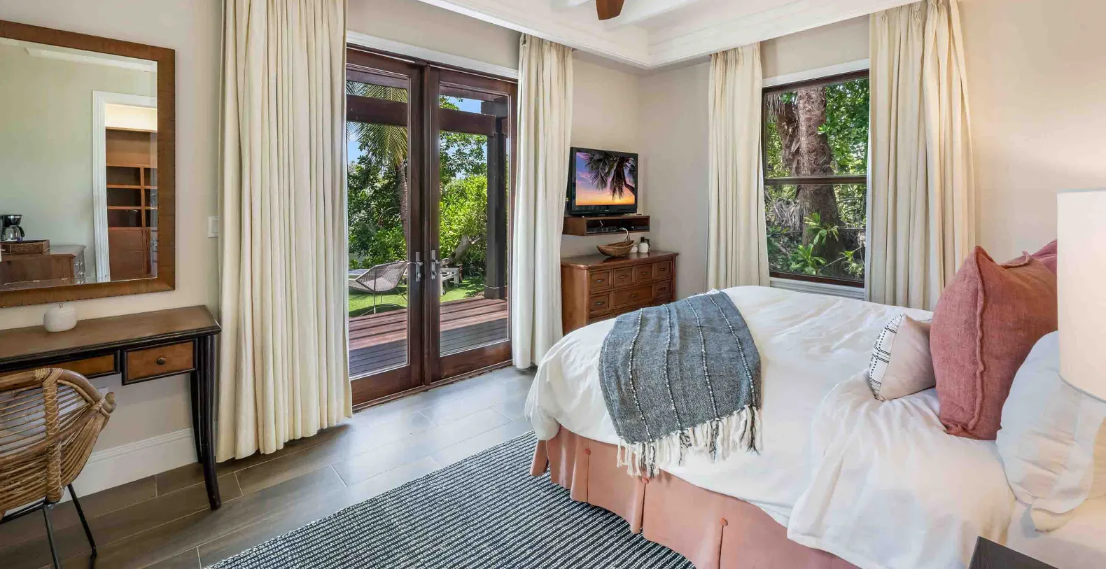 The sleeping accommodations are thoughtfully arranged to offer comfort and privacy for all guests. Four bedrooms are located within the main villa, while the detached guest cottage provides an additional bedroom—ideal for extended family members, a nanny, or guests seeking extra independence. The primary suite occupies the entire upper level of the main house and is a true sanctuary, featuring a king-size bed, vaulted ceilings, private study and home office, hidden console television, and direct access to a private balcony.