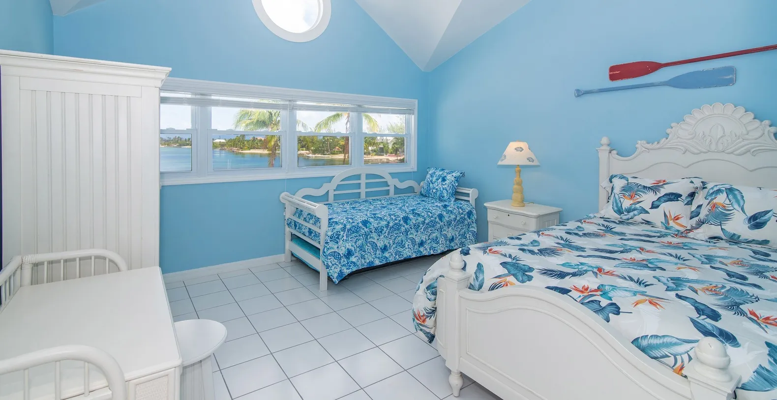 Upstairs the West Suite showcases a queen bed, dramatic vaulted ceilings, beautiful waterfront views, and ensuite bath with tiled shower while the versatile Middle Suite provides a full bed plus trundle daybed sleeping two additional guests on twin mattresses alongside vaulted ceilings, water views, and ensuite bath with double vanity and walk-in shower. The East Suite accommodates families with its queen bed plus additional twin bed configuration, vaulted ceilings, waterfront panoramas, and ensuite bath featuring shower and tub combination. The villa comfortably sleeps 11 guests total or 8-9 adults maximum ensuring everyone has their own comfortable sleeping space. This exceptional 4-bedroom home can be rented in combination with neighboring 3-bedroom Peace & Kai It villa separated by just one vacant lot creating an ideal arrangement for extended families or larger groups who desire proximity while maintaining separate living quarters.