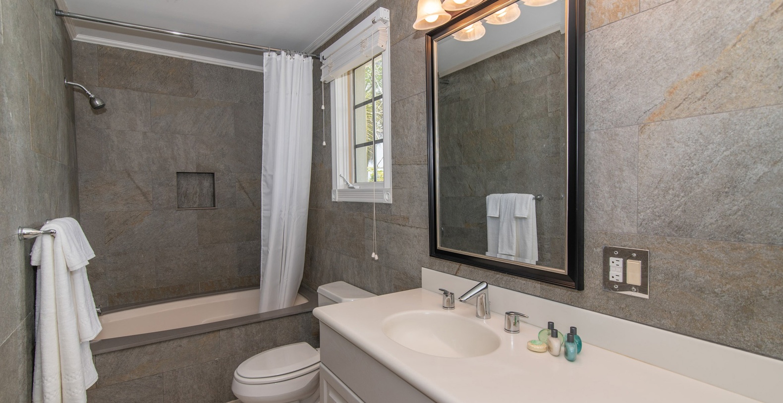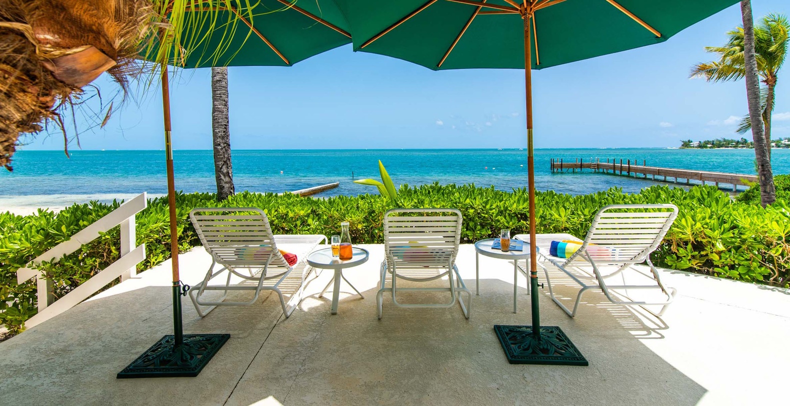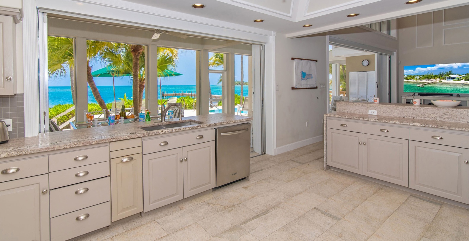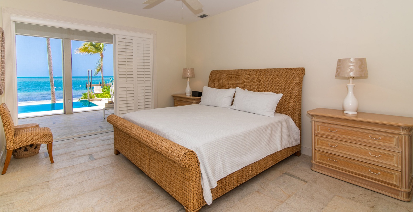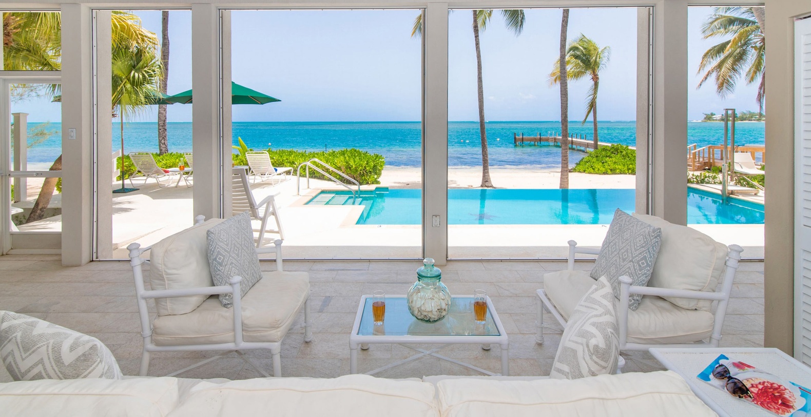 The spectacular oceanfront two-story screened atrium spans the entire width of the main house, allowing guests to savor tropical Caribbean vistas from all three oceanfront bedroom suites, the living room, and kitchen. The upper-level Primary Suite showcases king bed, waterfront views, cable HD television, walk-out access to shared screened balcony, and luxurious ensuite featuring dual vanity, large roll-in shower with dual showerheads, bench, and handrails. The second upper-level suite offers two queen beds with waterfront views, balcony access, and ensuite with shower bath plus separate shower. The lower-level waterfront suite features king bed, walk-out access to screened atrium, and ensuite shower.