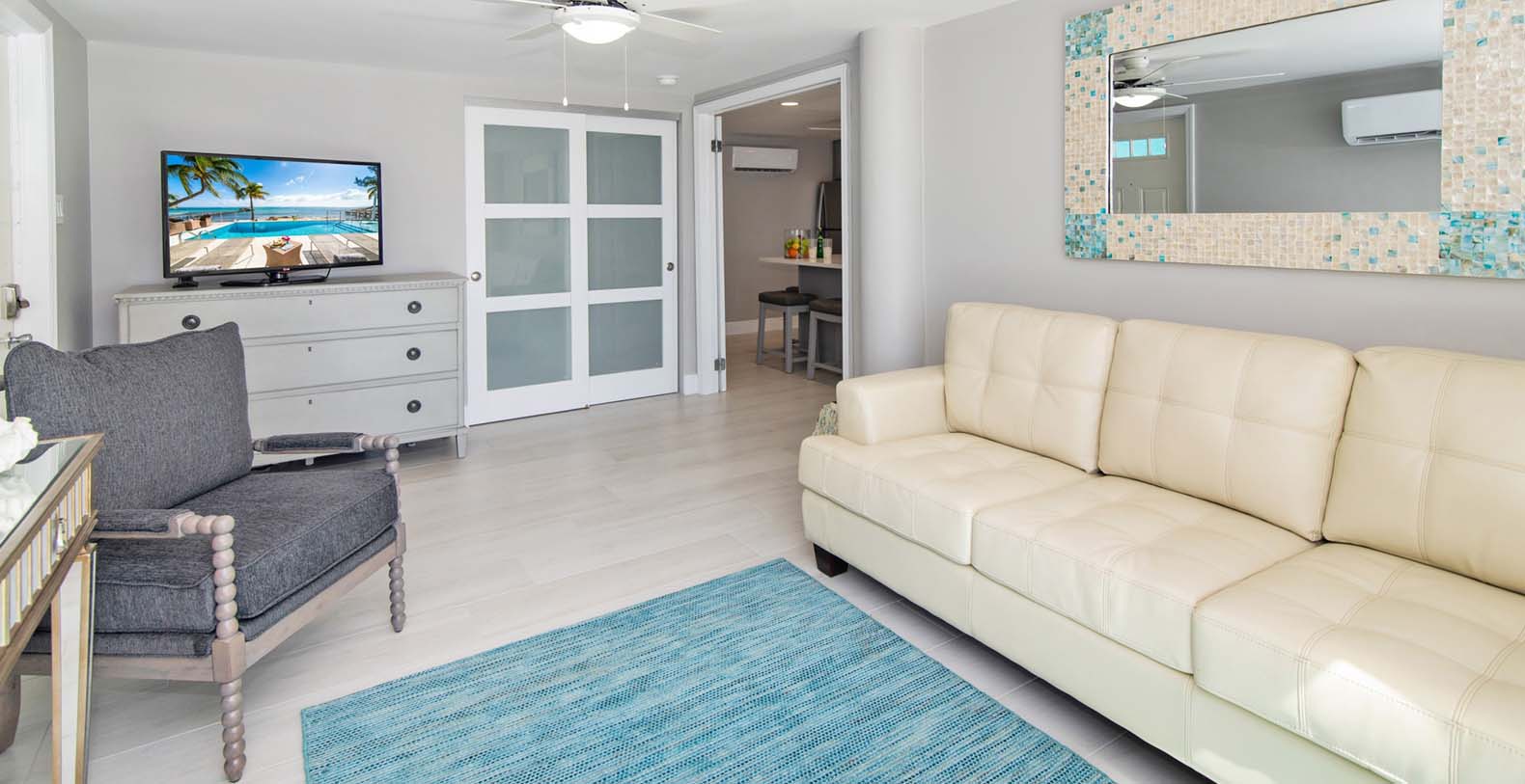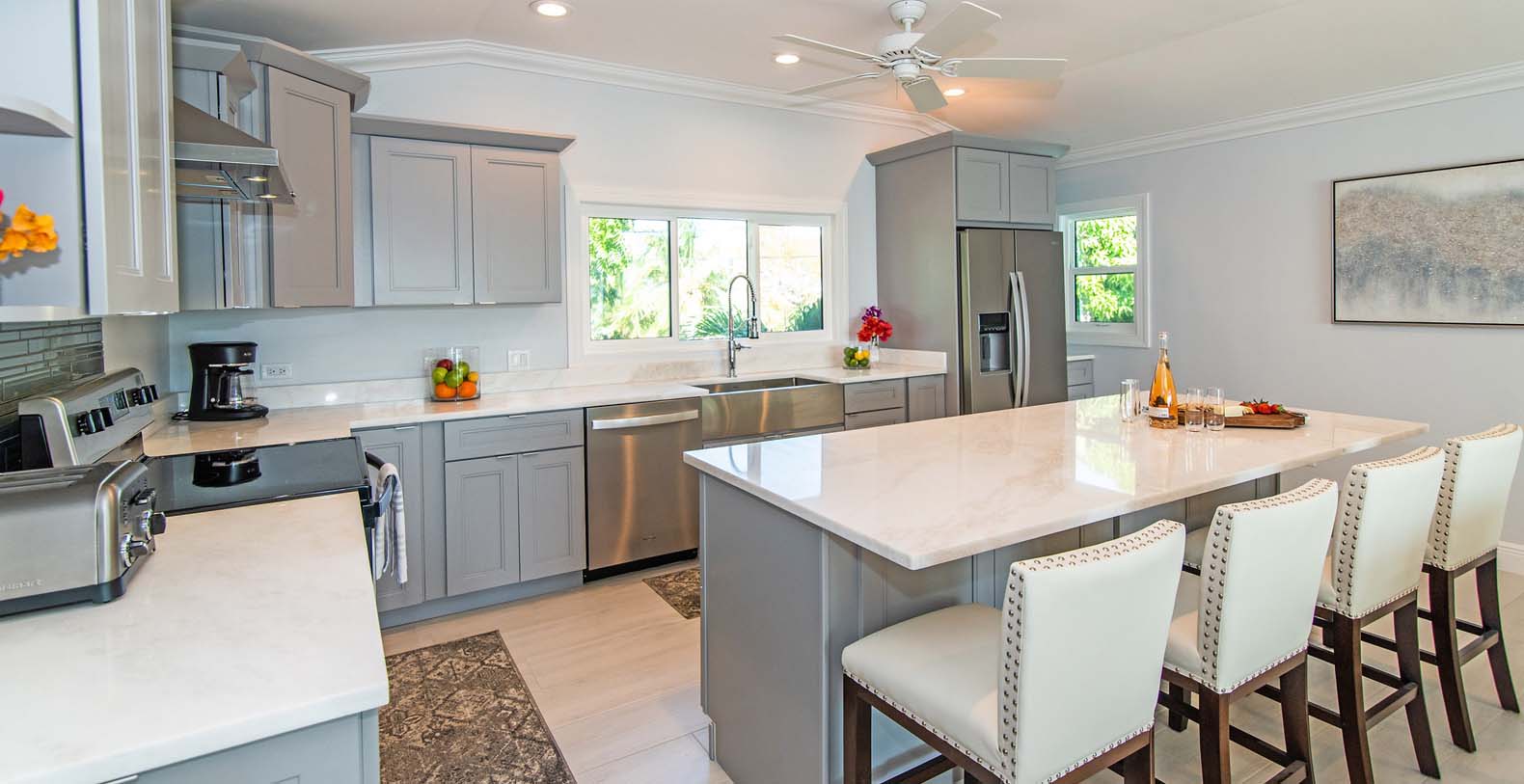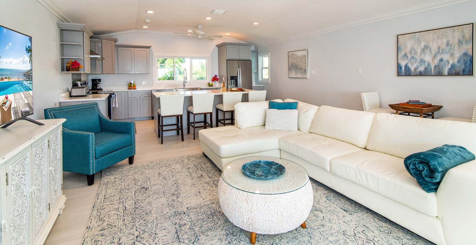 The fully equipped kitchen is a chef's dream, showcasing modern stainless-steel appliances, new cabinetry, and an island counter with breakfast bar seating for four. You'll find all the essential dishes, cookware, glassware, and cutlery you need for meal preparation. After a day of sun-soaked adventures, unwind in the living area featuring a plush sectional sofa and an HD television, perfect for cozy movie nights. The lower-level apartment suite adds flexibility to your stay, complete with a kitchenette, living area, bedroom, bathroom, and a screened breakfast nook that opens directly to the pool deck.