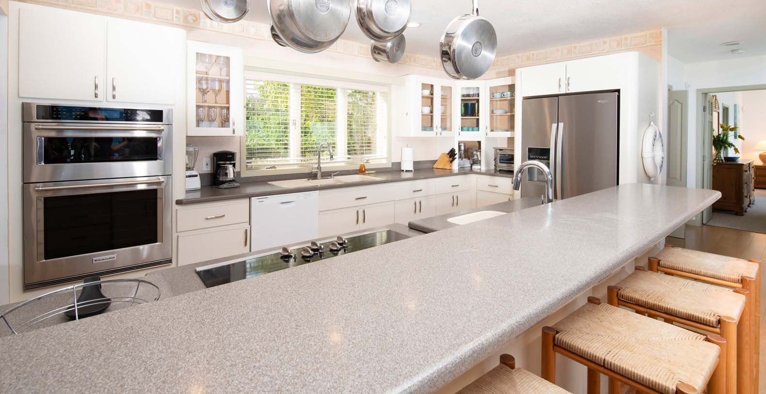 The spacious living area showcases vaulted ceilings and an open layout that floods the space with natural light and stunning ocean views. You’ll find all the comforts of home, from plush couches to a large HD cable television equipped with surround sound for entertainment. The modern kitchen is well-appointed with contemporary appliances and features breakfast bar seating, along with a formal indoor dining table for six and an alfresco dining option on the oceanfront deck.
