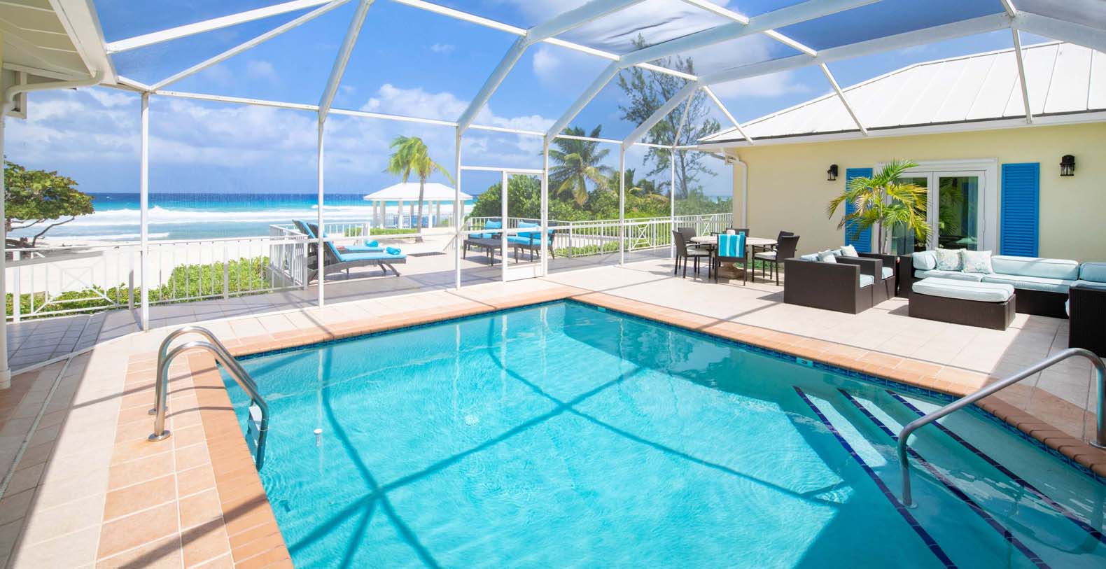 The inviting freshwater pool is nestled within a screened atrium, protecting guests from local wildlife and insects for a worry-free experience. For those visiting during the winter months, optional pool heating is available for an additional $35 per day. The atrium is beautifully furnished with a sectional sofa and dining table, creating the perfect setting for evening cocktails or al fresco dining. Framed between the two wings of the house, stunning views of the expansive sandy beach are complemented by an oceanfront gazebo and two hammocks, ideal for lazy afternoons spent unwinding with a good book or soaking in the scenery.