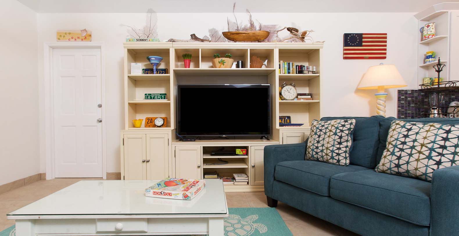 At the heart of the main house lies the magnificent great room, which connects both wings of the villa and opens up to an enclosed sun porch, providing bright ocean views throughout the living, dining, and kitchen areas. The airy, open-concept design of the great room showcases a dining table that seats 10, a cozy TV den with two comfortable couches, and a fully-equipped kitchen with breakfast counter seating for six. For our young guests, a separate kids' table with chairs adds an extra touch of comfort, making this the perfect haven for families.