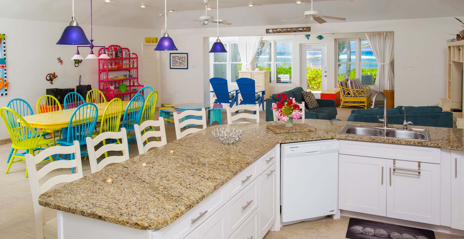 Discover Coconut Beach Vacation Rental, a family-friendly oceanfront retreat nestled in the beautiful Rum Point community on Grand Cayman’s stunning north coast. This expansive one-story beach house offers 4,200 sq. ft. of space and comfortably sleeps up to 12 guests across five spacious bedrooms in the main house, along with a private detached studio suite featuring one bedroom and one bathroom above the garage. Ideal for vacationing grandparents or in-laws, this suite ensures maximum privacy, as it is never rented to unrelated guests during your stay.