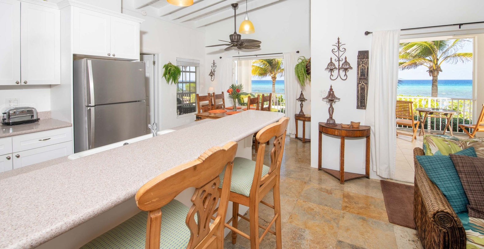 The property positions 2.4 miles from Grand Cayman Villas and Condos Welcome Center and 19.6 miles with 39-minute drive from Owen Roberts Airport. All beaches in Grand Cayman are technically public since the Crown owns up to the high water mark. The shoreline quality behind your property may vary slightly from images on our website due to shifting tides and weather patterns. The next-door beach is also always available for your use. Beaches in Grand Cayman may also experience floating ocean debris and sargassum weed seasonally. Sargassum is a generally harmless floating seaweed that has increased in frequency over the years during the summer. Our owners make efforts to remove heavy sargassum and will have the beach raked prior to your arrival. Should sargassum weed be extremely heavy behind your property, we will reach out to the owner for alternative solutions which may include a partial refund or relocation.