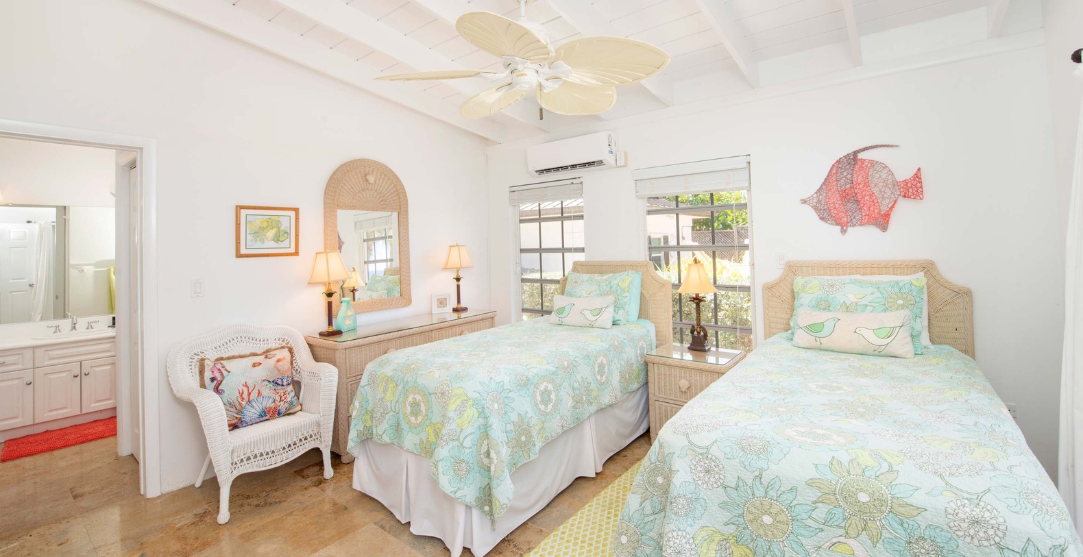 The sleeping arrangements accommodate up to 6 guests total. The Primary Suite features queen bed, ocean views, walk-out access to the screened porch, and ensuite with shower. The Twin Suite offers two twin beds, ocean views, walk-out access to the screened porch, and ensuite with shower. Twin beds can be fitted into a king bed upon request. The Cottage Suite provides king bed, partial ocean views, small kitchenette with appliances, and ensuite with dual vanity and shower.