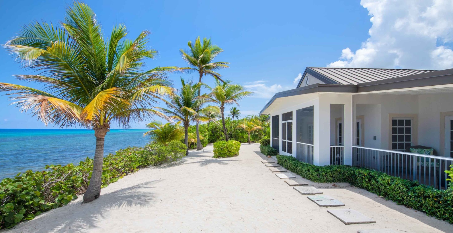 Conch'ed Out is a cozy oceanfront villa and cottage in Old Man Bay along the island's North Side. This Caribbean-style 3-bedroom home offers excellent snorkeling just steps off the backyard. A sandy trail with paver stones leads down to a pebbly beachfront. We recommend guests wear pool shoes or fins for foot protection when entering the water. Conch'ed Out sits on an oversized 1-acre lot measuring over 400 feet deep with a gated driveway, private pool, and heavy landscaping out front.