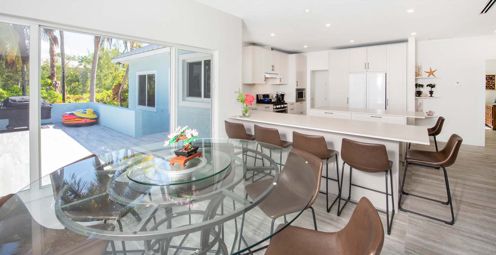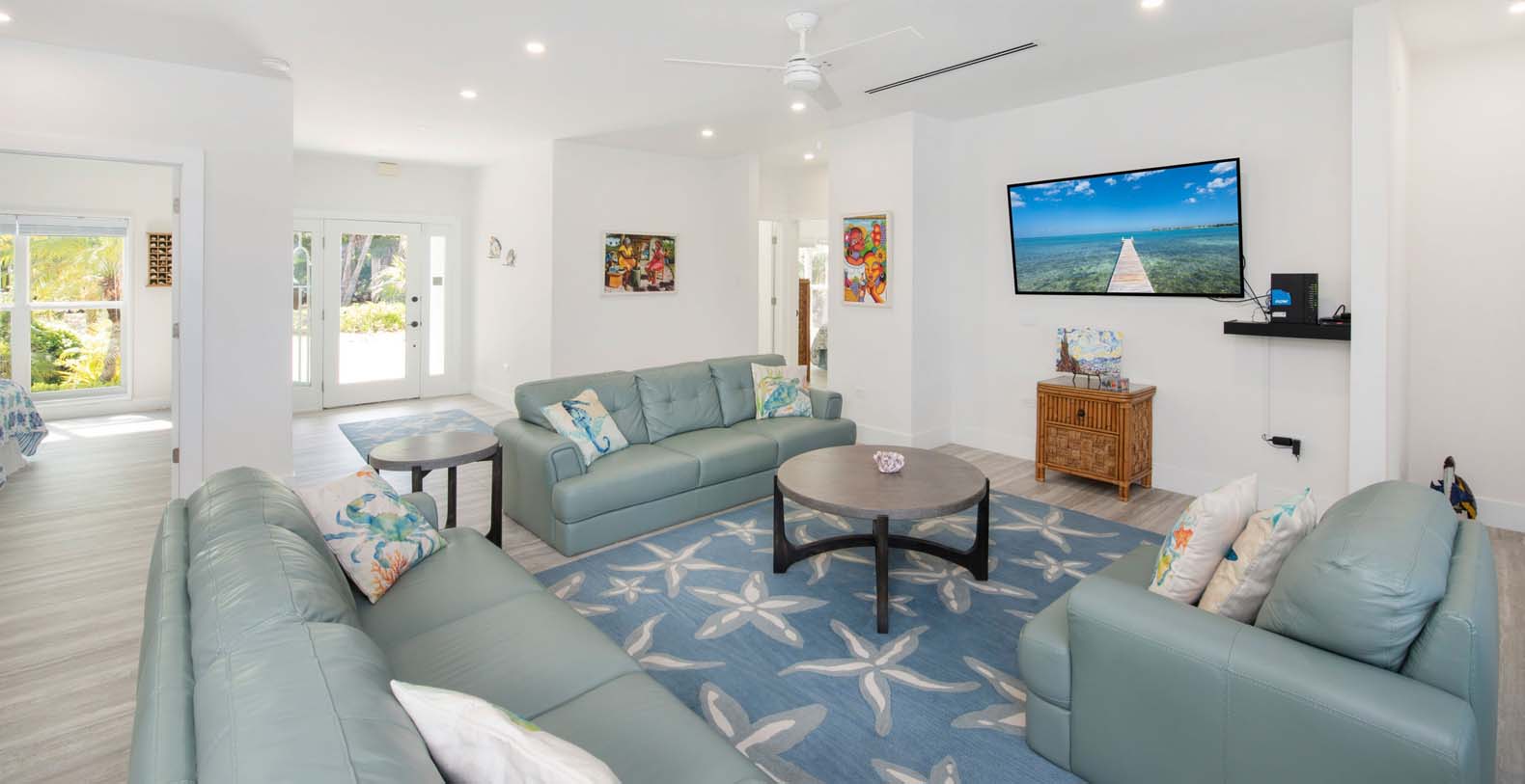 This spacious single-level home features five bedrooms, a pristine sandy beachfront, a private pool, and a dock, making it the perfect destination for families with small children. The newly renovated kitchen and expansive living and dining areas offer captivating ocean views, ensuring that natural light fills the home year-round. Whether enjoying breakfast at the dining table or relaxing on the sectional sofa, you'll always be surrounded by the beauty of the tropical landscape.