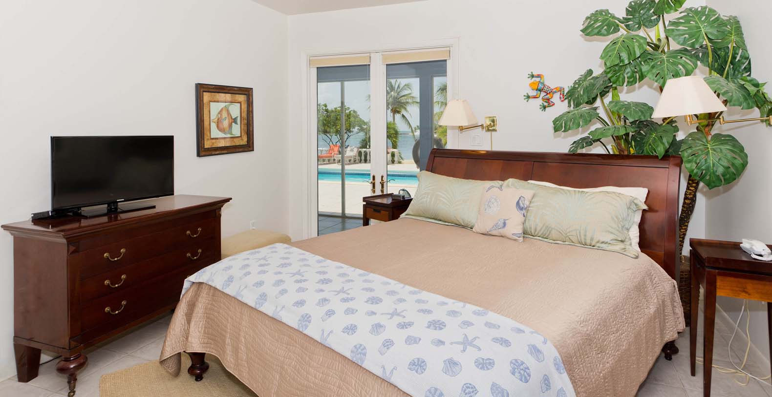 Nestled among tall palm trees and lush tropical plants, Kailypso’s waterfront pool and patio create a tropical oasis. Plenty of loungers dot the pool deck for sunbathers to kick back and work on their tans. After hours under the sun, cool off with a refreshing dip in the pool or seek shade in the screened-in porch. A wooden pathway leads you down from the pool deck on to a soft sandy beach with private boat dock.
