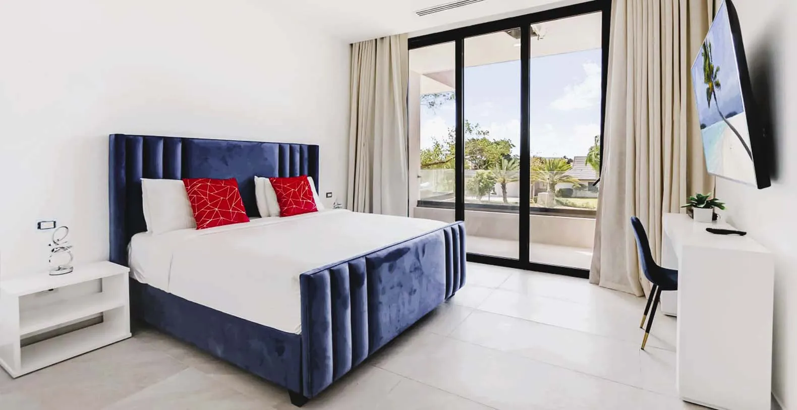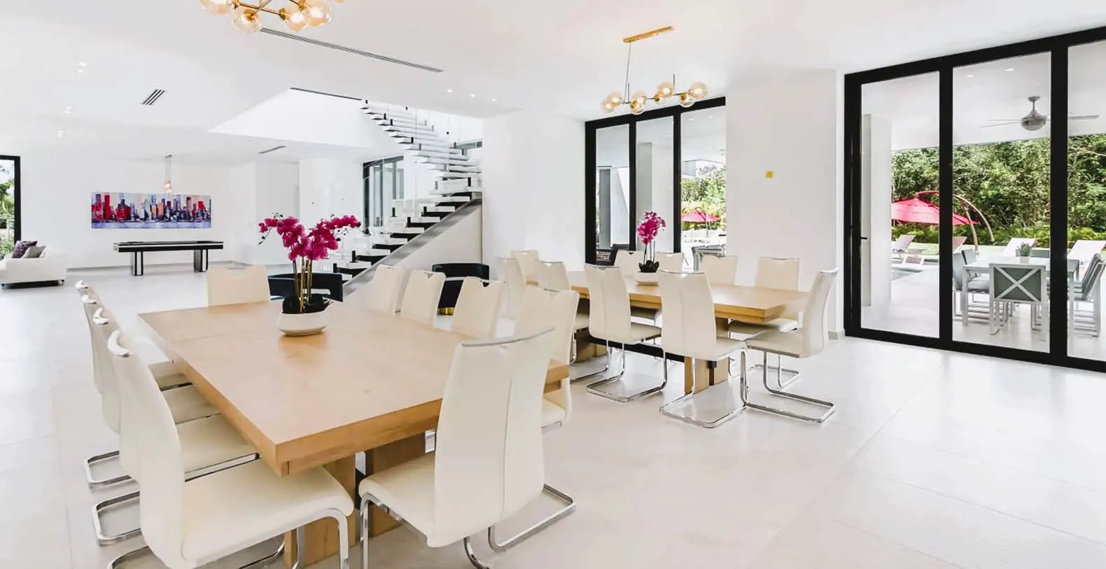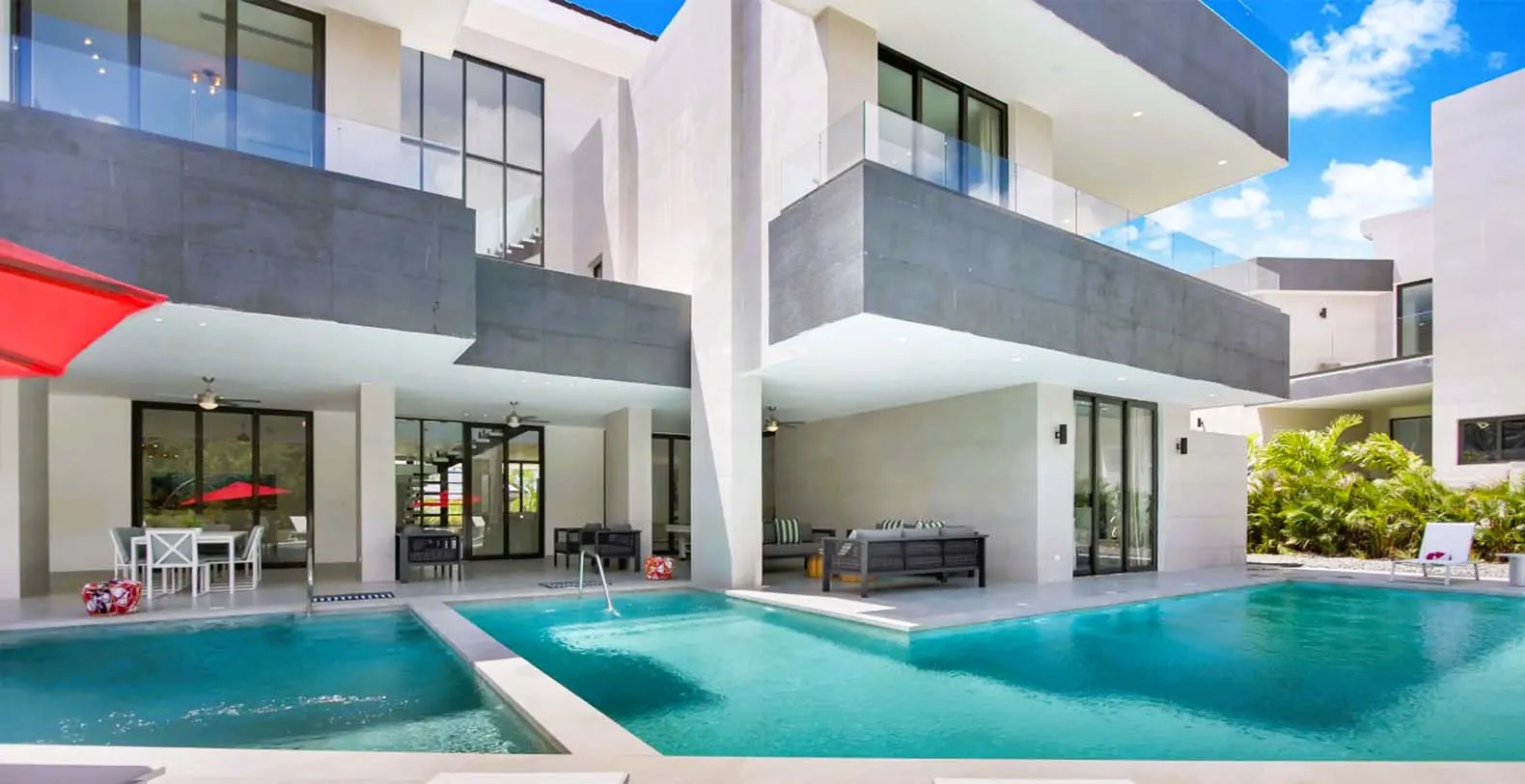 Each bedroom is a private retreat, with luxurious bedding, en-suite bathrooms, and quiet views of tropical gardens or the sparkling pool. You’ll find a fully equipped chef’s kitchen, and al fresco dining spaces for intimate dinners under the stars. The villa's minimalist and clutter-free interior invites relaxation and comfort, setting the stage for a comfortable and unforgettable vacation experience. The primary bedroom is located downstairs with direct access to the pool area, and the remaining 9 bedrooms are all upstairs with balconies. All Twin bedrooms can be converted into a King bedroom, i.e. 2 Twin beds can be combined into 1 King bed with a comfortable mattress topper. All bedrooms have air-conditioning, TV, closet with a safe, and en-suite bathroom with rain shower and Hans Grohe fixtures. Each bedroom upstairs has a private balcony and the bedroom downstairs has direct access to the pool area and terrace. The house has 10 bedrooms available 10 – 15 (sleeps 20) with 5 King and or 10 Twin (2 Twins can be combined into 1 King bed). This means you can have as much space as you like or need.