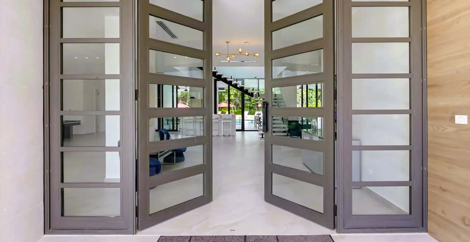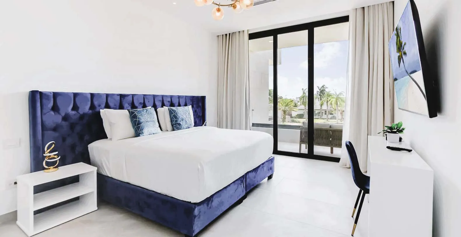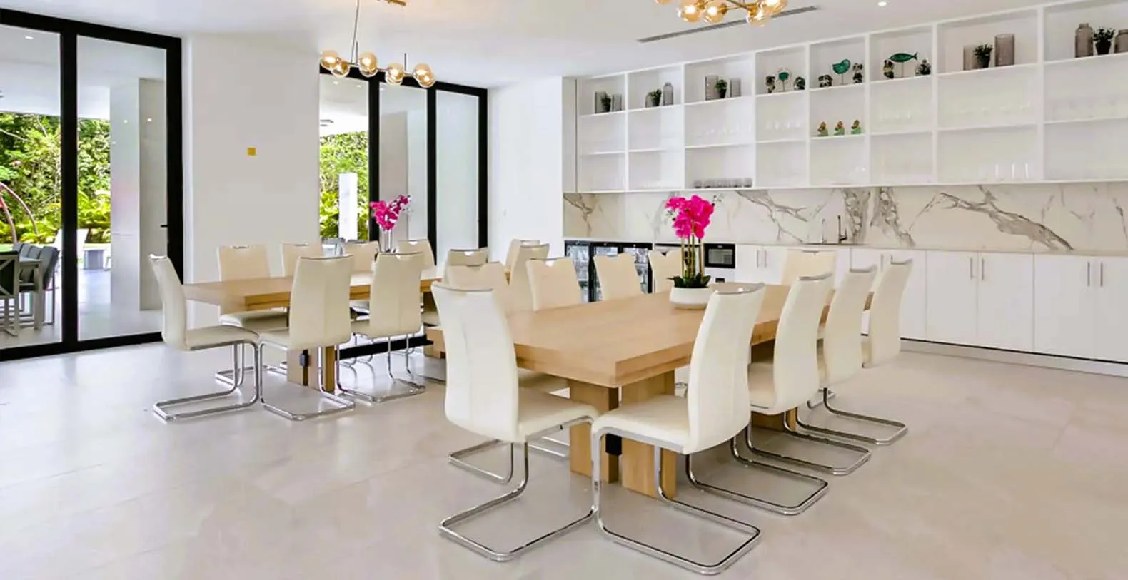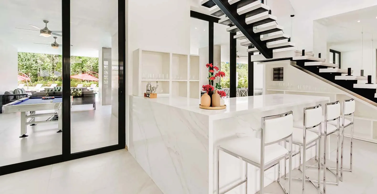 Each bedroom is a private retreat, with luxurious bedding, en-suite bathrooms, and quiet views of tropical gardens or the sparkling pool. You’ll find a fully equipped chef’s kitchen, and al fresco dining spaces for intimate dinners under the stars. The villa's minimalist and clutter-free interior invites relaxation and comfort, setting the stage for a comfortable and unforgettable vacation experience. The primary bedroom is located downstairs with direct access to the pool area, and the remaining 9 bedrooms are all upstairs with balconies. All Twin bedrooms can be converted into a King bedroom, i.e. 2 Twin beds can be combined into 1 King bed with a comfortable mattress topper. All bedrooms have air-conditioning, TV, closet with a safe, and en-suite bathroom with rain shower and Hans Grohe fixtures. Each bedroom upstairs has a private balcony and the bedroom downstairs has direct access to the pool area and terrace. The house has 10 bedrooms available 10 – 15 (sleeps 20) with 5 King and or 10 Twin (2 Twins can be combined into 1 King bed). This means you can have as much space as you like or need.
