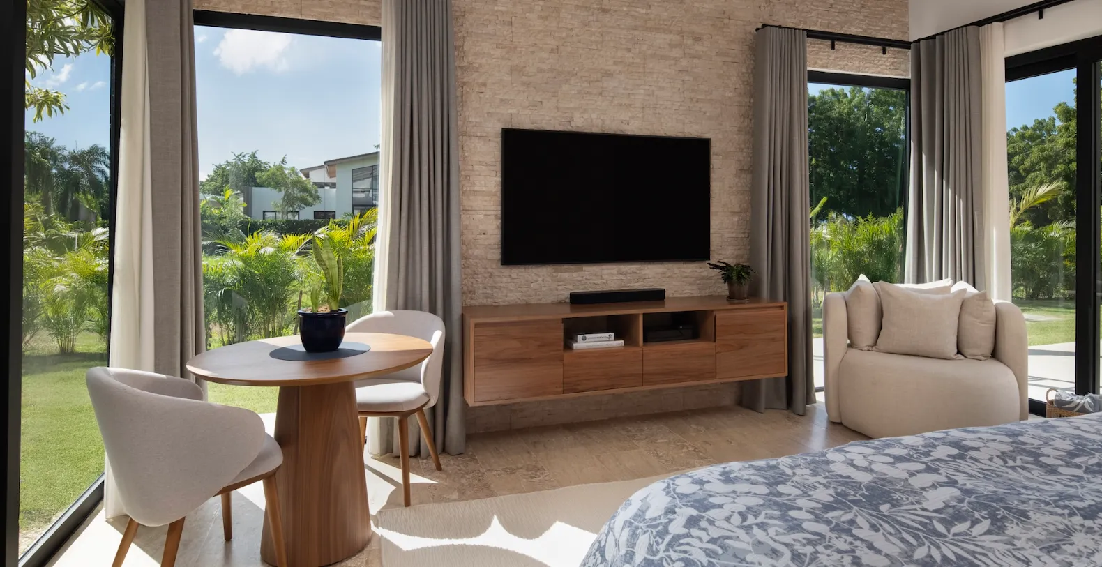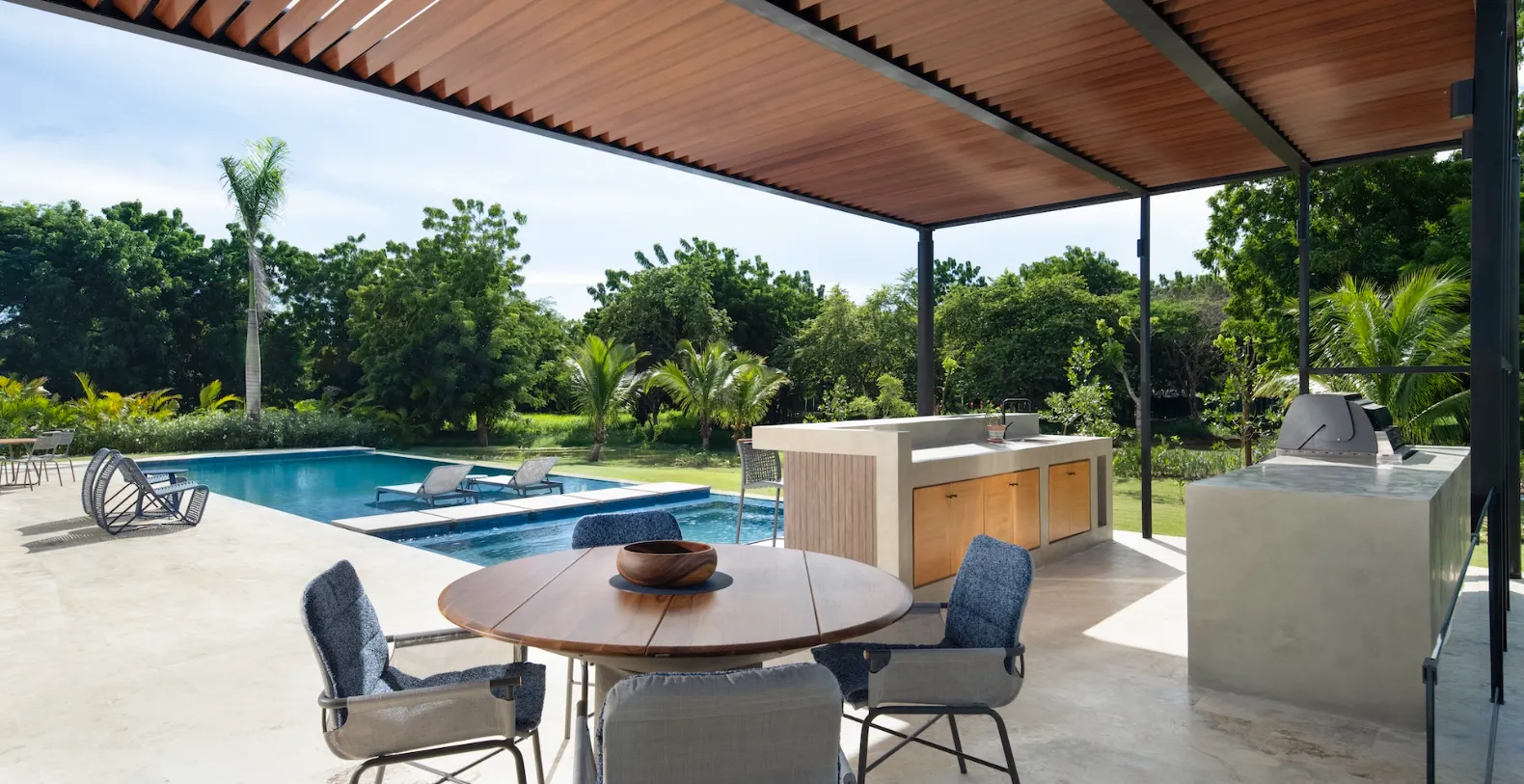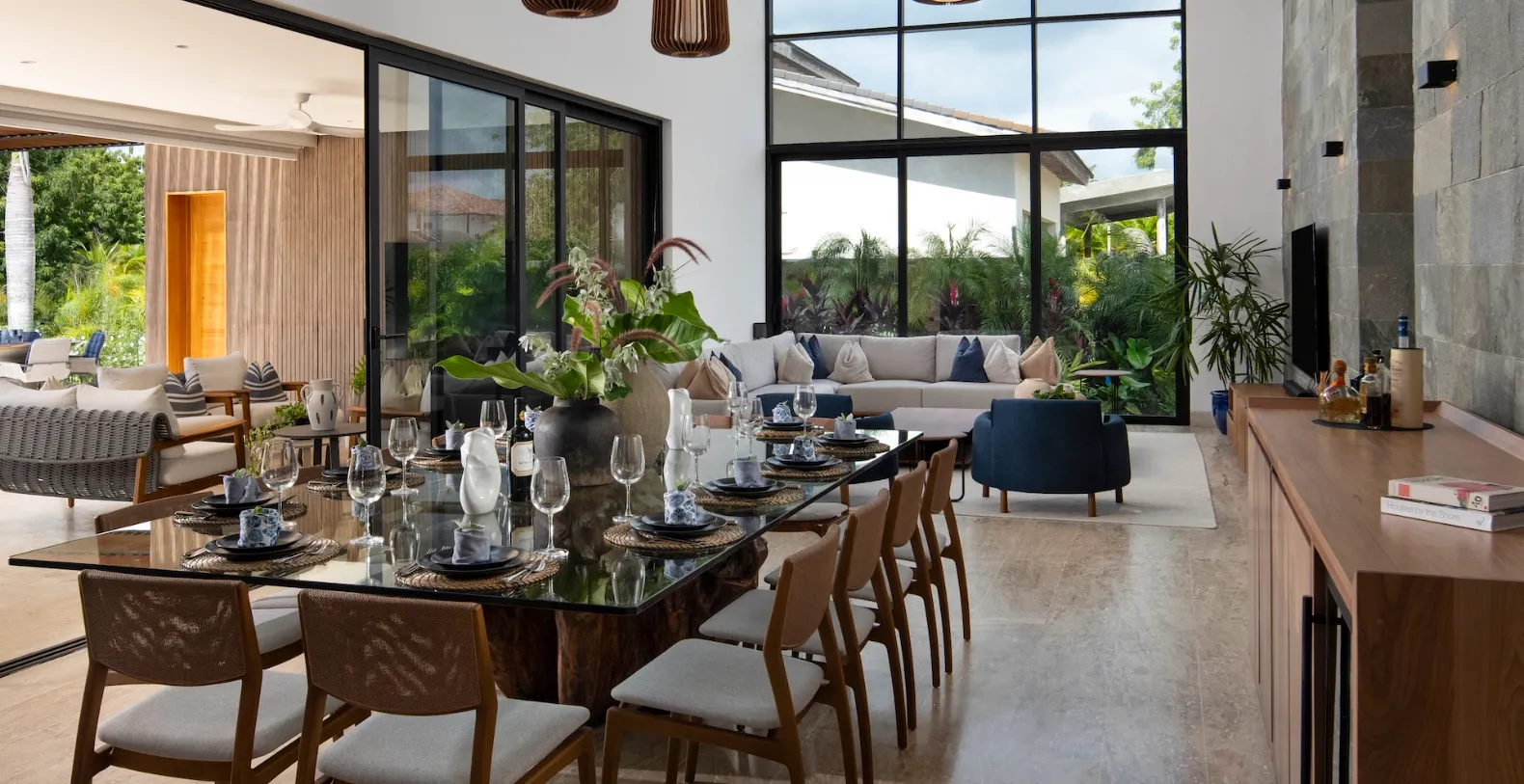 At the heart of Casa Bosque lies a spacious, centrally air-conditioned living area that opens completely onto the outdoor terrace. Floor-to-ceiling glass doors dissolve the boundary between indoors and out, creating a seamless flow that defines relaxed Caribbean living. The interiors are modern yet welcoming, furnished in soft neutral tones and organic textures that echo the surrounding landscape. The open-plan layout is ideal for both entertaining and everyday comfort. A stylish dining area and fully equipped kitchen are perfectly positioned for shared meals and social moments, while the living space offers a serene setting to unwind after a day exploring Casa de Campo.