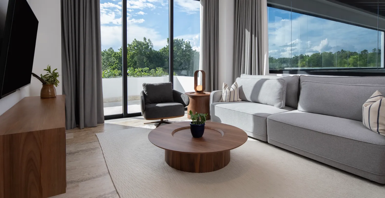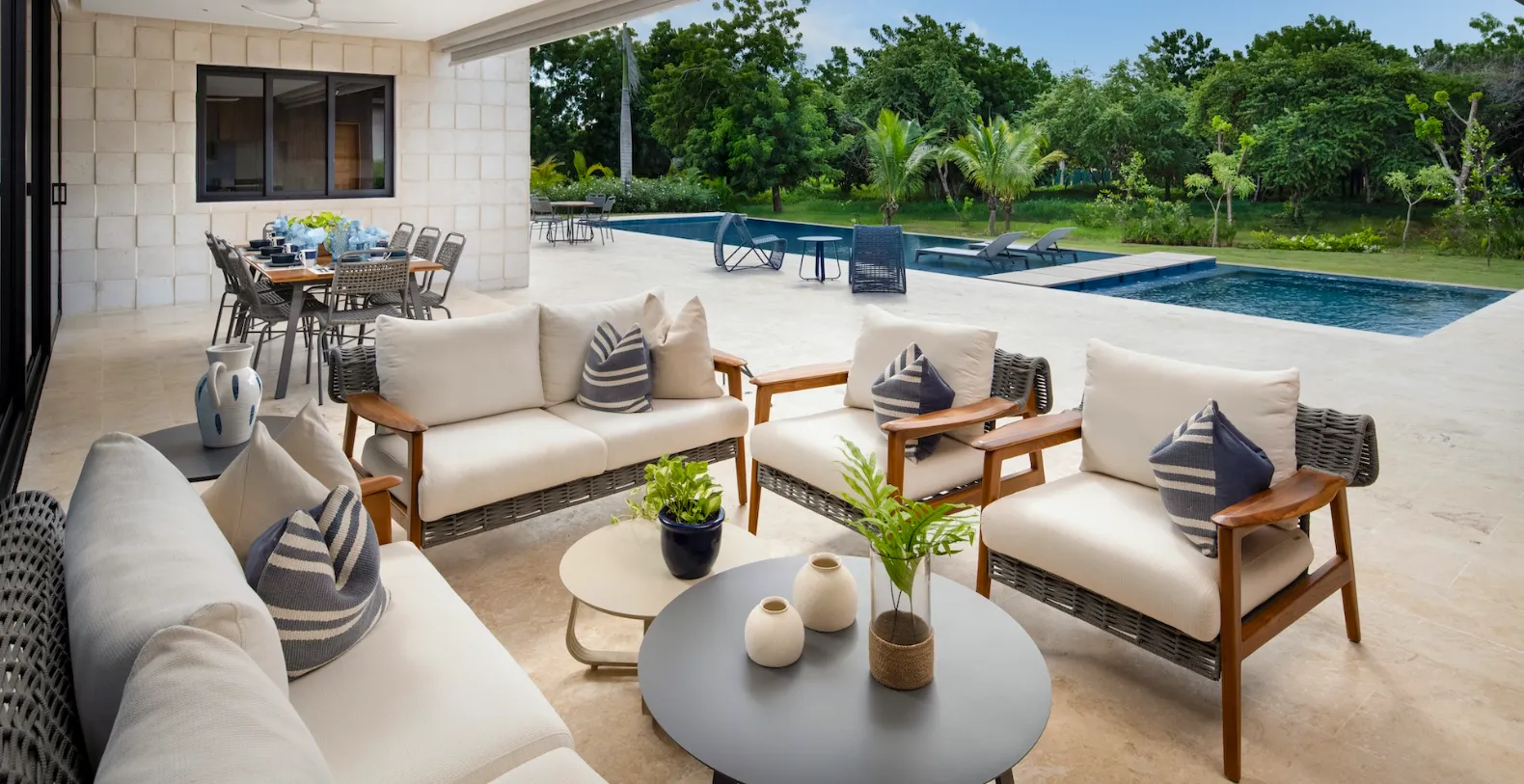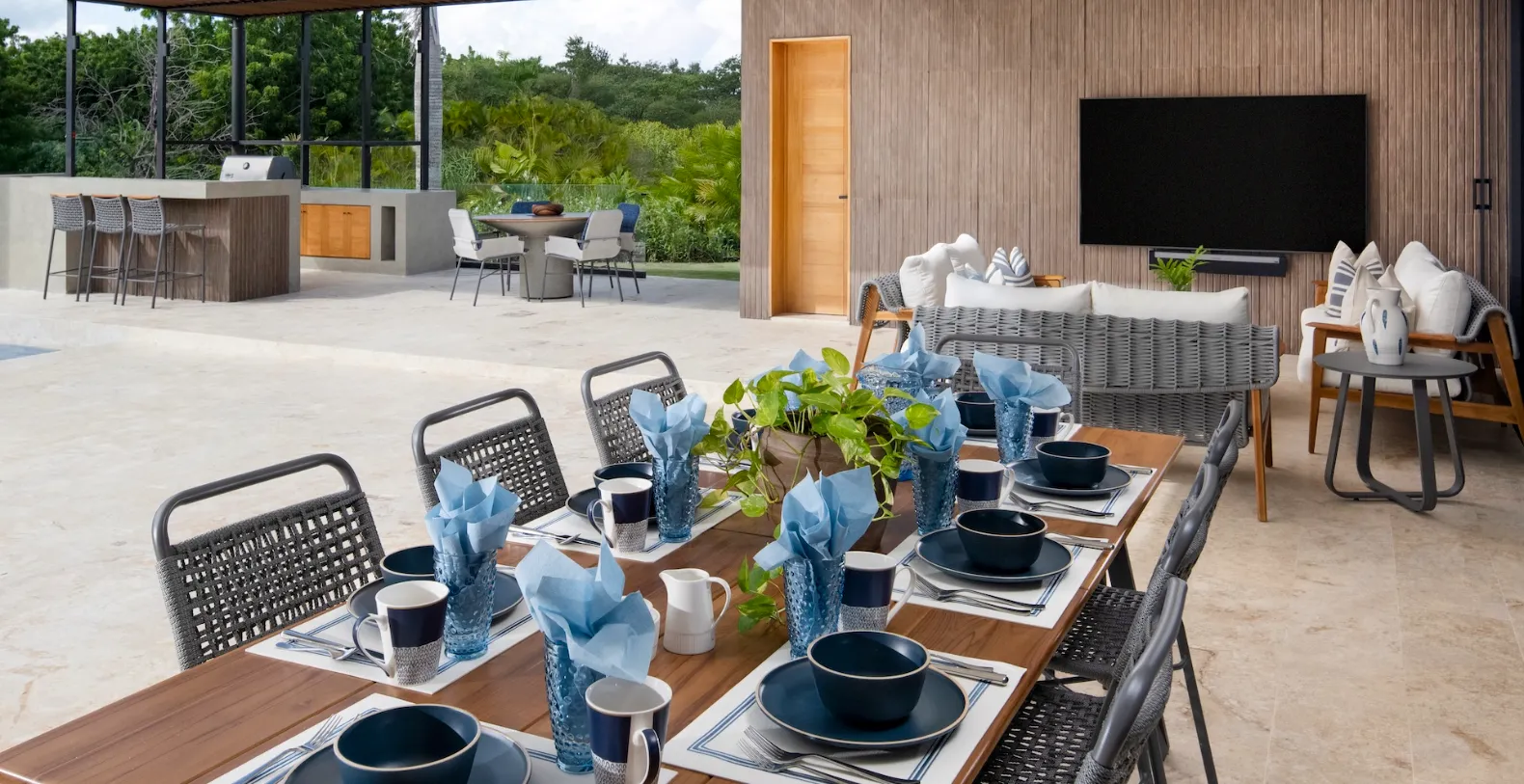 At the heart of Casa Bosque lies a spacious, centrally air-conditioned living area that opens completely onto the outdoor terrace. Floor-to-ceiling glass doors dissolve the boundary between indoors and out, creating a seamless flow that defines relaxed Caribbean living. The interiors are modern yet welcoming, furnished in soft neutral tones and organic textures that echo the surrounding landscape. The open-plan layout is ideal for both entertaining and everyday comfort. A stylish dining area and fully equipped kitchen are perfectly positioned for shared meals and social moments, while the living space offers a serene setting to unwind after a day exploring Casa de Campo.