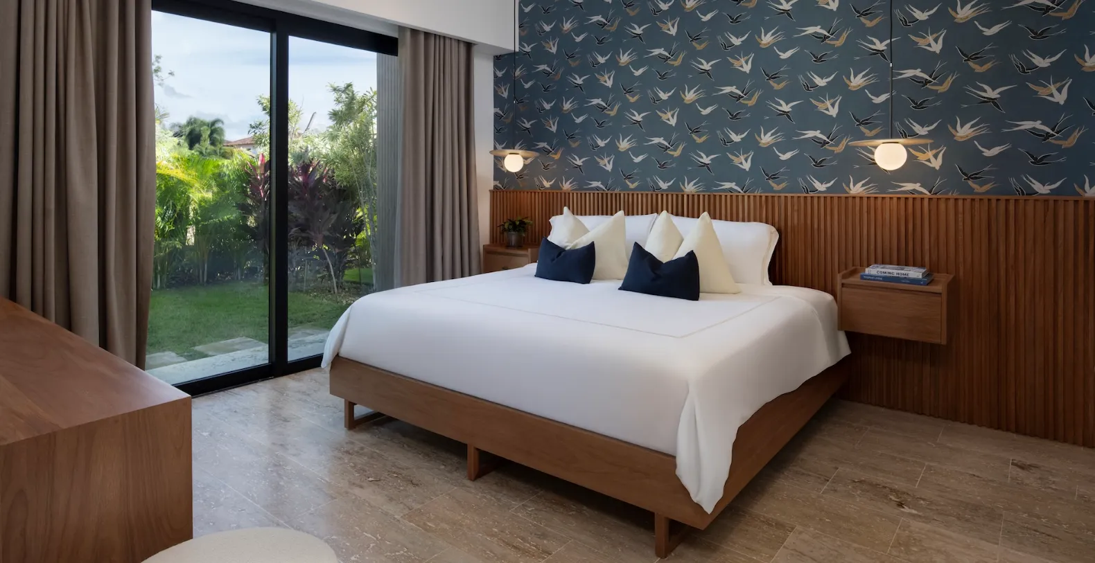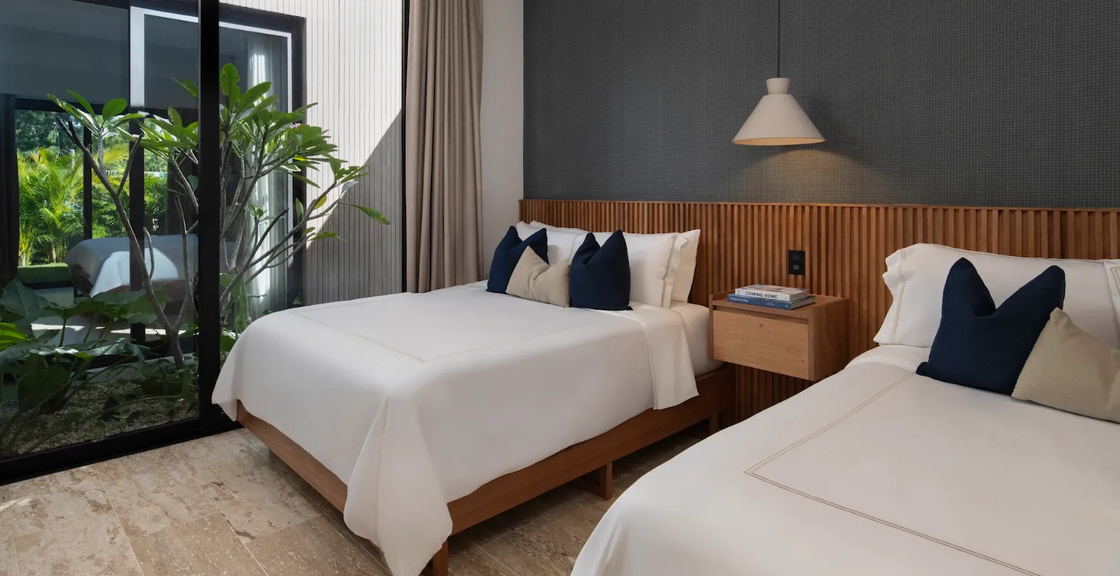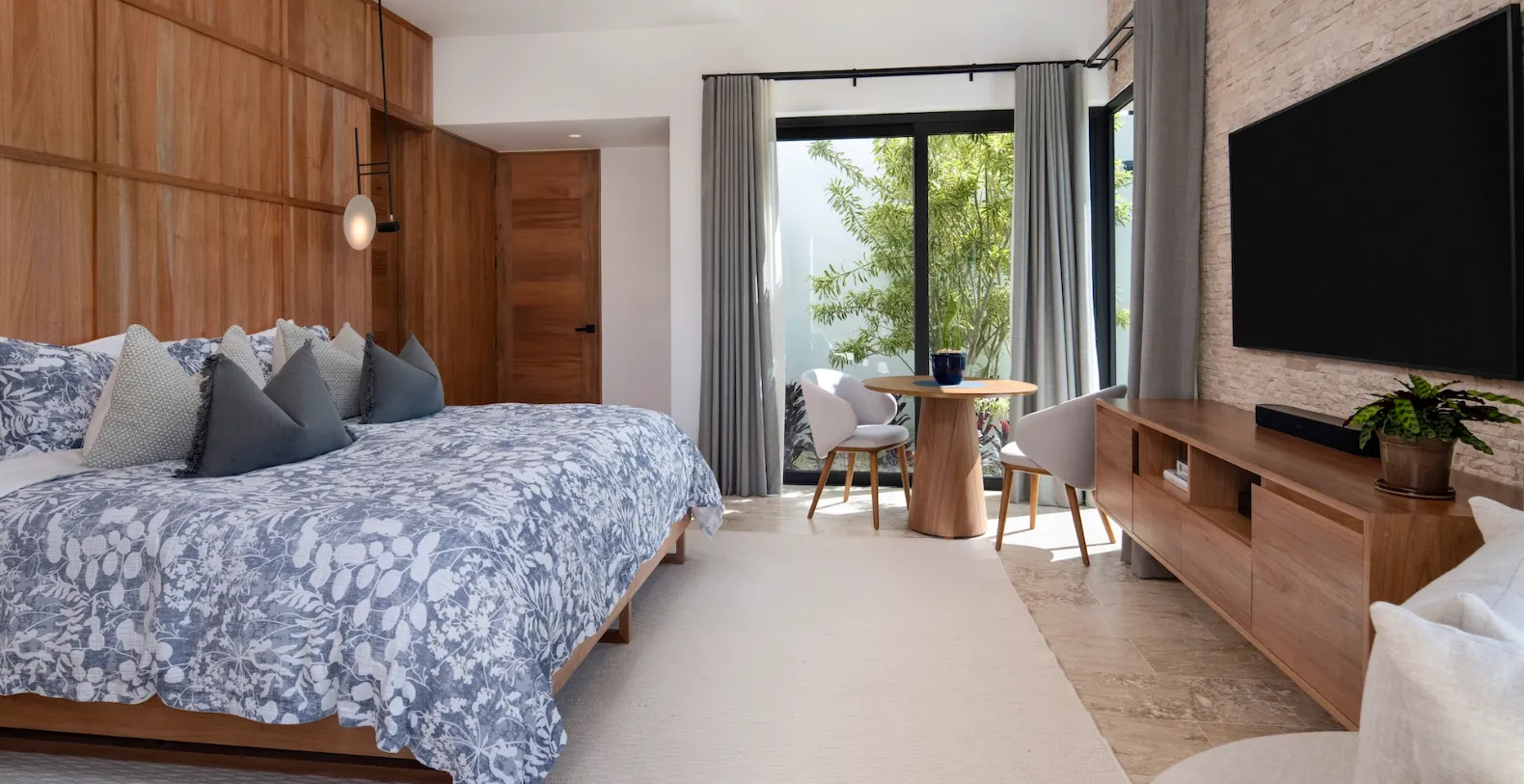 Casa Bosque accommodates up to ten guests across five beautifully appointed bedrooms. Three bedrooms feature king-size beds, while two bedrooms are furnished with two queen-size beds each, making the villa well suited for families or groups traveling together. Each bedroom is designed as a private retreat, with soft neutral palettes, natural finishes, and floor-to-ceiling glass doors that open onto private garden patios.