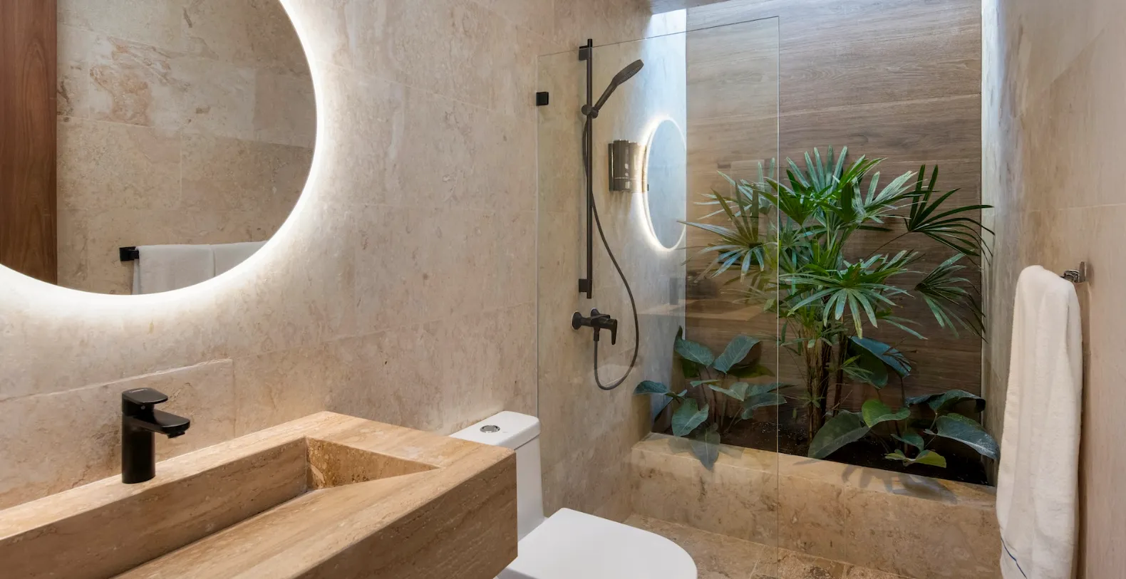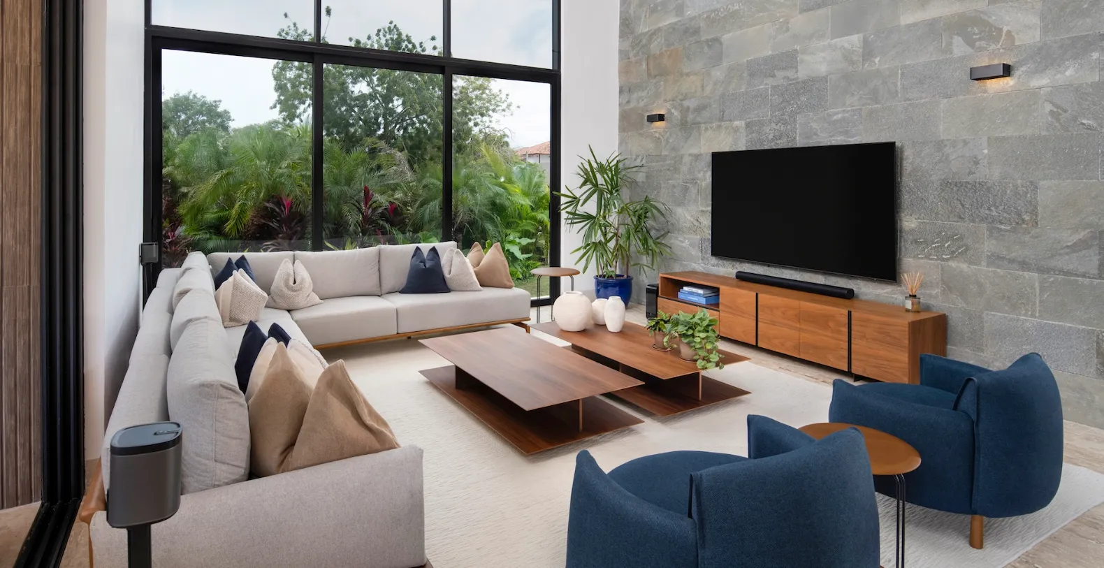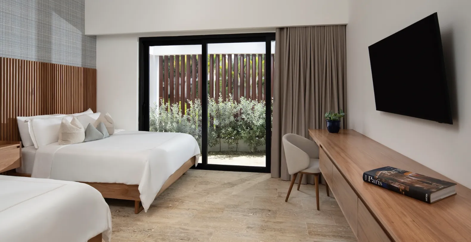 Casa Bosque accommodates up to ten guests across five beautifully appointed bedrooms. Three bedrooms feature king-size beds, while two bedrooms are furnished with two queen-size beds each, making the villa well suited for families or groups traveling together. Each bedroom is designed as a private retreat, with soft neutral palettes, natural finishes, and floor-to-ceiling glass doors that open onto private garden patios.