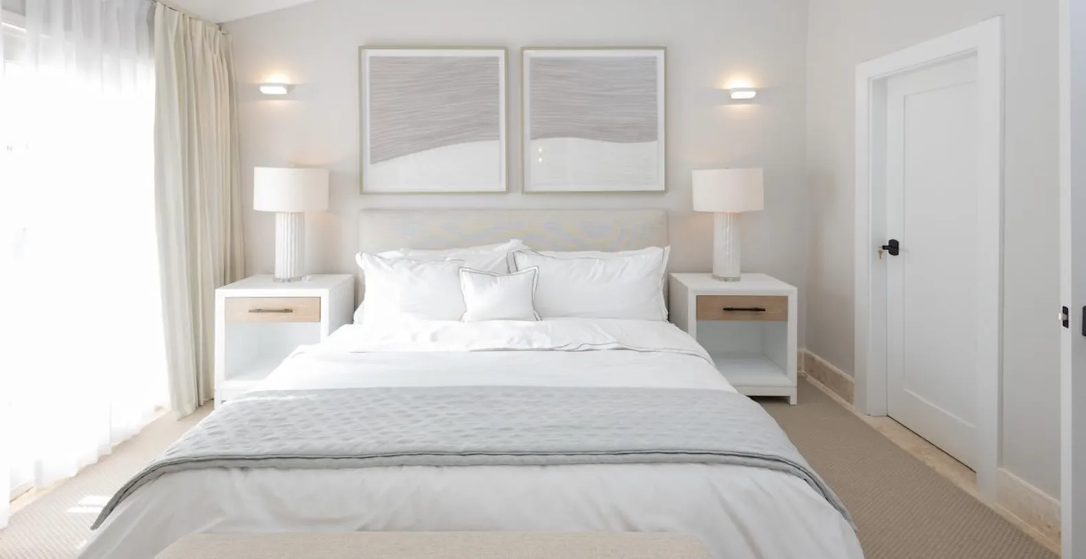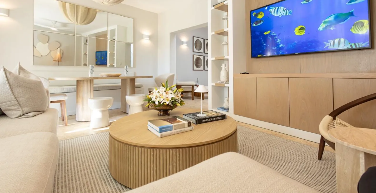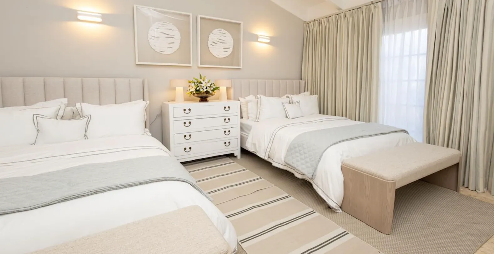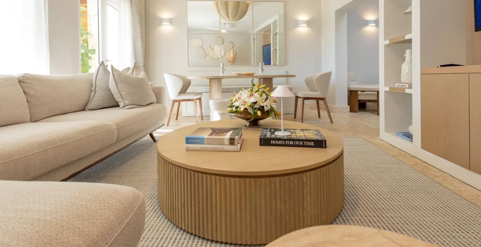 The interior spaces are thoughtfully curated with clean architectural lines, soft textures, and abundant natural light. The open-plan living and dining areas feel airy and welcoming, furnished with understated pieces in organic tones. These inviting spaces flow effortlessly, making the villa ideal for relaxed mornings, casual entertaining, or quiet evenings.