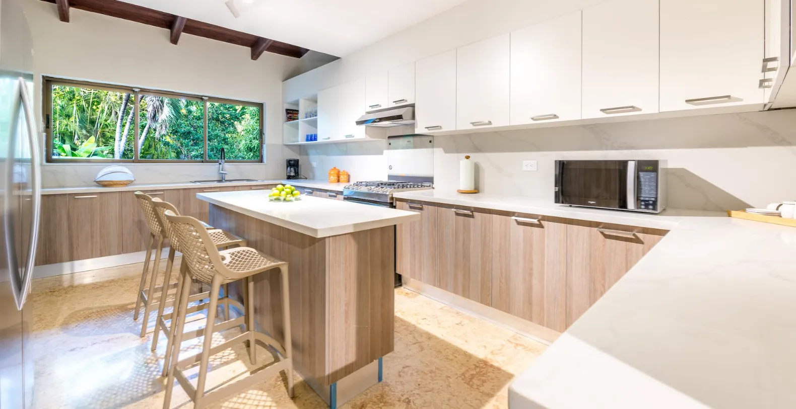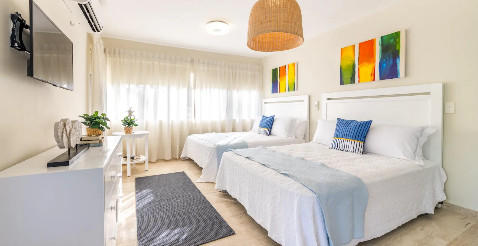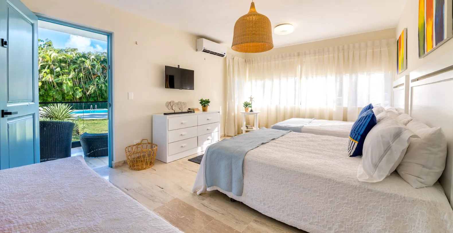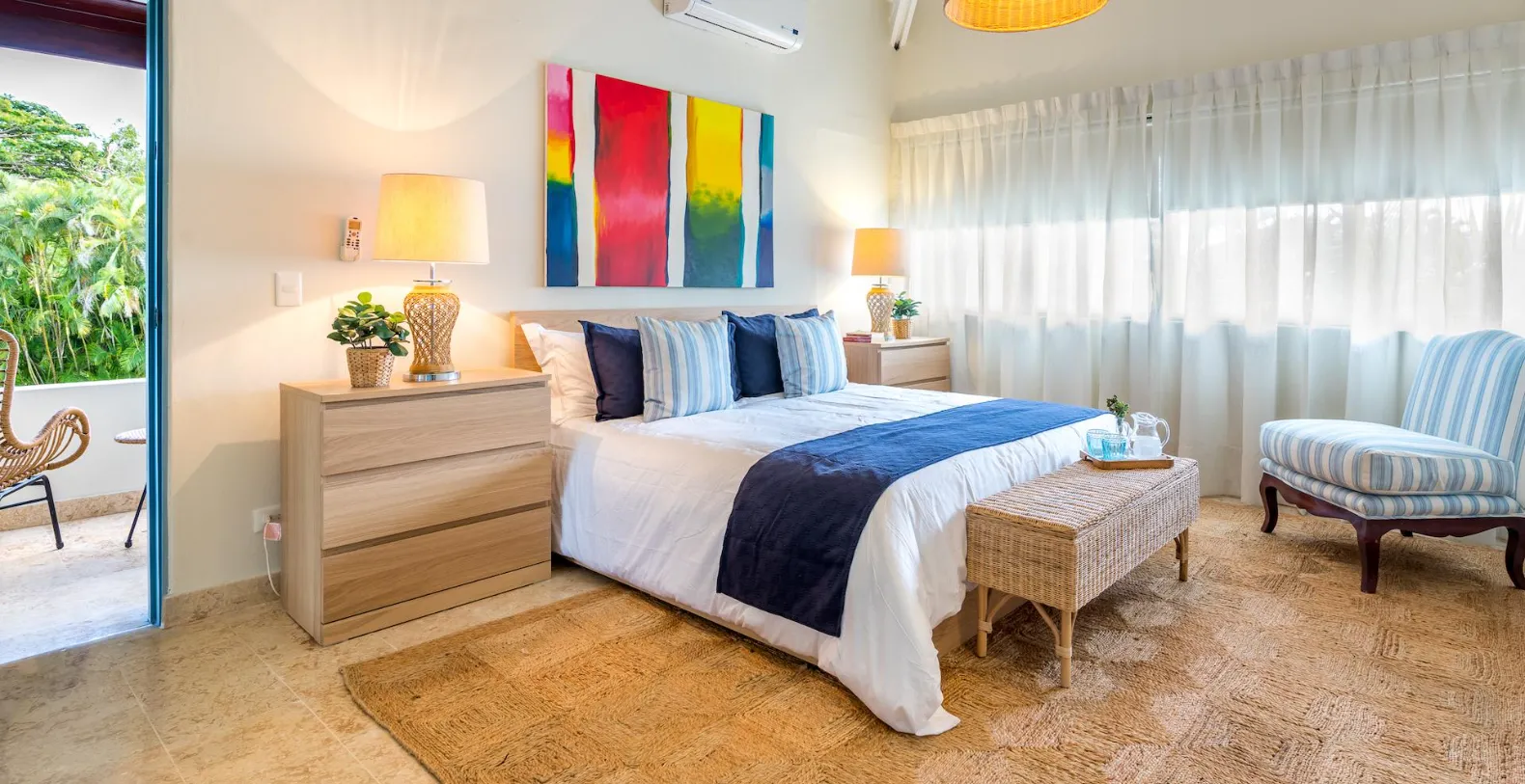 Inside, the home is warm, welcoming, and thoughtfully decorated with vibrant artwork and natural textures. The living room features comfortable seating areas framed by garden views, while the spacious dining room offers a stylish setting for shared meals. A fully equipped modern kitchen makes in-villa cooking easy, though guests may also choose private chef services or restaurants services for added convenience. Porta Azul features four air-conditioned bedrooms, each with an ensuite bathroom. The master suite includes a king-size bed and relaxing garden views, while the remaining three bedrooms each feature queen-size beds, providing comfort and privacy for up to eight guests.