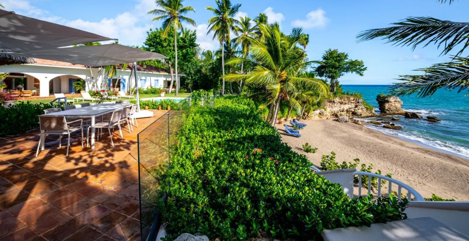 Outdoor living is the heart of Villa Santorini. The expansive terrace overlooks the swimming pool, framed by swaying palms and lush greenery. A circular glass dining table sits just steps from the pool, perfect for leisurely breakfasts with ocean breezes. A thatched-roof gazebo offers shaded dining, and multiple seating areas invite relaxation throughout the day. A private staircase leads directly down to a secluded sandy cove, ideal for sunbathing and swimming in total privacy.