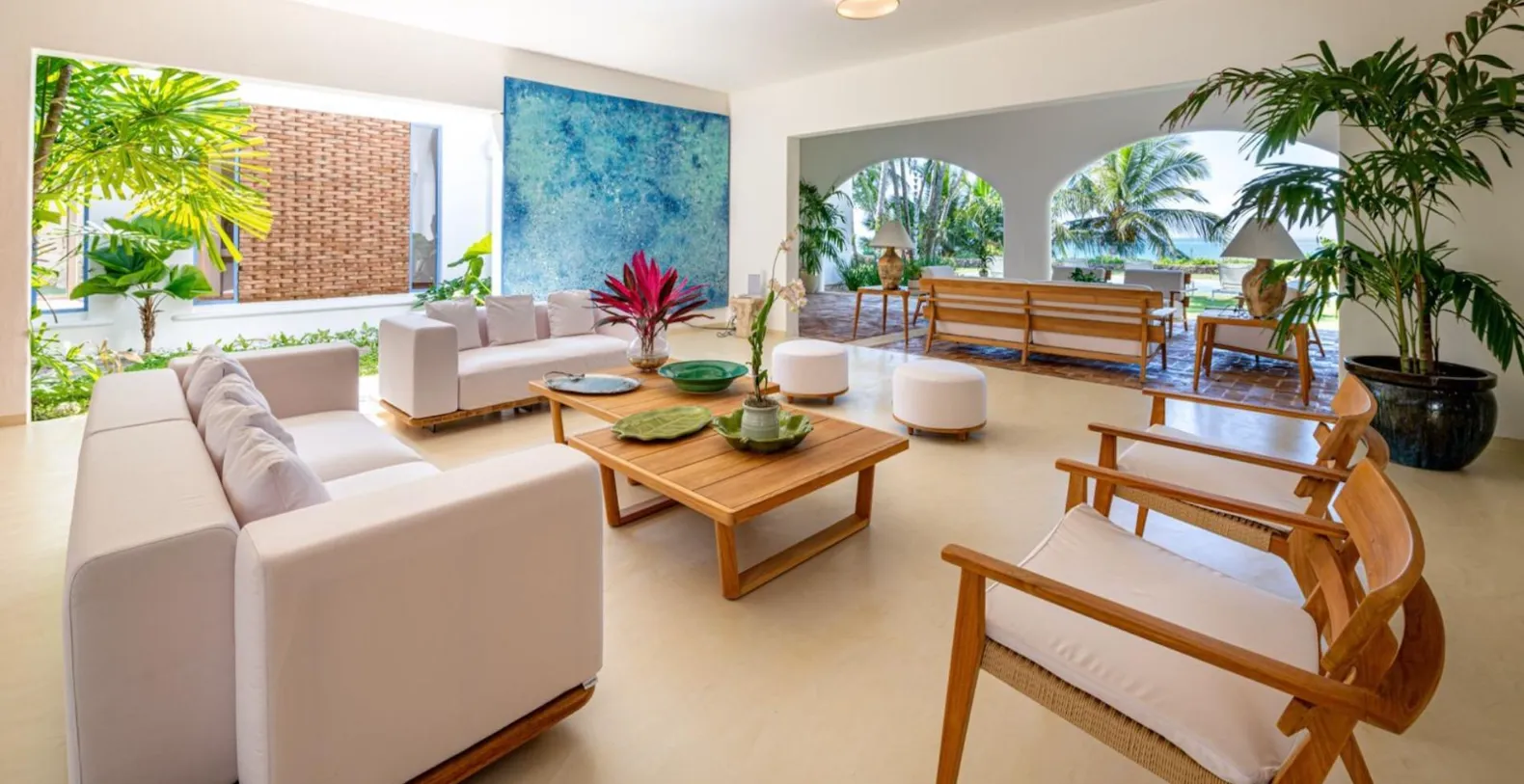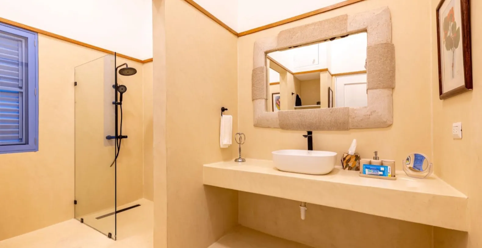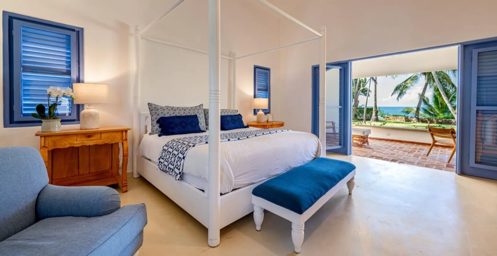 Each of the five bedrooms is spacious, air-conditioned, and thoughtfully curated to elevate comfort. Soft, neutral tones pair with warm wood details and large windows that invite natural light and garden views. The master suite enjoys direct access to the terrace and overlooks the ocean, while guest suites provide privacy for those seeking a peaceful retreat. The en-suite bathrooms feel spa-inspired, complete with natural stone details, soaking tubs, and rain showers that bring a sense of tranquility.