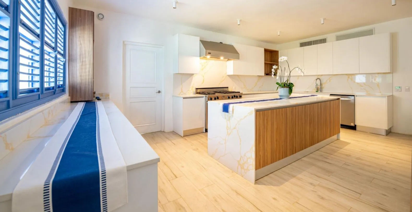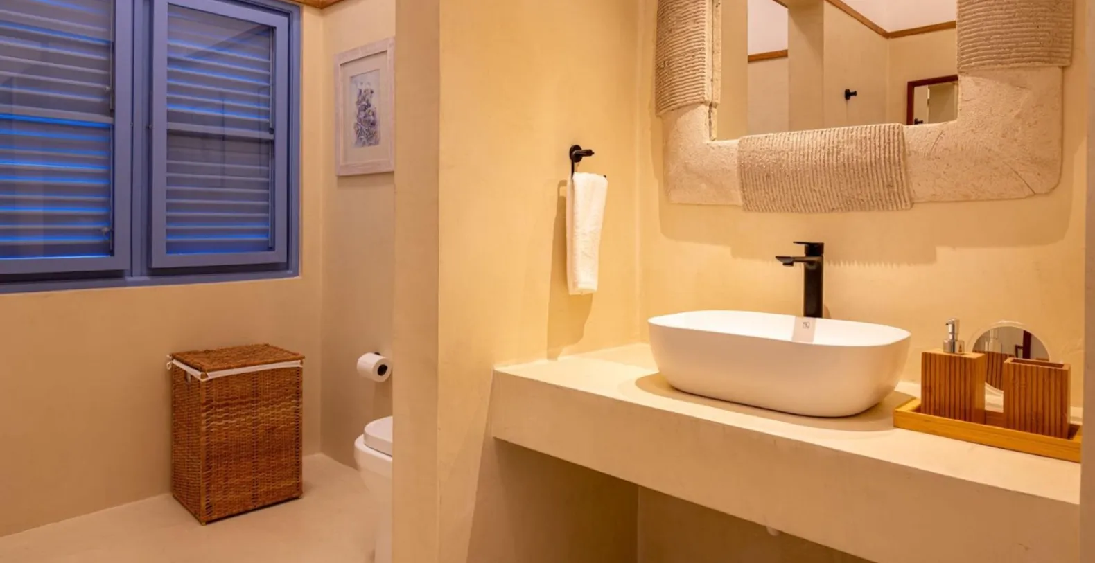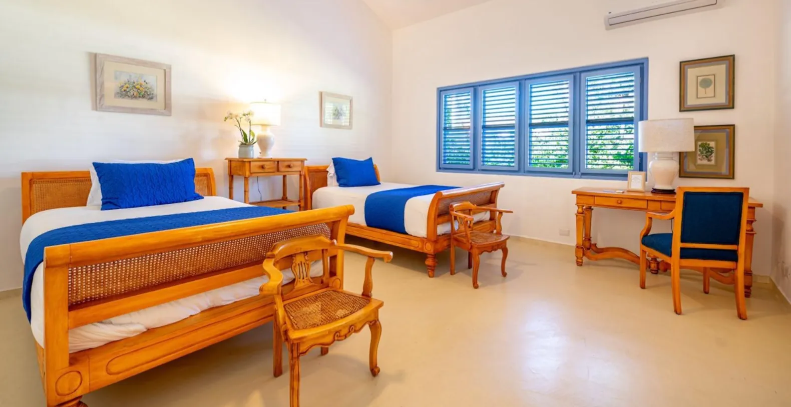Each of the five bedrooms is spacious, air-conditioned, and thoughtfully curated to elevate comfort. Soft, neutral tones pair with warm wood details and large windows that invite natural light and garden views. The master suite enjoys direct access to the terrace and overlooks the ocean, while guest suites provide privacy for those seeking a peaceful retreat. The en-suite bathrooms feel spa-inspired, complete with natural stone details, soaking tubs, and rain showers that bring a sense of tranquility.