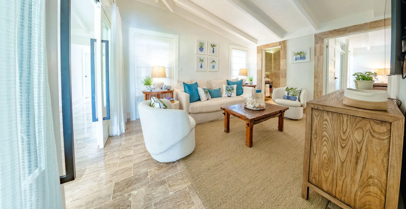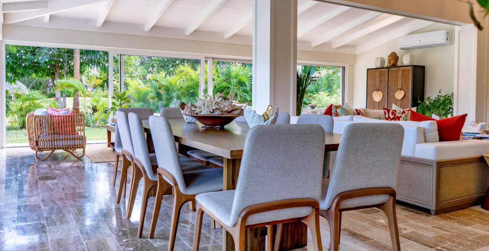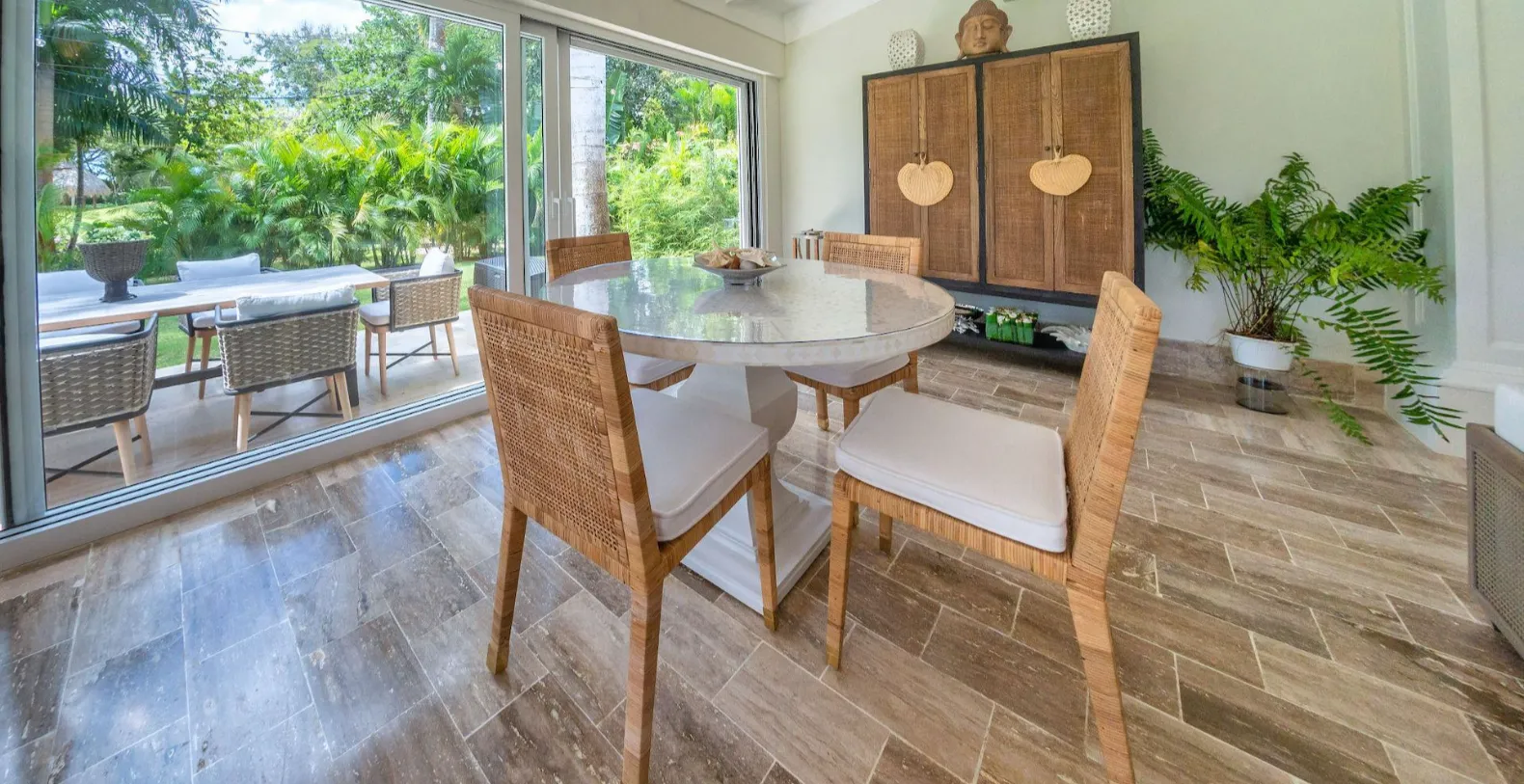 From the moment you arrive, you’ll notice the villa’s fresh décor and beautifully curated details. Soft neutral tones, natural textures, and generous open spaces set the stage for relaxation, while the newly furnished living areas open seamlessly to the gardens and golf course beyond. Step outside to discover one of Villa Uchi’s most charming features: a magical al fresco dining area framed by mature trees and glowing string lights. This intimate outdoor space invites slow breakfasts, sunset cocktails, and unforgettable evening meals surrounded by nature.