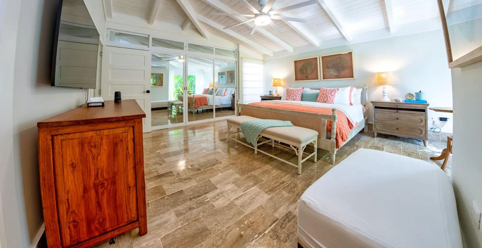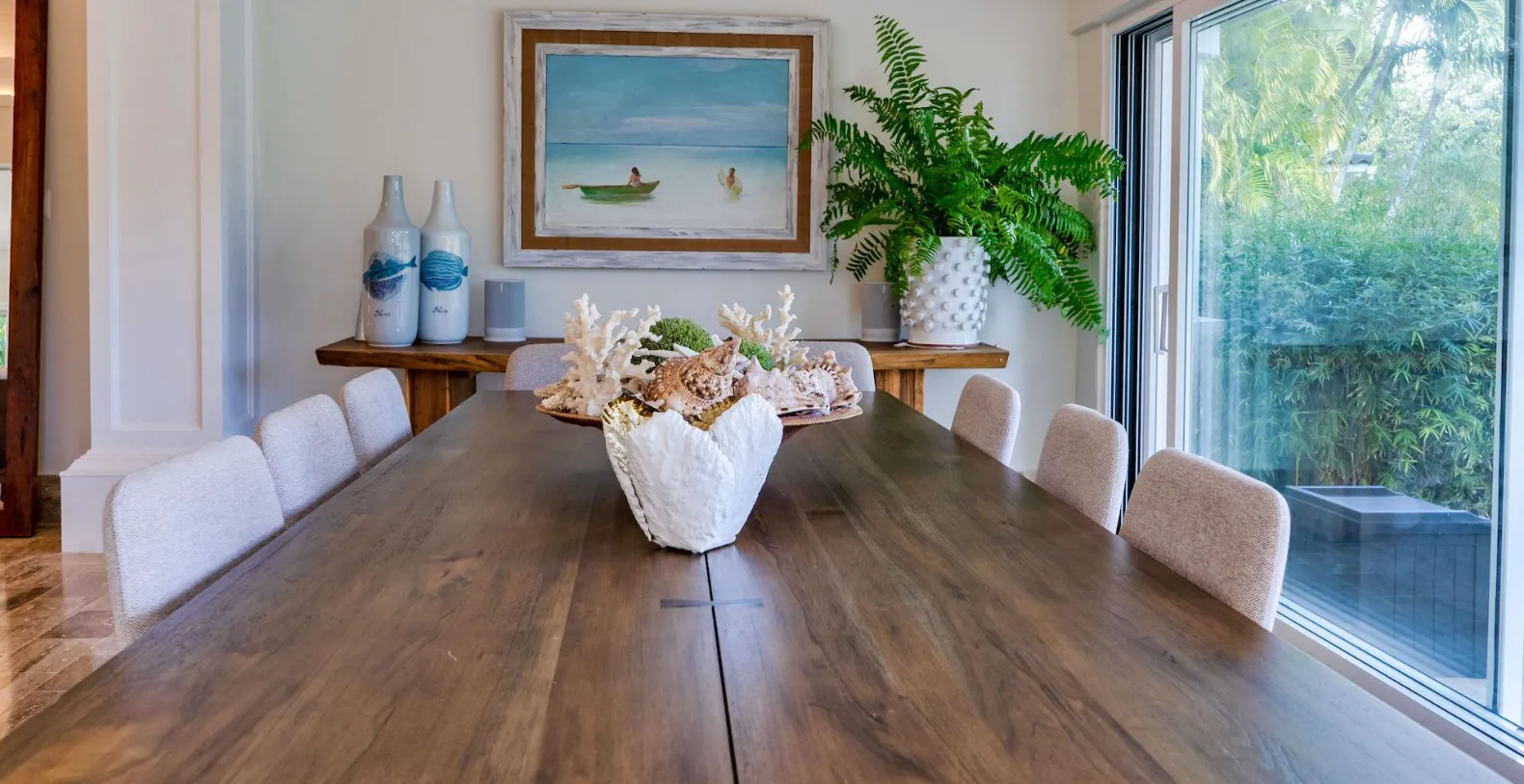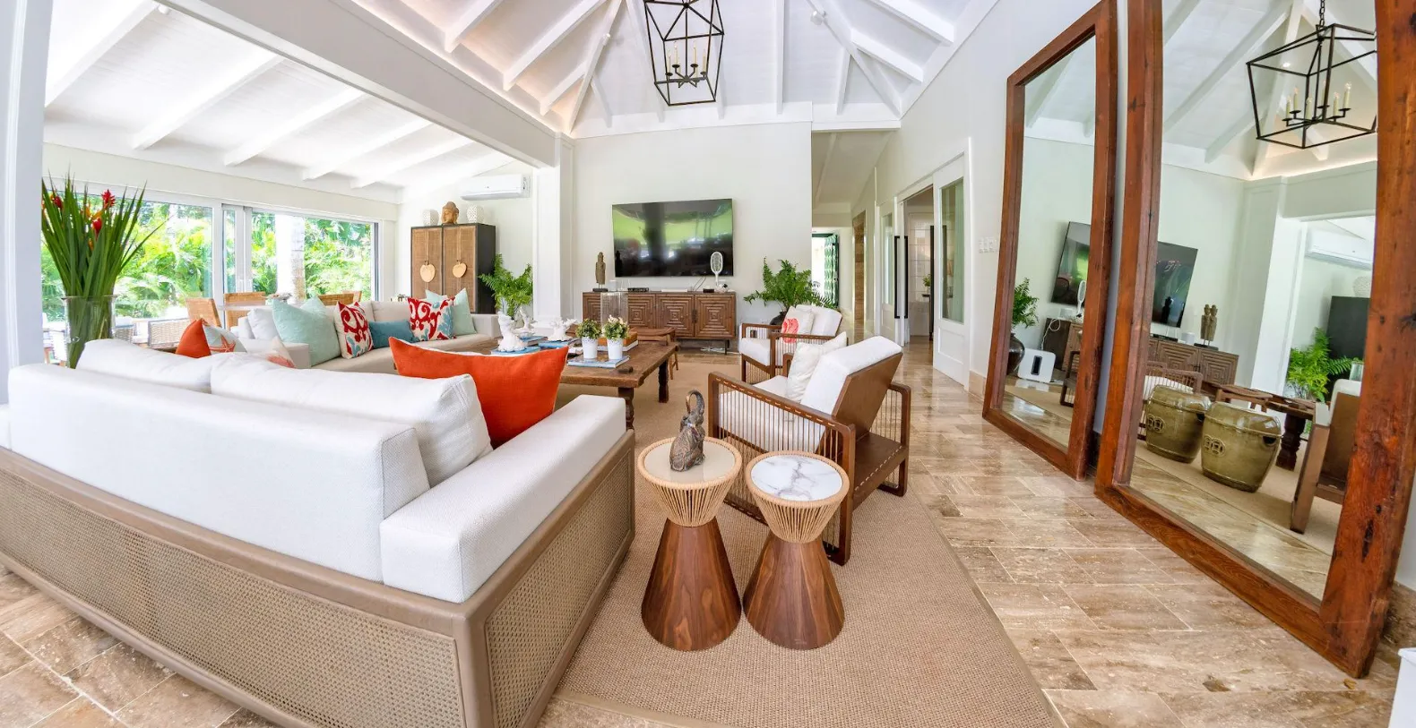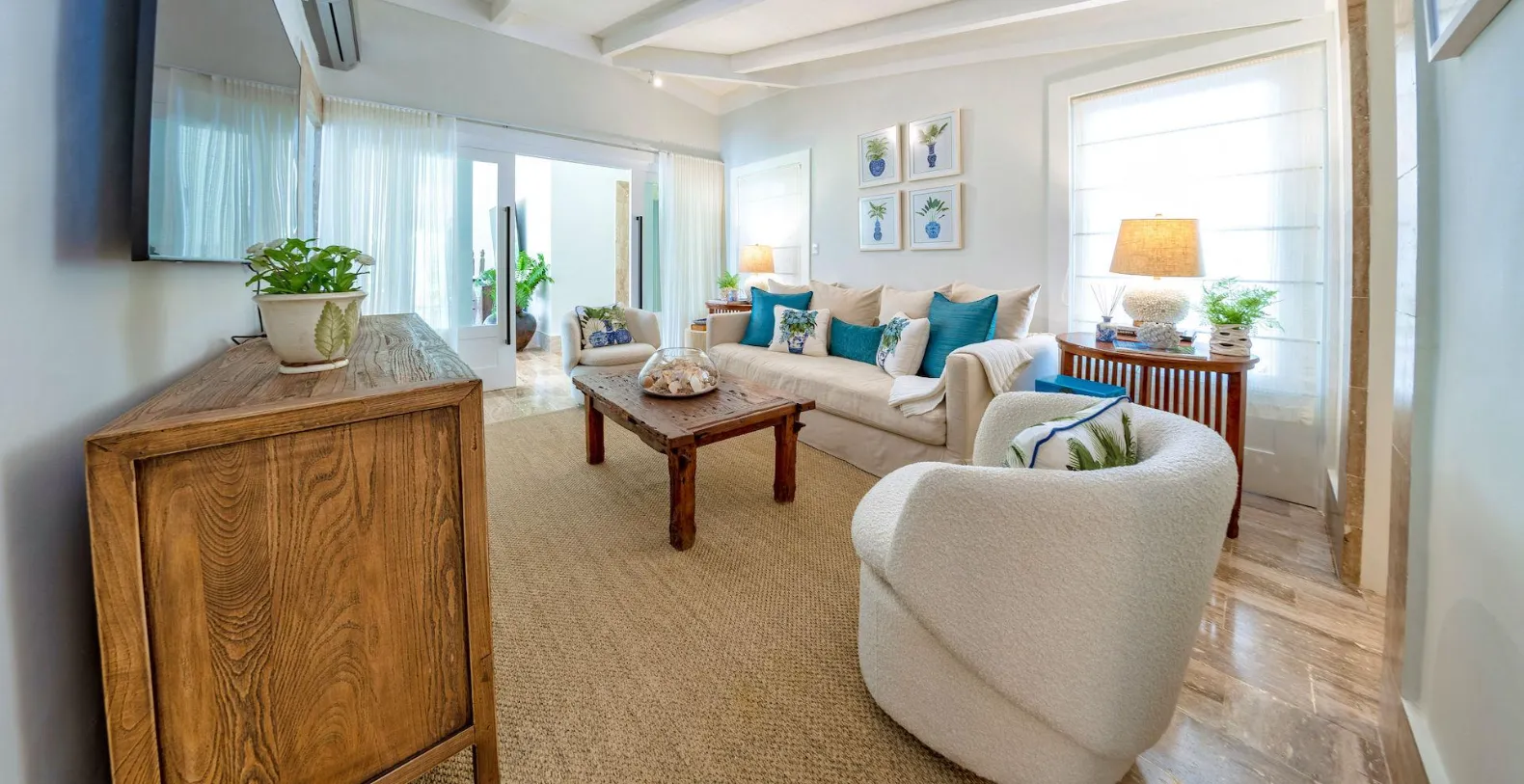 From the moment you arrive, you’ll notice the villa’s fresh décor and beautifully curated details. Soft neutral tones, natural textures, and generous open spaces set the stage for relaxation, while the newly furnished living areas open seamlessly to the gardens and golf course beyond. Step outside to discover one of Villa Uchi’s most charming features: a magical al fresco dining area framed by mature trees and glowing string lights. This intimate outdoor space invites slow breakfasts, sunset cocktails, and unforgettable evening meals surrounded by nature.
