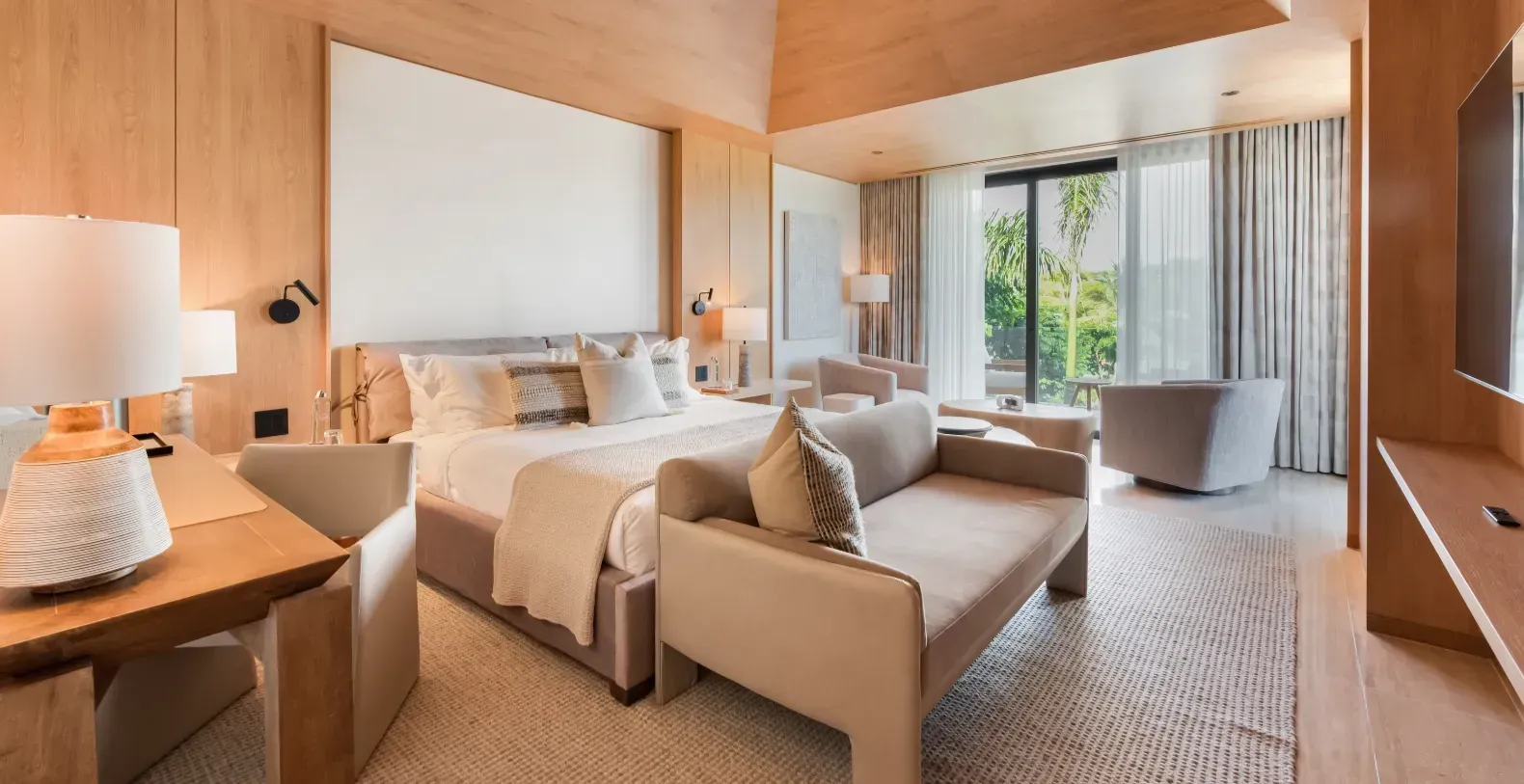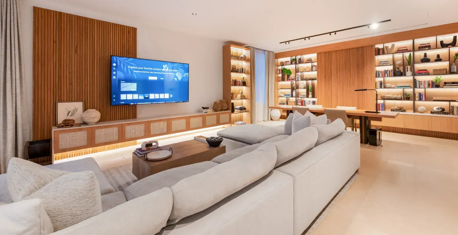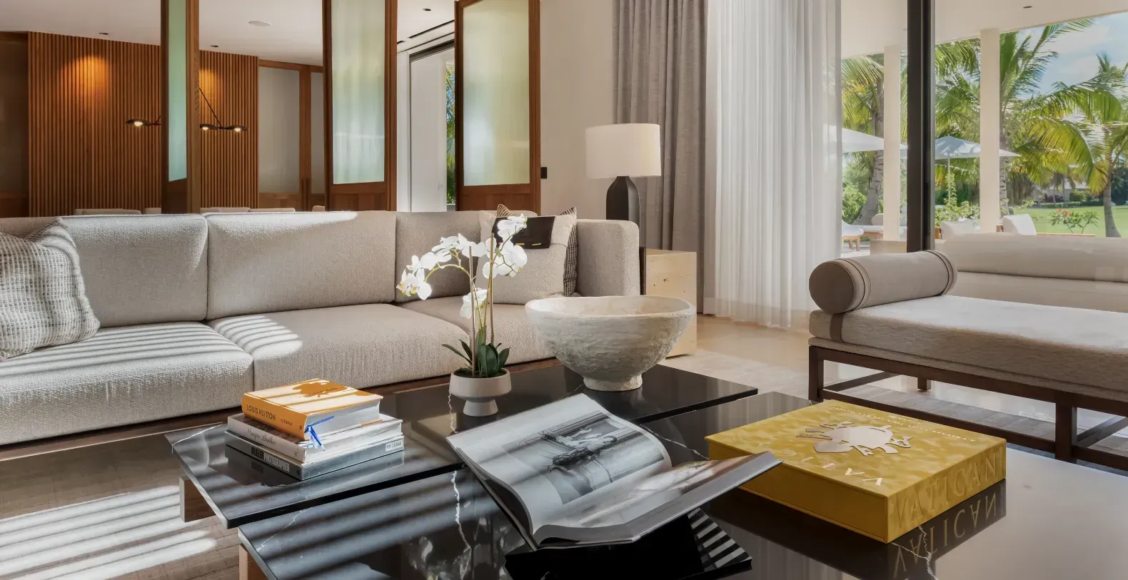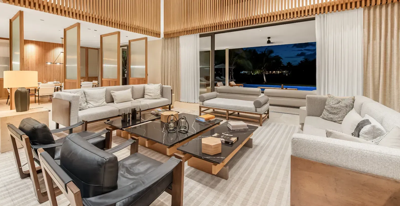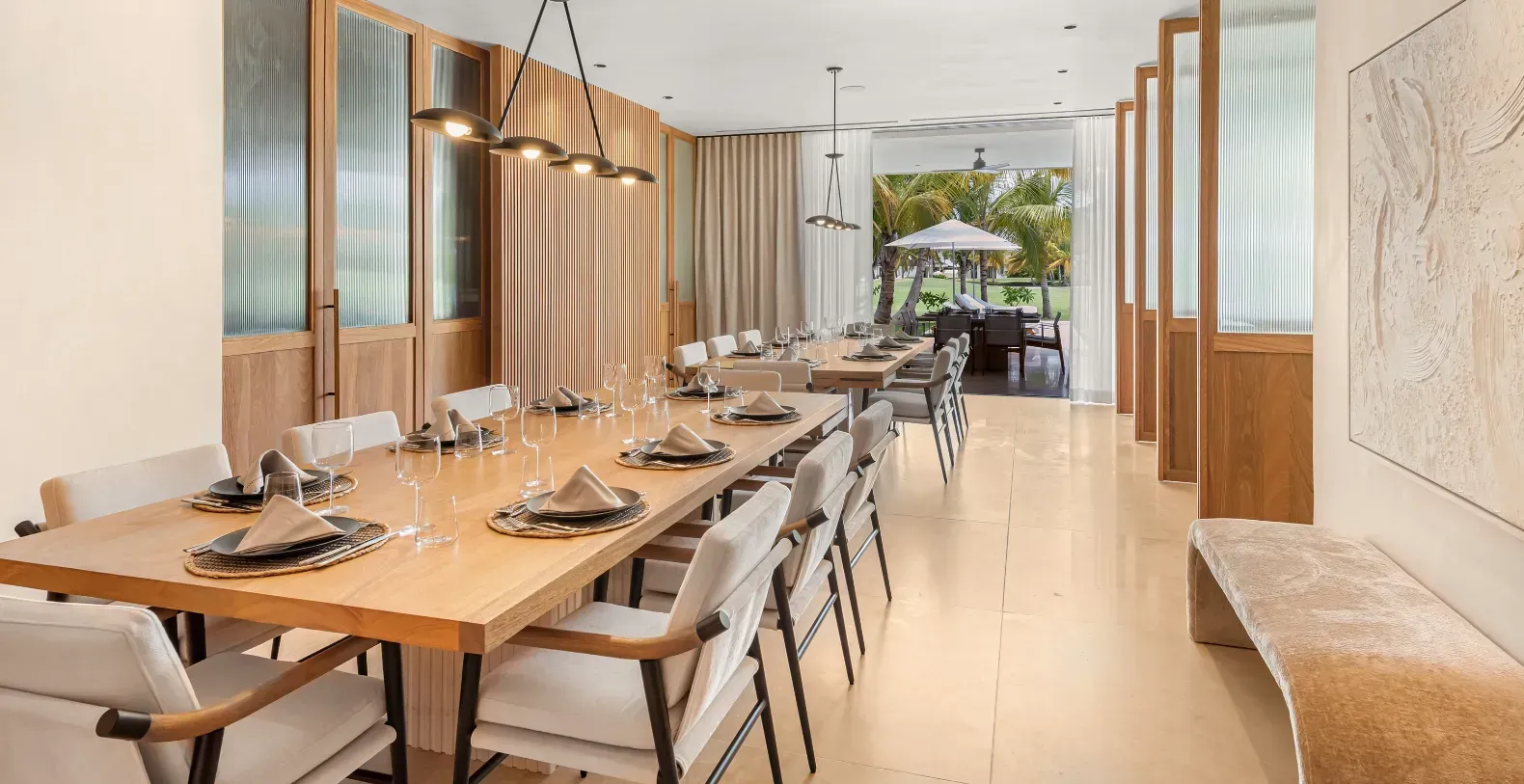 Outdoors, the experience is framed by towering palms and panoramic golf course views. Two swimming pools—a lap pool for morning swims and a leisure pool for afternoon lounging—anchor the villa’s sun-kissed terrace, where plush loungers and shaded seating areas invite you to relax in absolute comfort. Gather for sunset cocktails, enjoy al fresco meals in the covered dining pavilion, or unwind with a spa treatment in your private wellness wing.