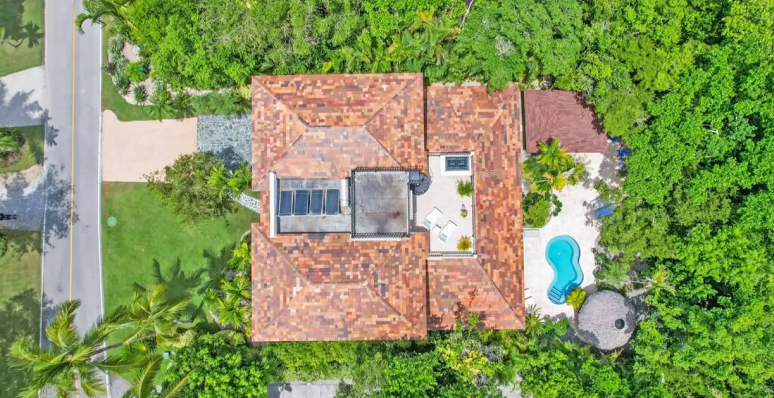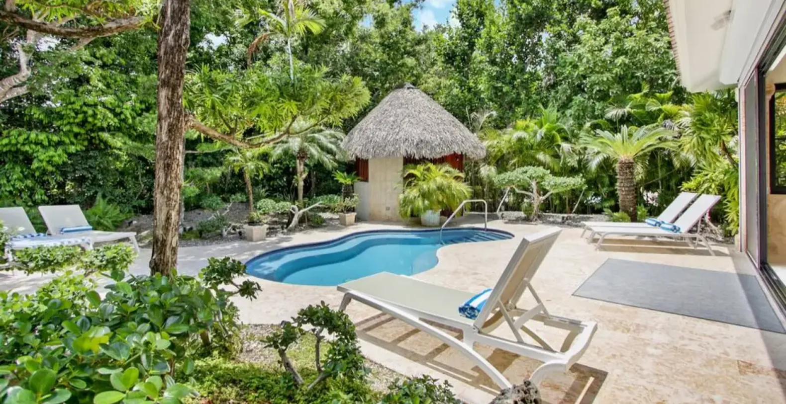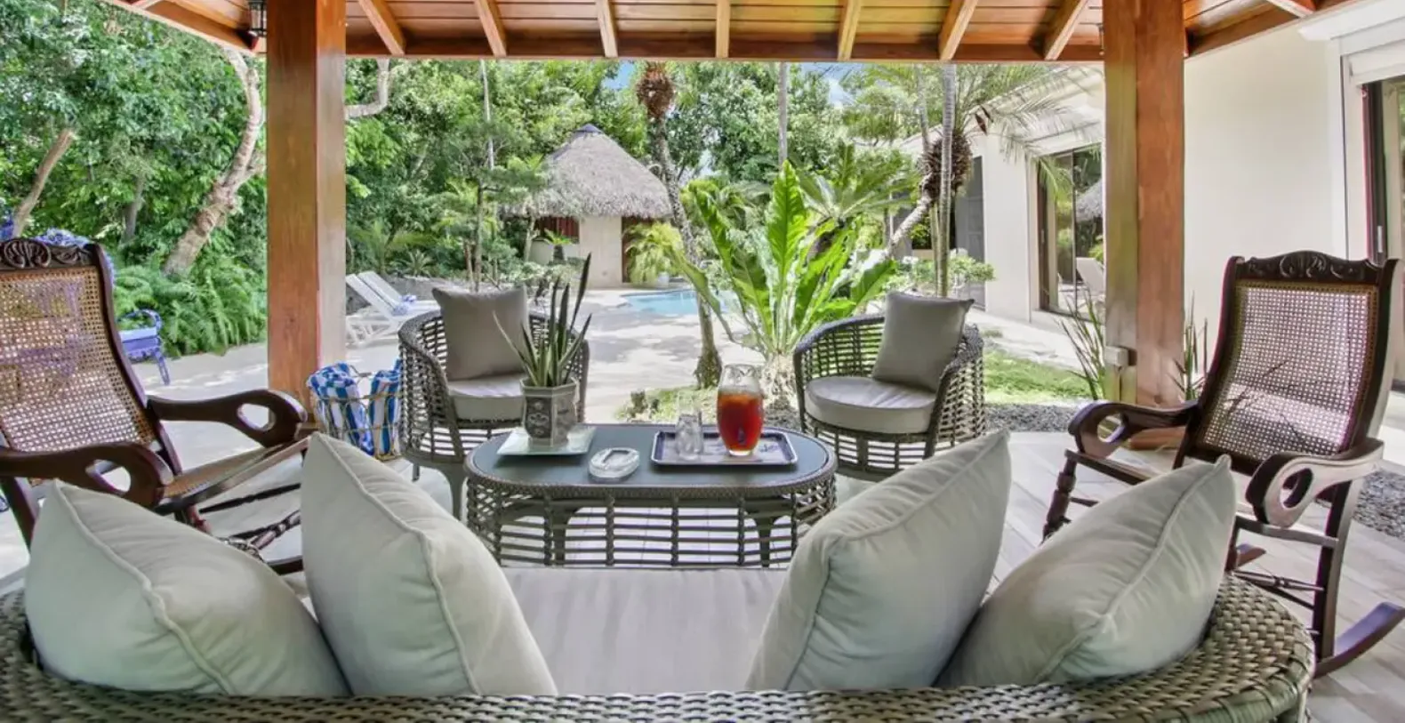 Surrounded by tropical greenery, this two-story villa spans approximately 5,000 square feet and is thoughtfully designed to blend indoor comfort with serene outdoor living. The villa creates a peaceful, almost meditative atmosphere, while the private swimming pool serves as the heart of the outdoor space. The secluded garden area also features a spacious pool deck with lounge chairs, a shaded tiki hut with shower and toilet, and a furnished outdoor terrace.