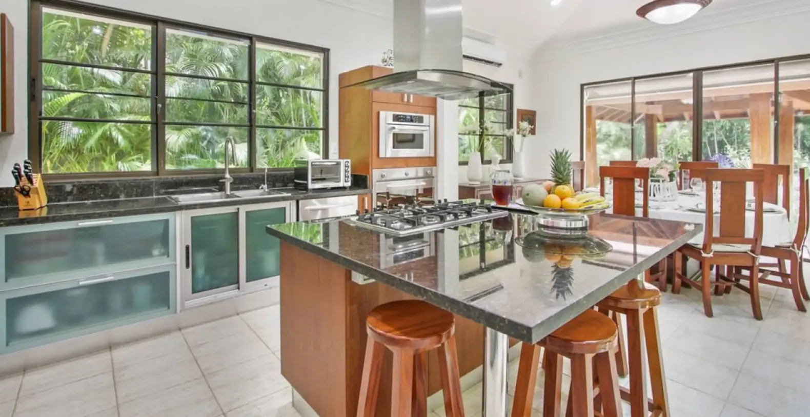Inside, the villa’s interiors feel warm, relaxed, and inviting. The ground floor hosts an open-concept common area that seamlessly combines the living room, dining area, and kitchen, creating a perfect setting for entertaining, family meals, or quiet evenings together. The fully equipped open kitchen allows guests to prepare meals with ease, while those looking to elevate their stay can arrange a private chef experience for an added touch of indulgence.