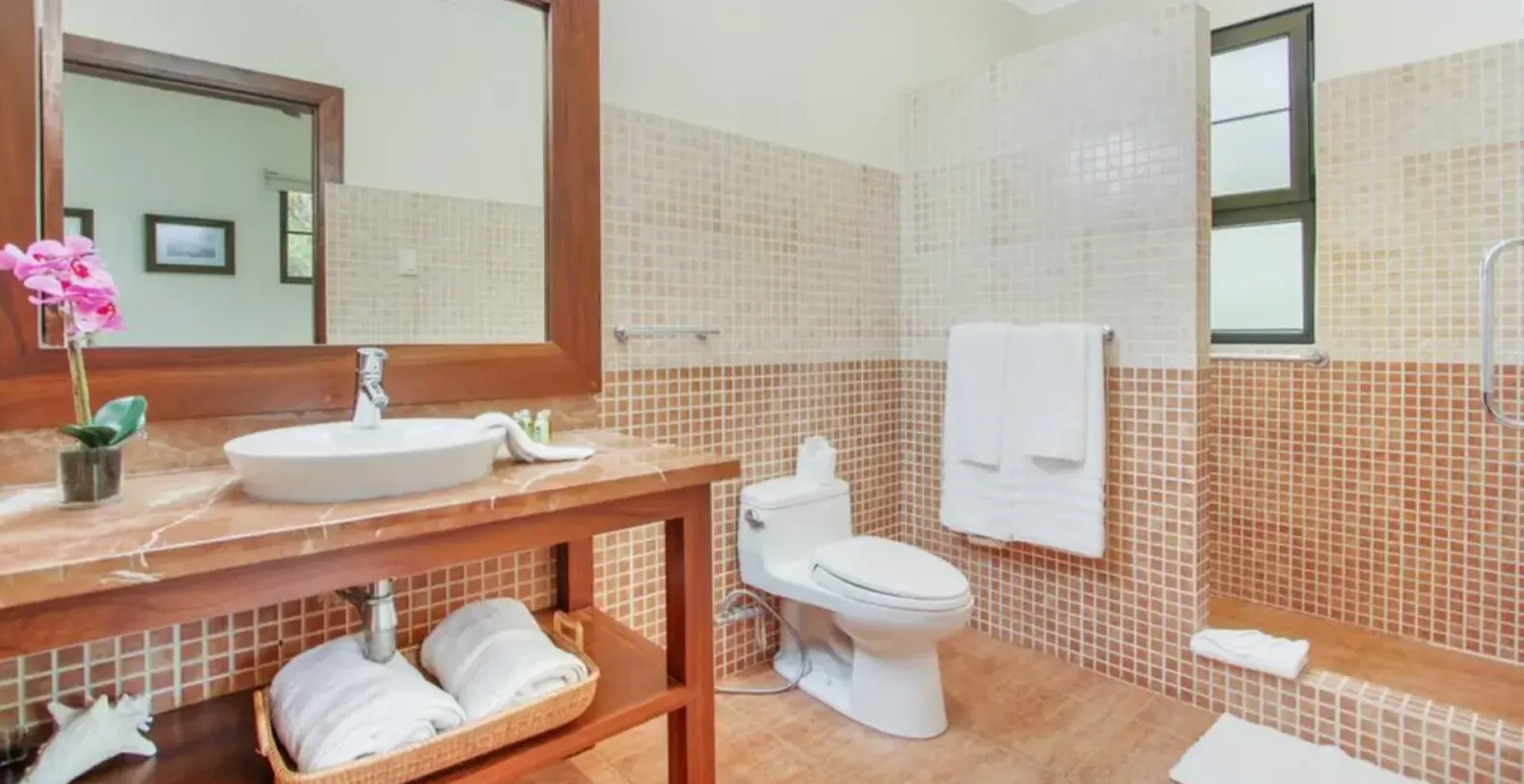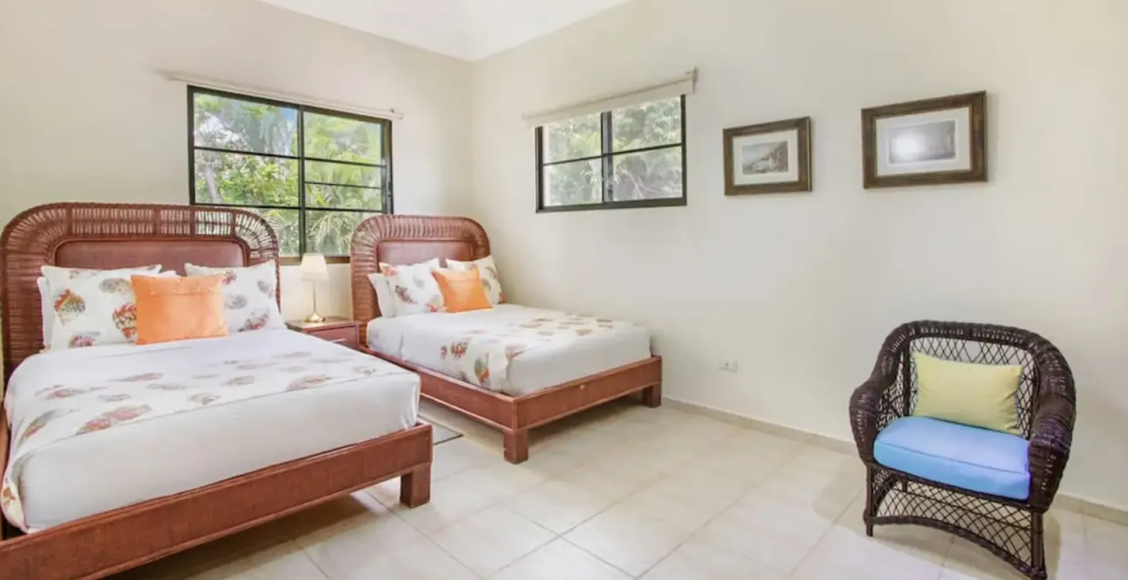 Villa Tortuga B54 accommodates guests across four well-appointed bedrooms, all located on the upper level of the home. Each bedroom is equipped with air-conditioning, ceiling fan, TV, closet, dresser, and a private ensuite bathroom with shower. The bedroom configuration is well suited for families and mixed groups, offering a combination of queen-size beds and full beds to comfortably host a variety of sleeping arrangements.