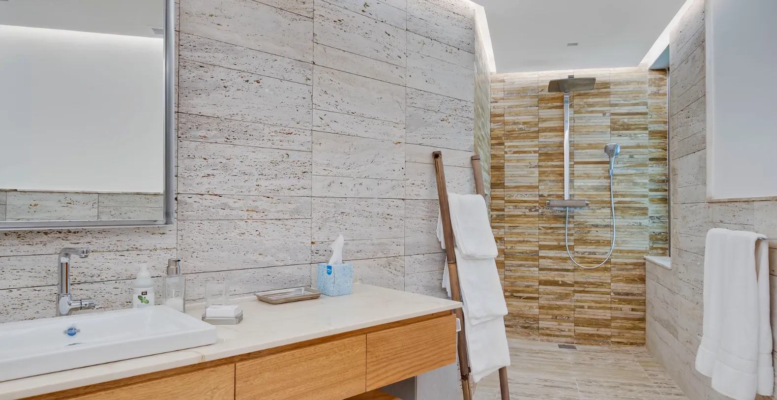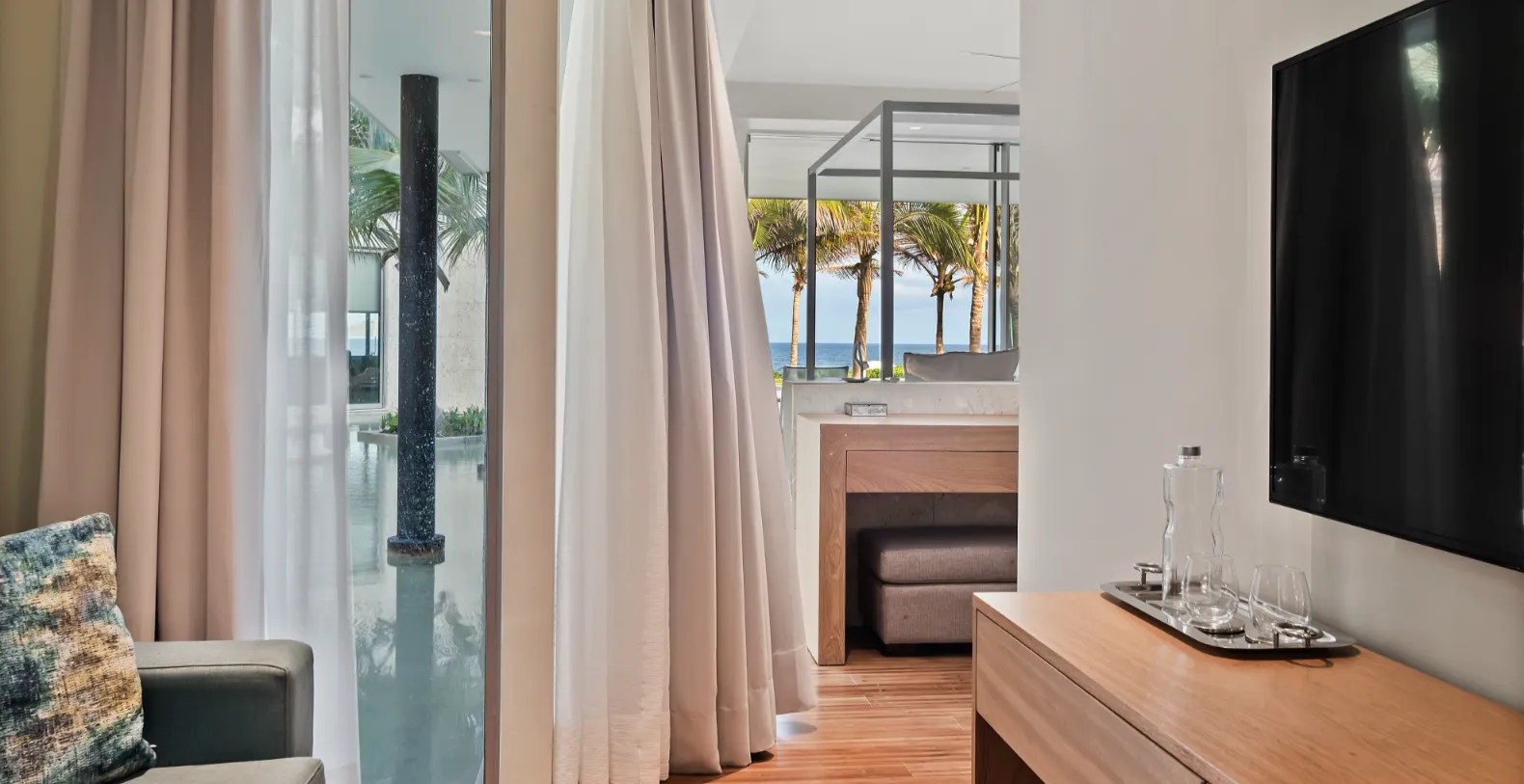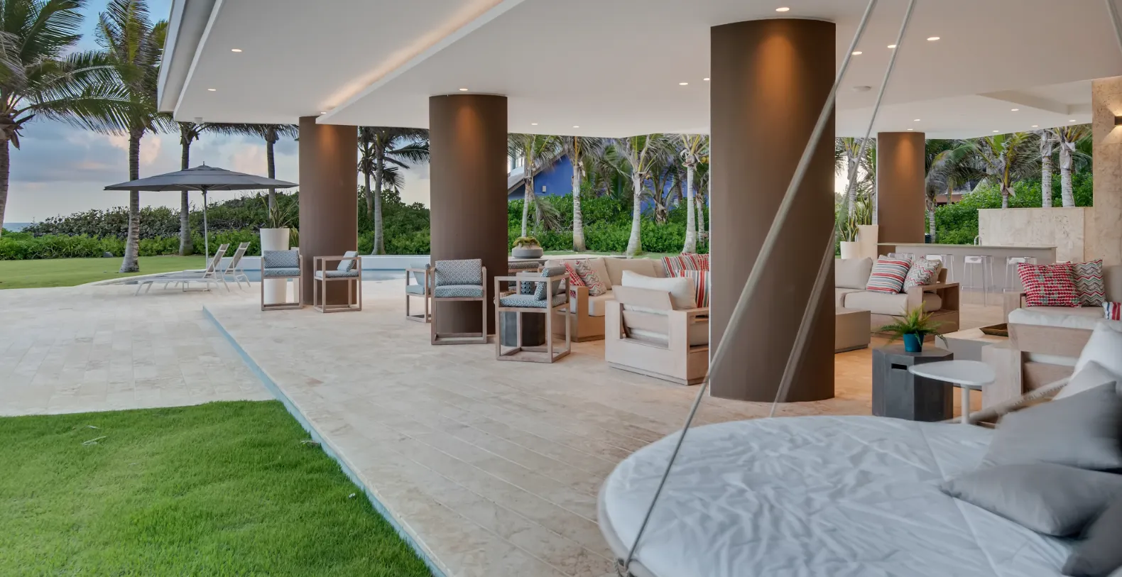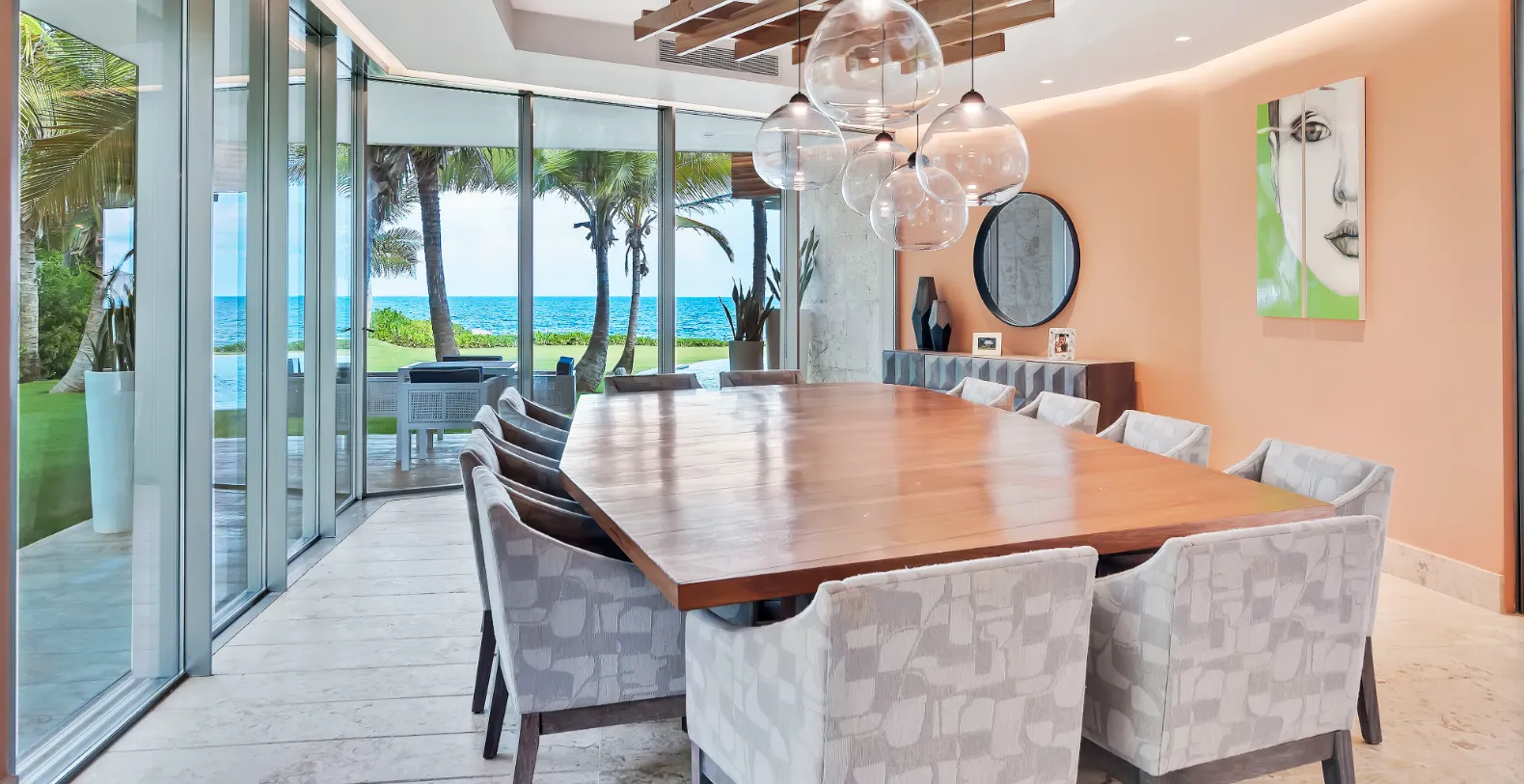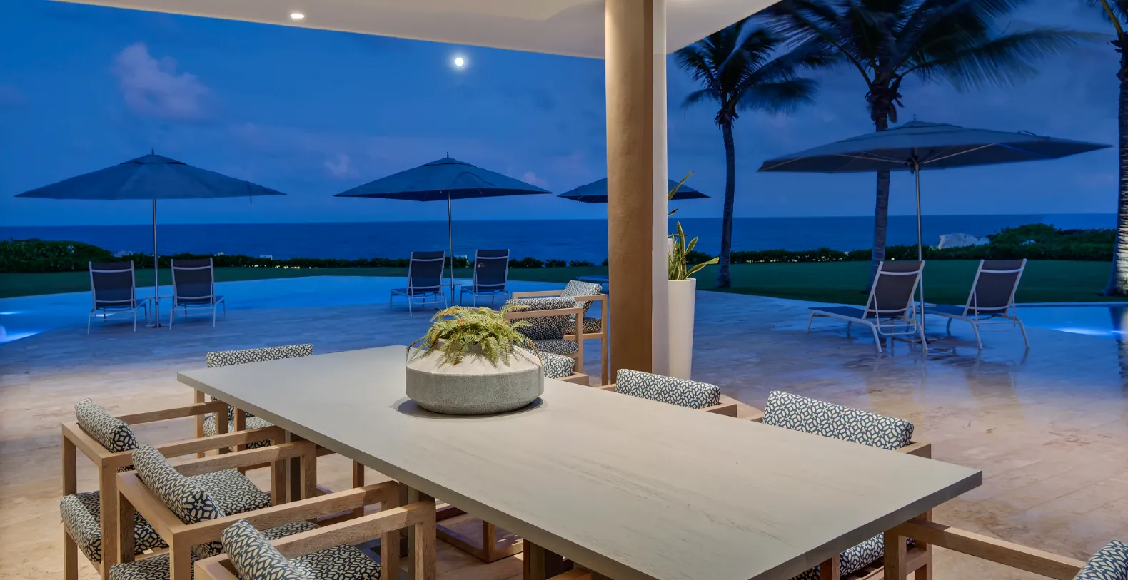 The villa’s seamless indoor-outdoor design frames panoramic ocean views from nearly every corner. Expansive glass walls open to a stunning terrace that hosts a resort-style infinity pool surrounded by palm trees and elegant lounge areas. Whether soaking in the sun, savoring cocktails under the umbrellas, or dining alfresco to the sound of the waves, every moment here feels elevated and effortless.
