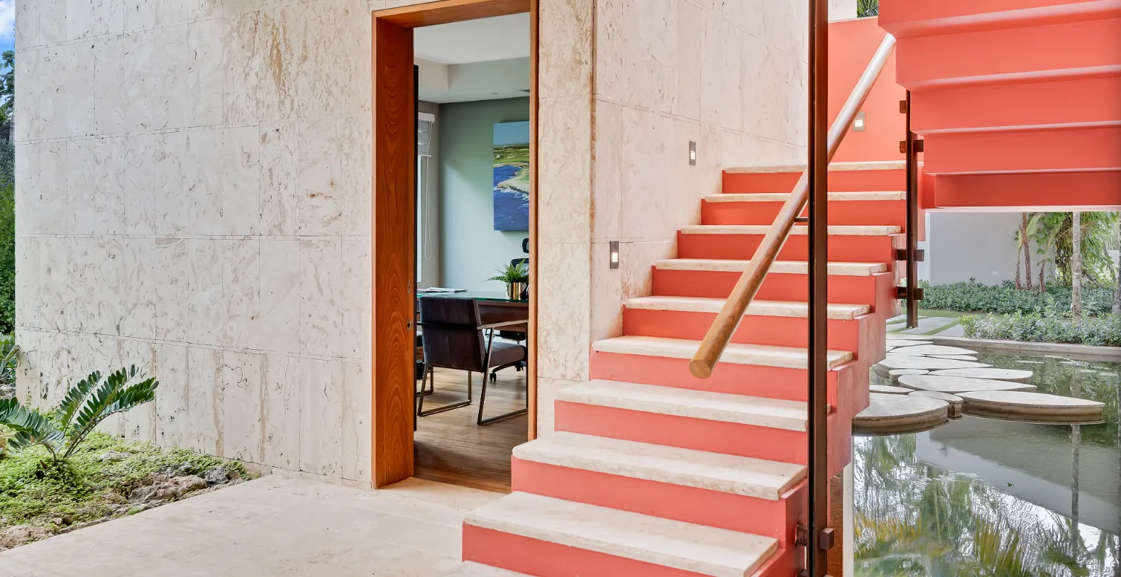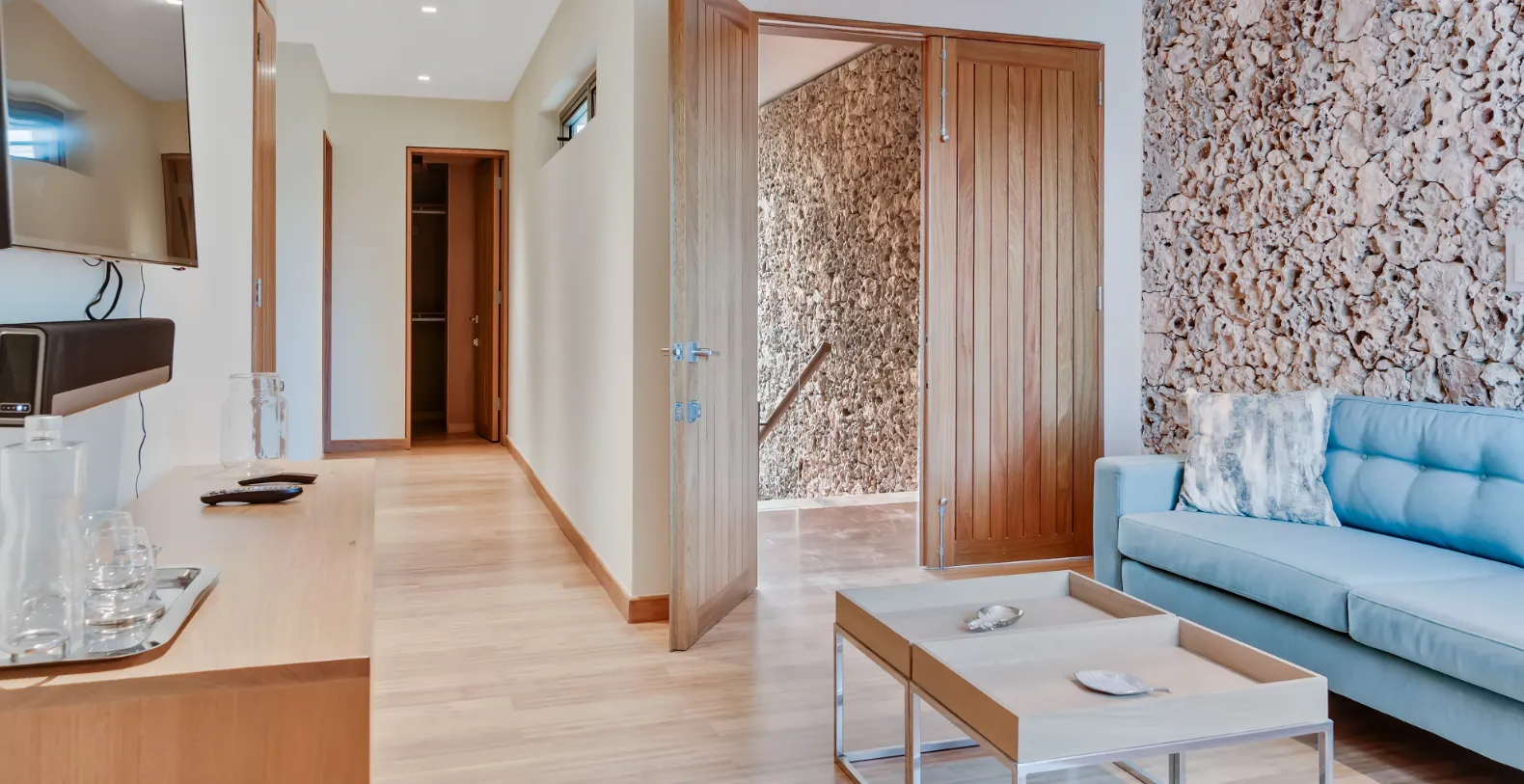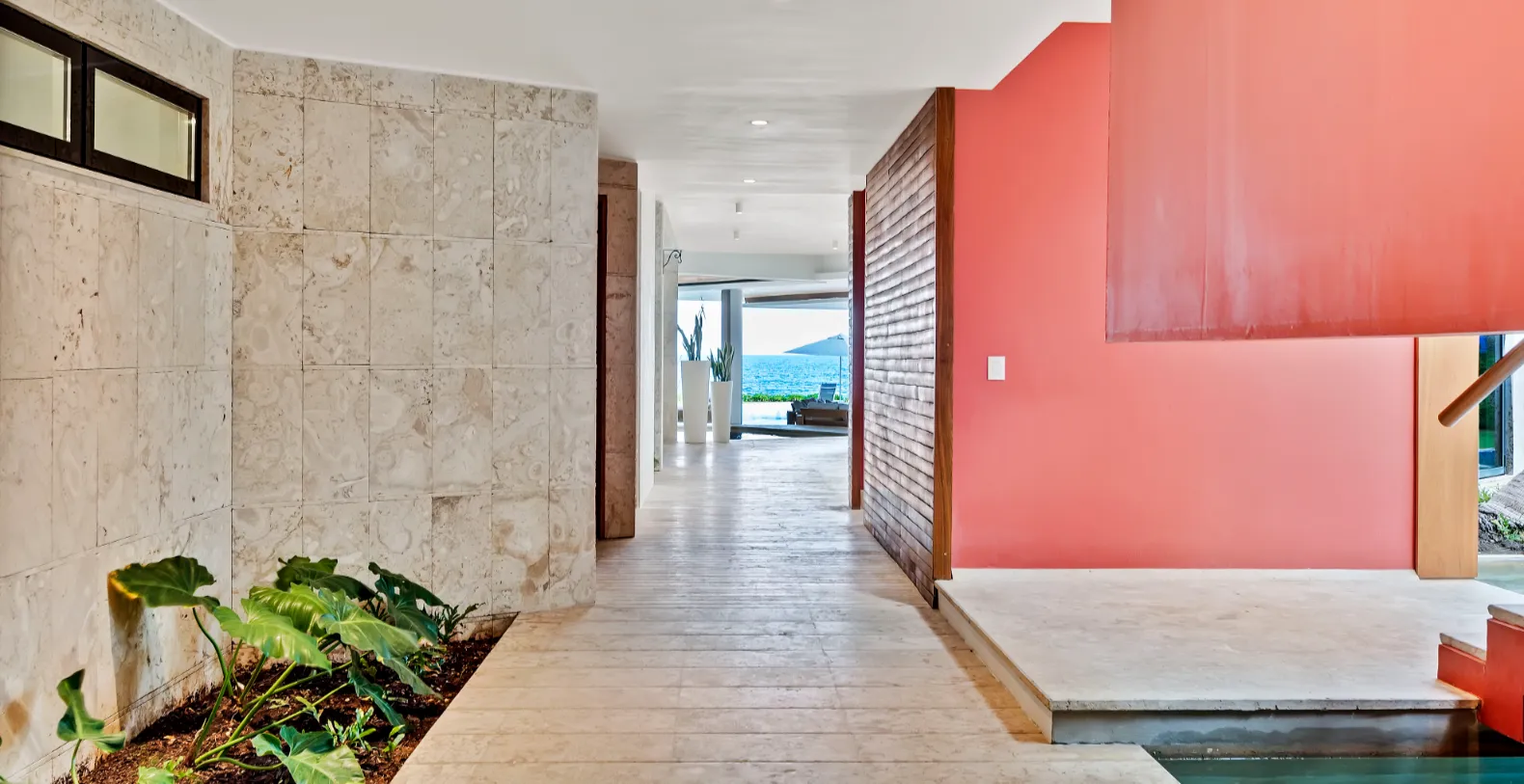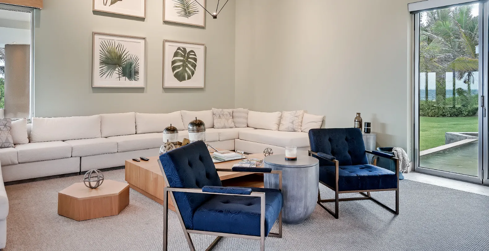 Inside, Villa de Agua exudes refined coastal sophistication. The open-plan living and dining areas are bathed in natural light and furnished with contemporary décor in soft neutrals and aquamarine tones. A gourmet kitchen equipped with high-end stainless-steel appliances invites culinary creativity, while the formal dining room offers ocean views that make every meal unforgettable.