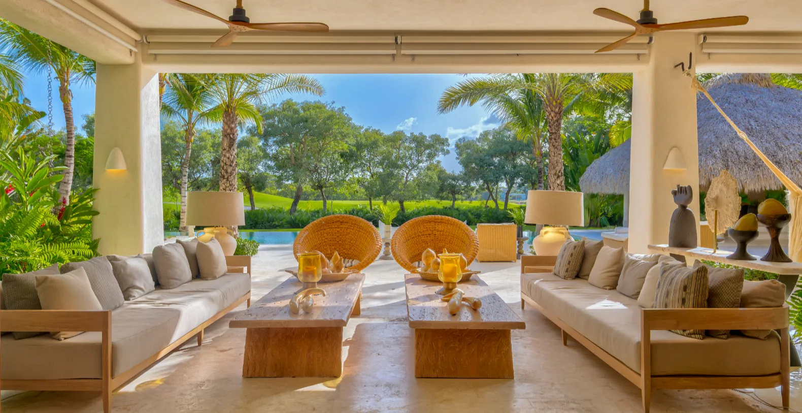 Whether with family or friends, you will find everything you need to enjoy, relax and recharge your batteries in this unique and surprising two-story villa that has five bedrooms with en-suite bathrooms, three of them with beautiful terraces, all surrounded of vegetation and natural light. Treat yourself and enjoy all the advantages of its spacious double-view living room; to the interior patio with whispering water fountains and to the lush garden of coconut trees and oaks with an open panoramic view of the golf course and the swimming pool. The second floor has a comfortable work and study area with a large two-seater desk and a library with an exquisite collection of large-format fashion, art, jewelry and travel photographic books and a large chaise longue sofa in front of a television 80 inches. High speed Wi-Fi in every corner of the house. Musical home automation through the home's Wi-Fi controllable from the phone with High Quality speakers in the main social areas of the house, swimming pool, gazebo, living room, interior garden, porch and terrace.