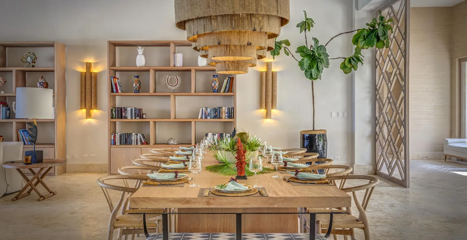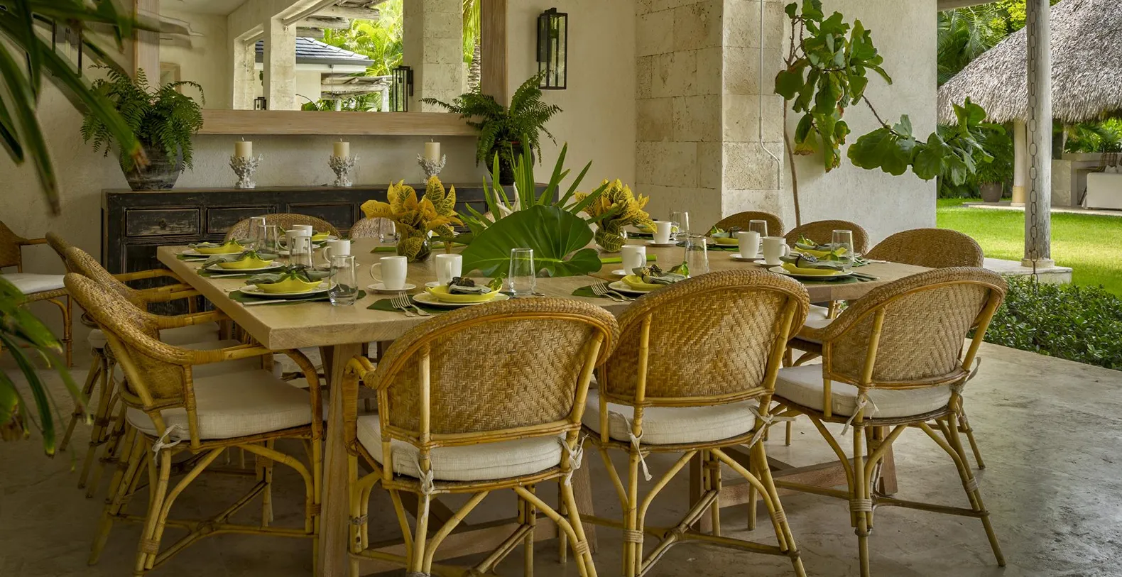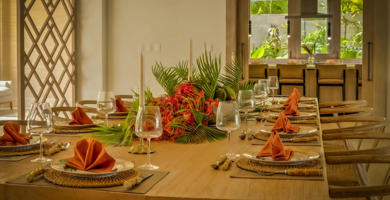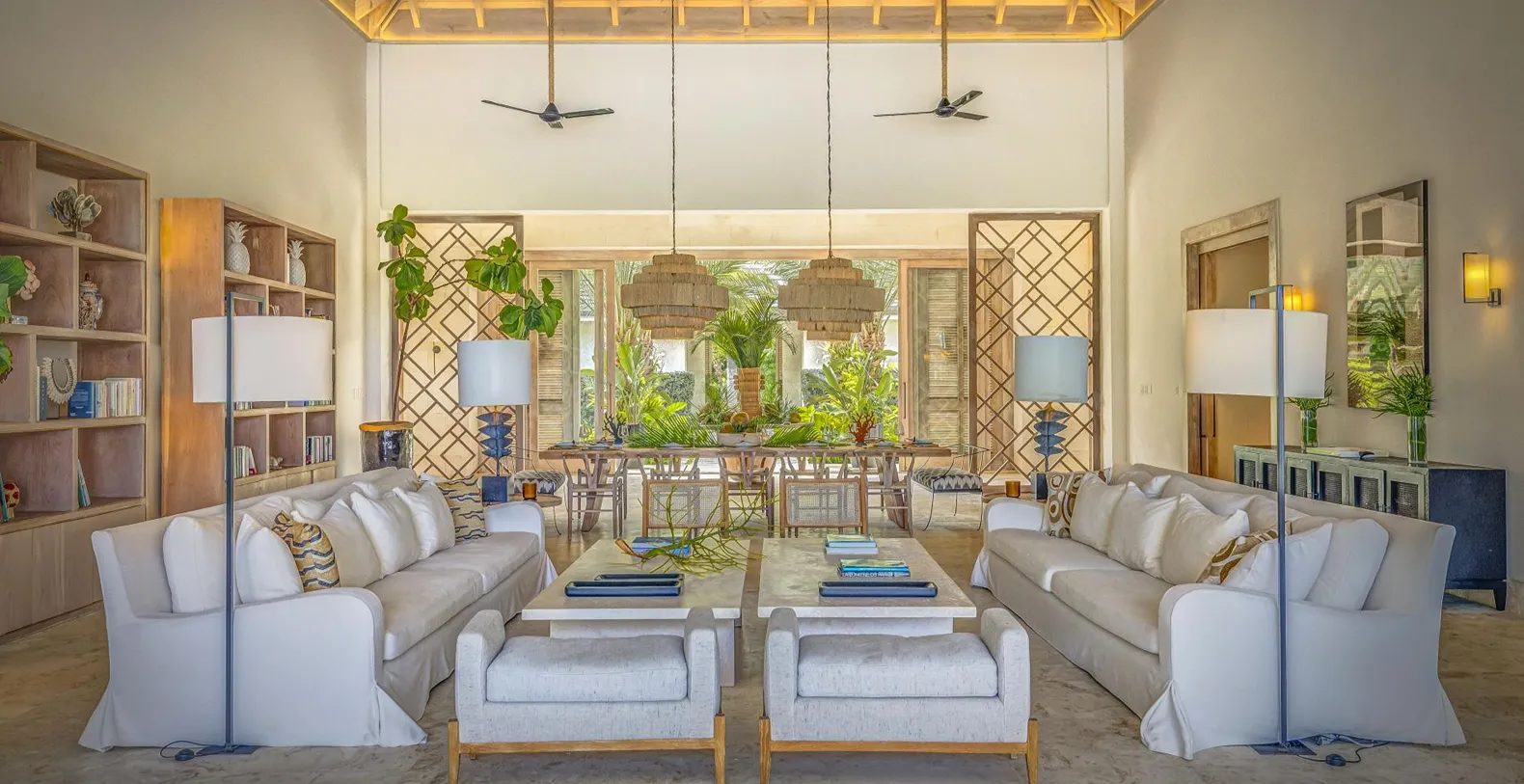 Inside, Villa Chez Moi impresses with airy interiors, natural textures, and thoughtfully designed common spaces that feel both luxurious and inviting. The open-concept living and dining areas flow effortlessly into each other, with comfortable lounges, curated decor, and warm lighting that creates a serene ambiance throughout. Whether enjoying a movie night in the cozy media room, gathering for a chef-prepared meal around the grand dining table, or sipping a morning espresso in the stylish kitchen, every moment at Chez Moi is a moment of pleasure. The villa houses seven air-conditioned bedrooms on the ground floor, each featuring luxury king- or queen-size bedding with premium linens, ensuite bathrooms, and in-room TVs to ensure maximum privacy and comfort for up to 14 guests.