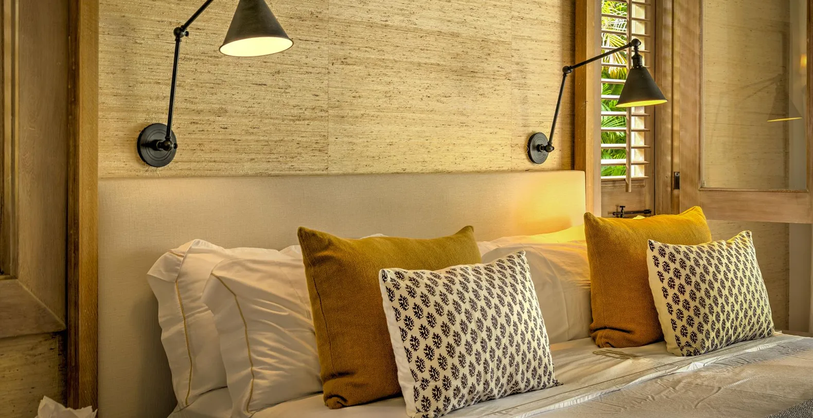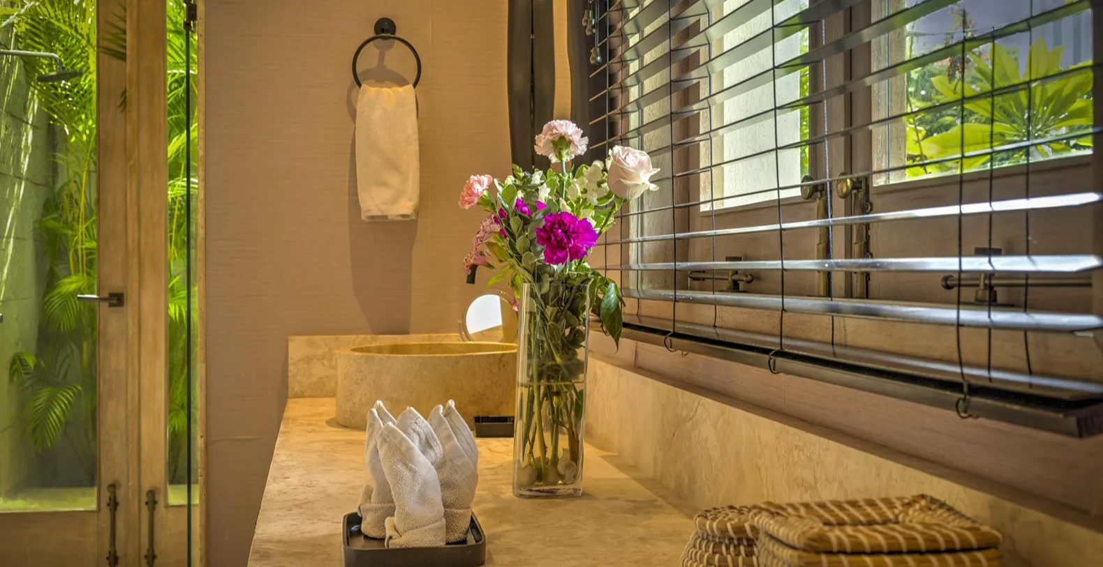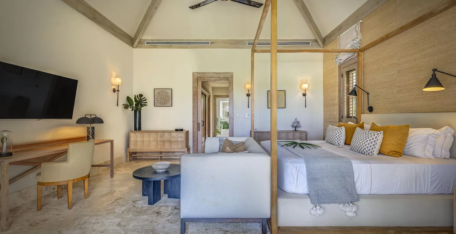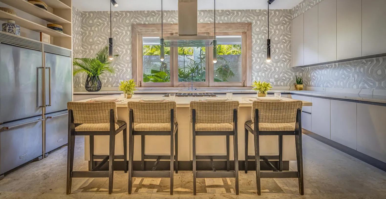 Inside, Villa Chez Moi impresses with airy interiors, natural textures, and thoughtfully designed common spaces that feel both luxurious and inviting. The open-concept living and dining areas flow effortlessly into each other, with comfortable lounges, curated decor, and warm lighting that creates a serene ambiance throughout. Whether enjoying a movie night in the cozy media room, gathering for a chef-prepared meal around the grand dining table, or sipping a morning espresso in the stylish kitchen, every moment at Chez Moi is a moment of pleasure. The villa houses seven air-conditioned bedrooms on the ground floor, each featuring luxury king- or queen-size bedding with premium linens, ensuite bathrooms, and in-room TVs to ensure maximum privacy and comfort for up to 14 guests.