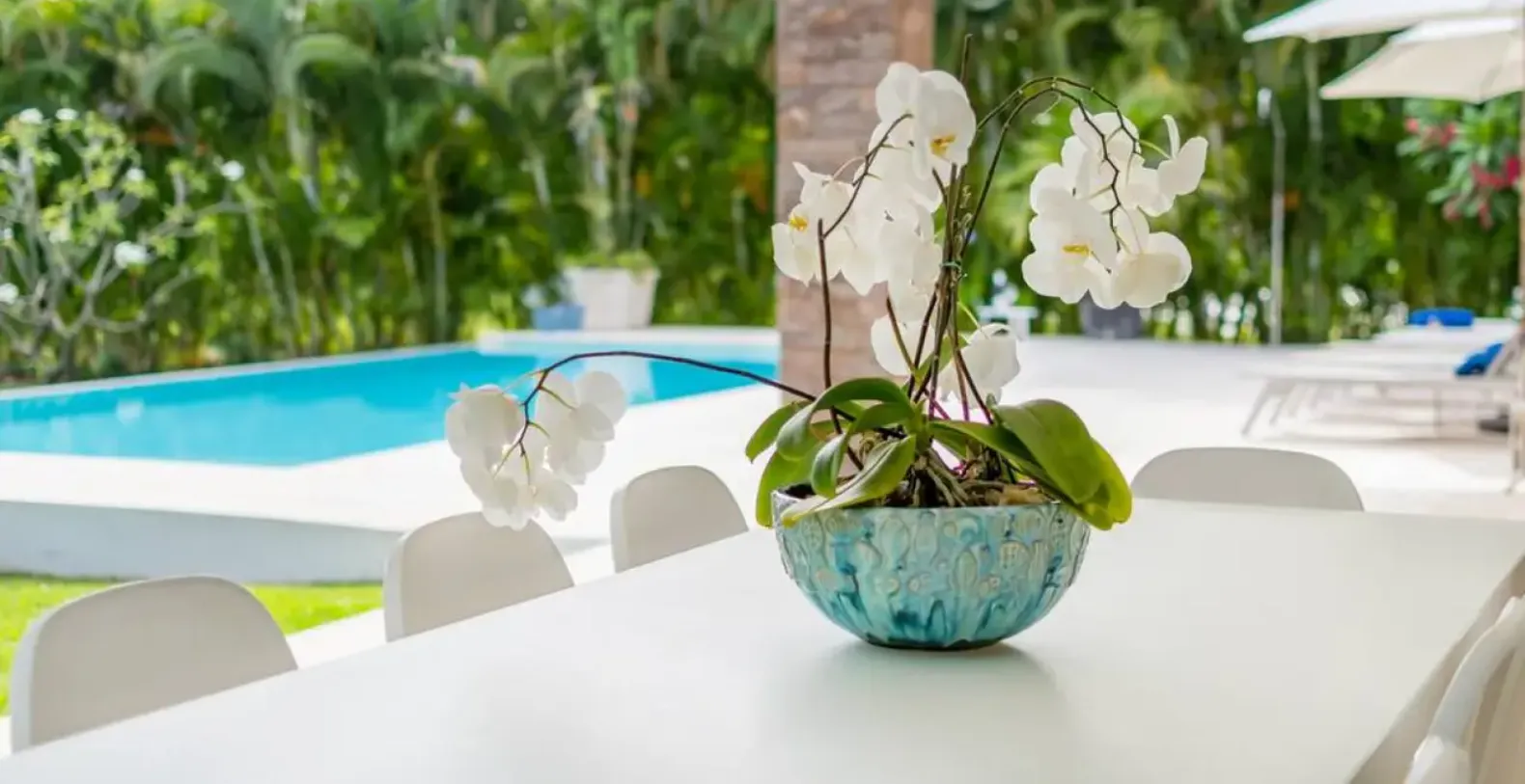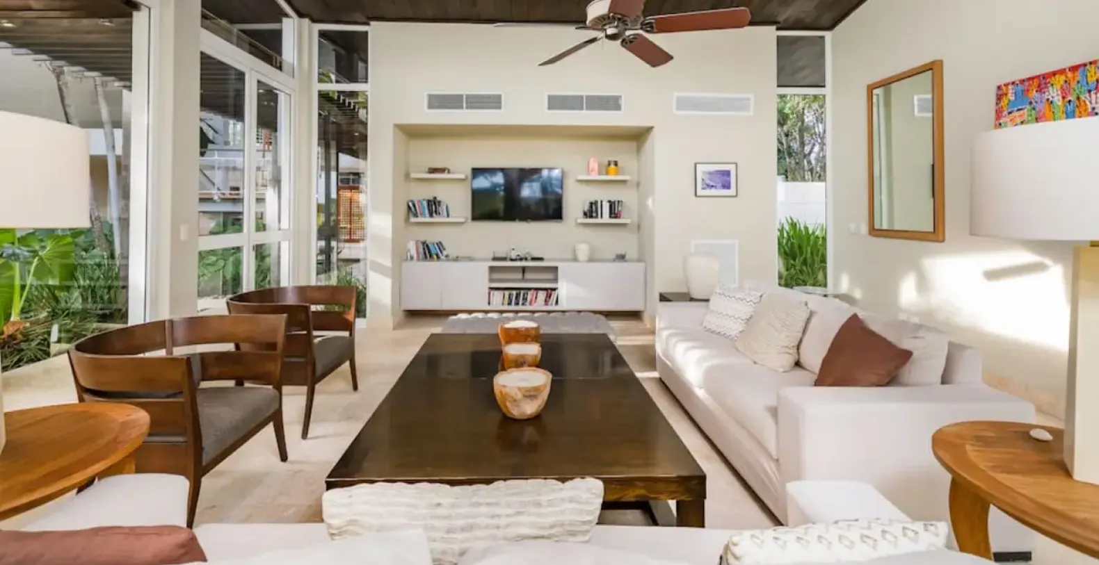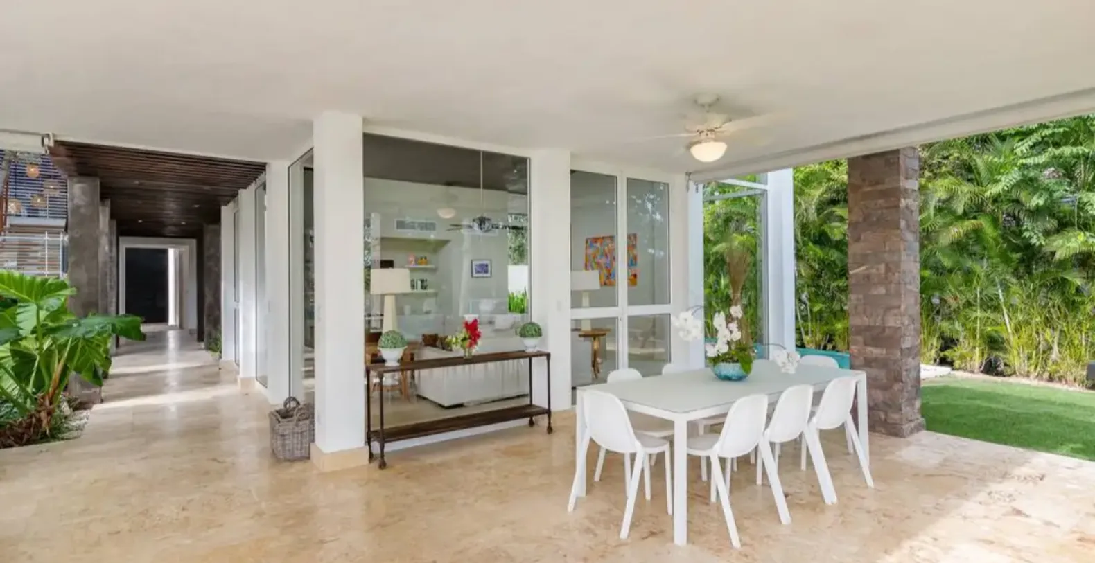 The architectural design centers around a lush inner garden filled with palm trees and white-stone pathways, creating a tranquil, Zen-like setting. The open layout flows seamlessly from the grand entrance through airy living areas to the outdoor terrace, pool, and private lawn. The outdoor spaces are designed for relaxation and entertainment — lounge chairs surround the inviting pool, and a shaded terrace provides an ideal spot for outdoor dining. A half basketball court and wide grassy lawn offer extra fun for families and groups. Inside, the villa’s bright living room features floor-to-ceiling windows, plush seating, a flat-screen TV, ceiling fans, and carefully curated details that enhance its warm, welcoming atmosphere.