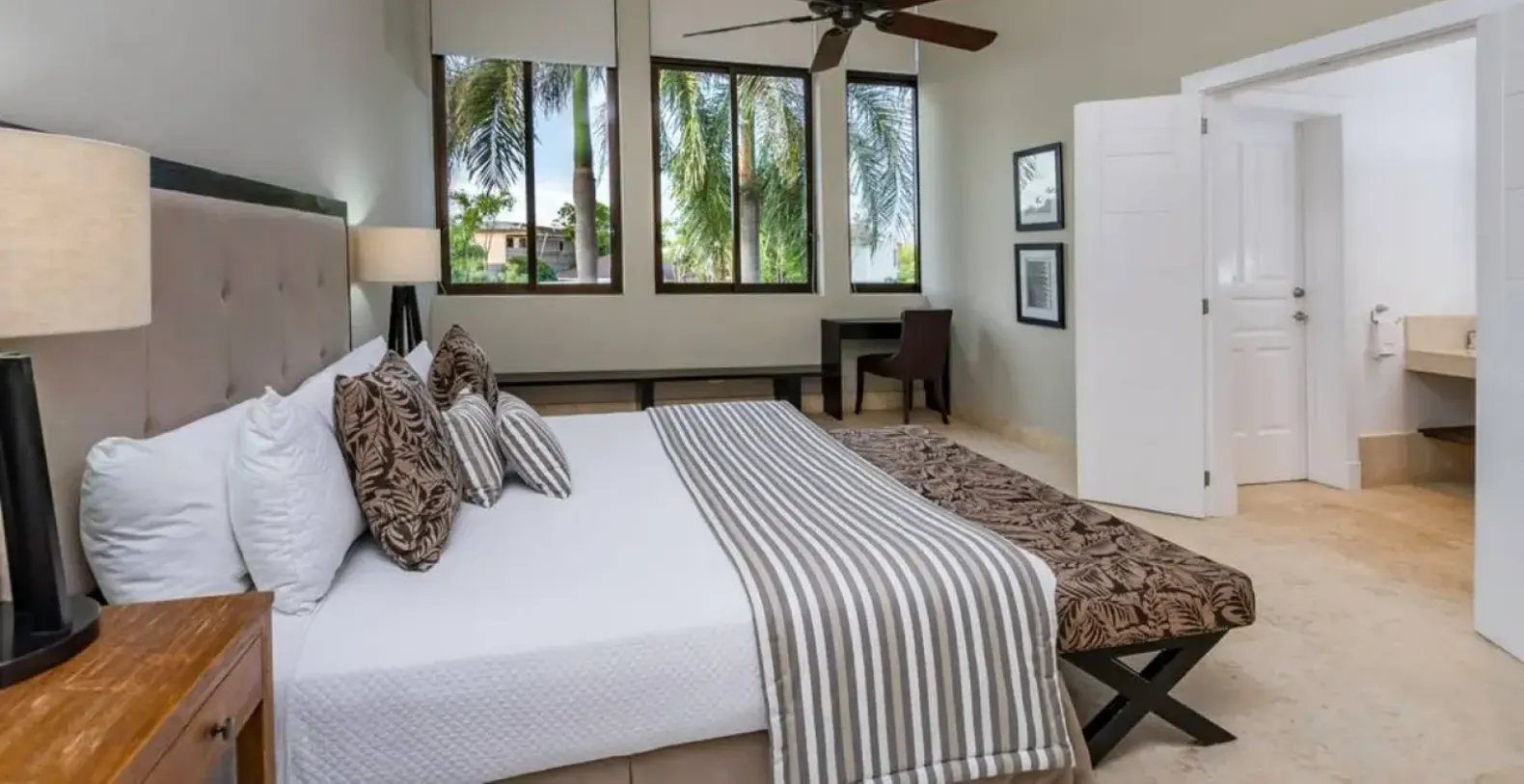 The sleek modern kitchen comes fully equipped with premium appliances and a central island for casual dining or meal prep. Guests can also request the services of a private chef to enjoy gourmet meals without lifting a finger. Villa La Palapa offers five beautifully appointed bedrooms and 5.5 bathrooms, including a luxurious primary suite with a private balcony overlooking the gardens. Two bedrooms are conveniently located on the ground floor, while three sit upstairs, ensuring comfort and privacy for all guests.