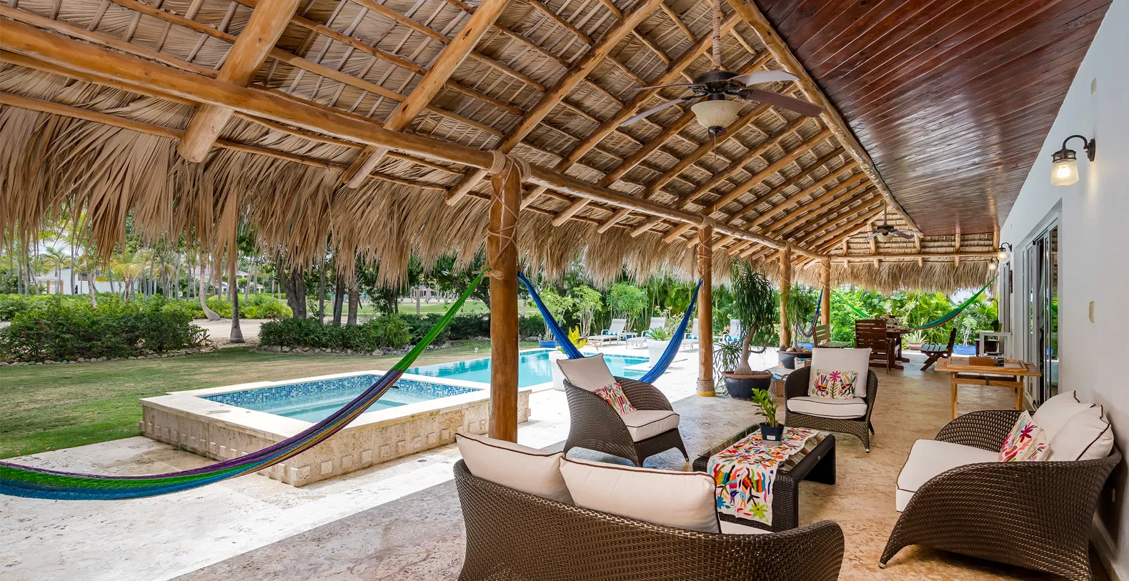 Villa Los Ensueños is located on a quiet street (a cul-de-sac) and right on the La Cana golf course; a 27-hole championship golf course designed by P. B. Dye, with 4 oceanfront holes and 14 holes with ocean views. From the large palm leaf covered terrace and swimming pool area, you have a view of the golf course but still enough privacy that you won’t be disturbed.