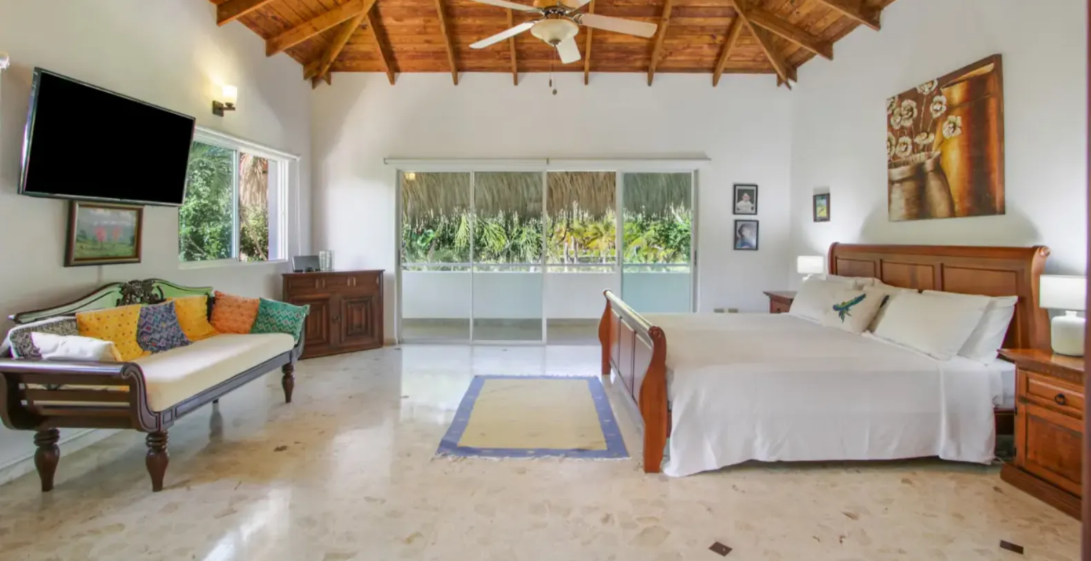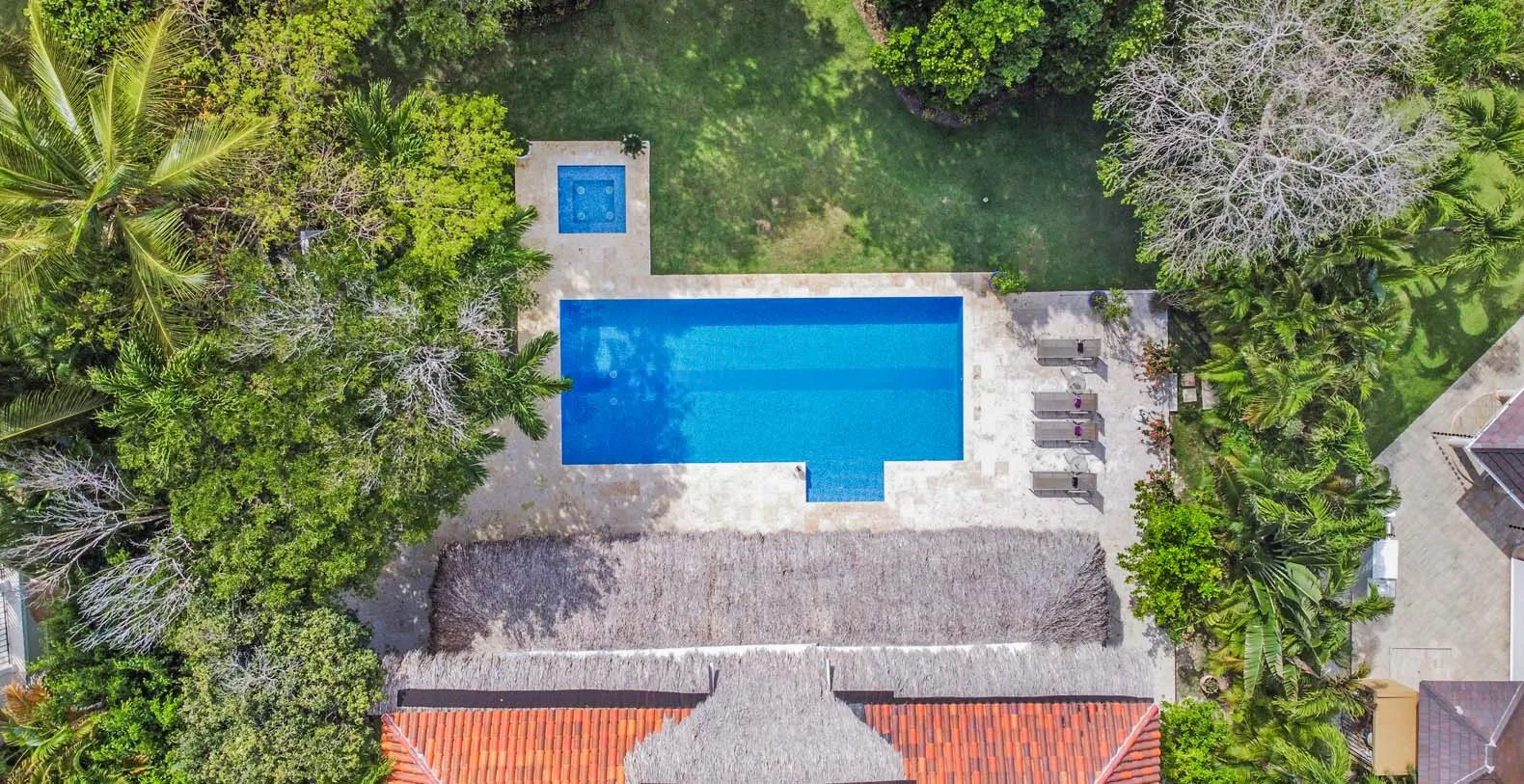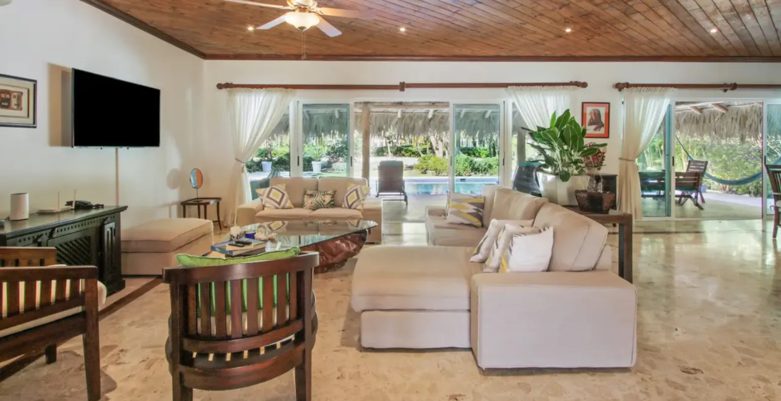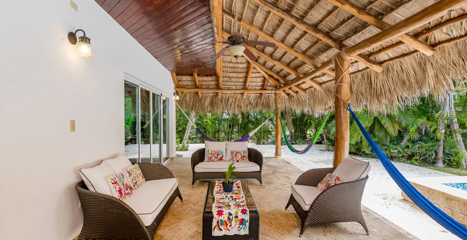 Outdoor living is at the heart of Villa Los Ensueños. The expansive covered terrace is shaded by a traditional Cana palm leaf roof, keeping the space naturally cool throughout the day. This inviting area is perfect for al fresco dining, lounging with friends and family, or unwinding in one of the hammocks while overlooking the garden. The newly refurbished swimming pool offers a refreshing escape, while the adjacent jacuzzi invites you to relax in bubbling comfort after a day at the beach or on the golf course.